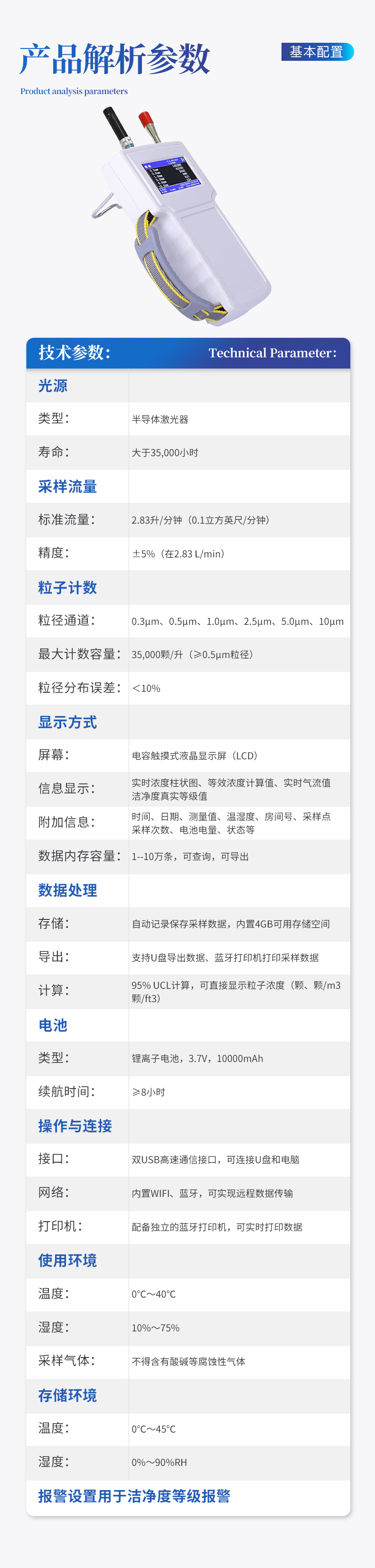 計(jì)算:95% UCL計(jì)算,可直接顯示粒子濃度(顆、顆/m3、顆/ft3)