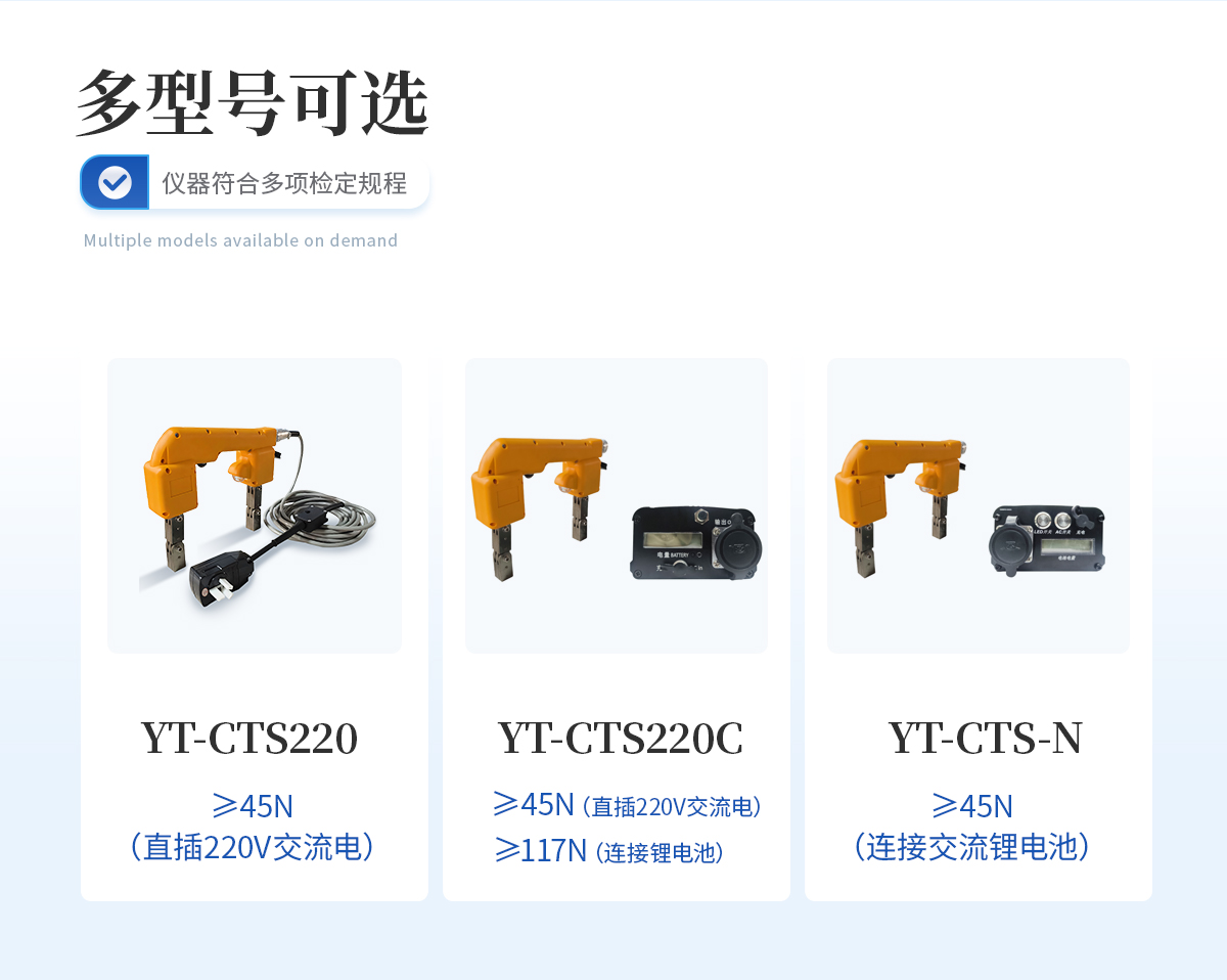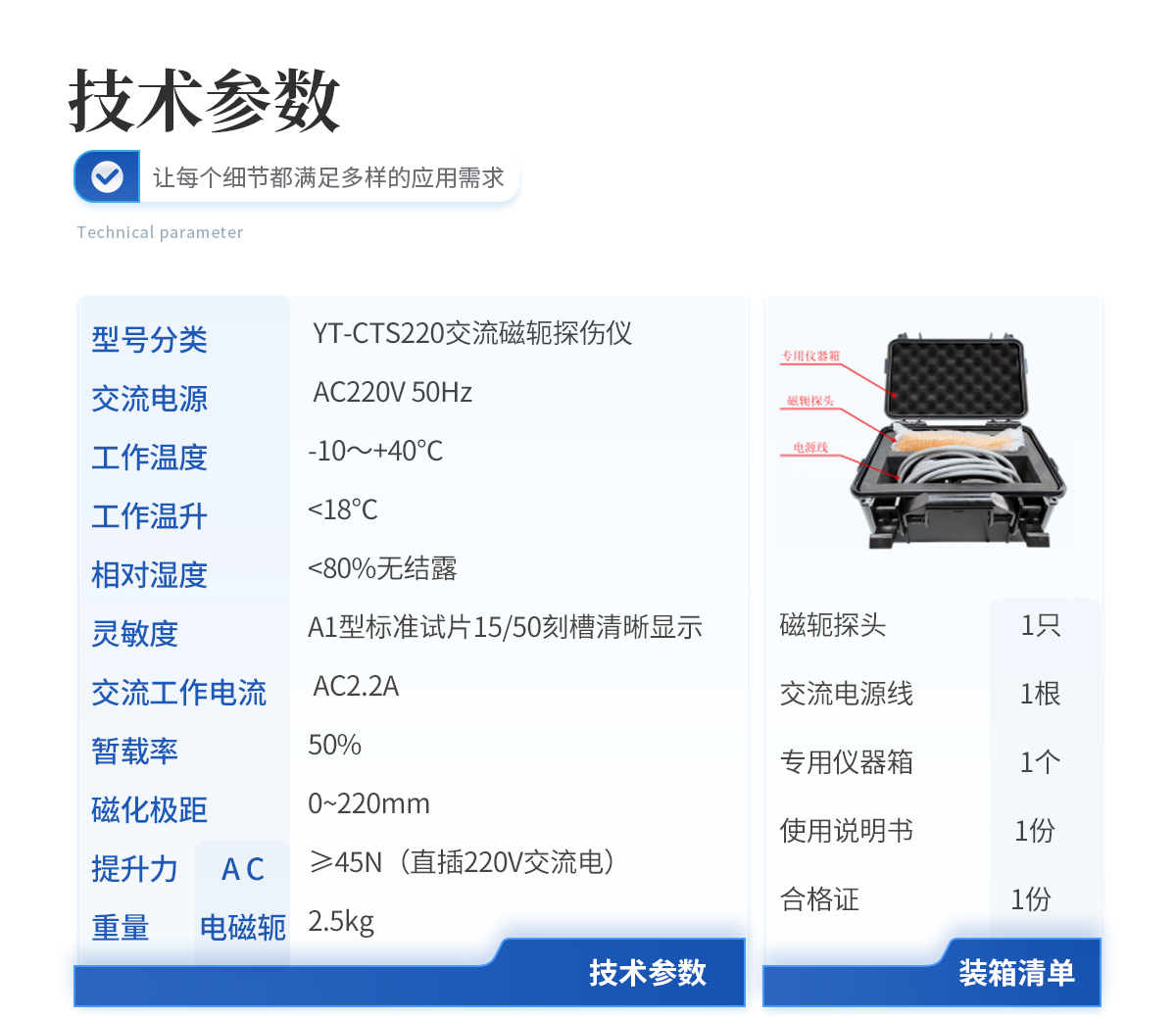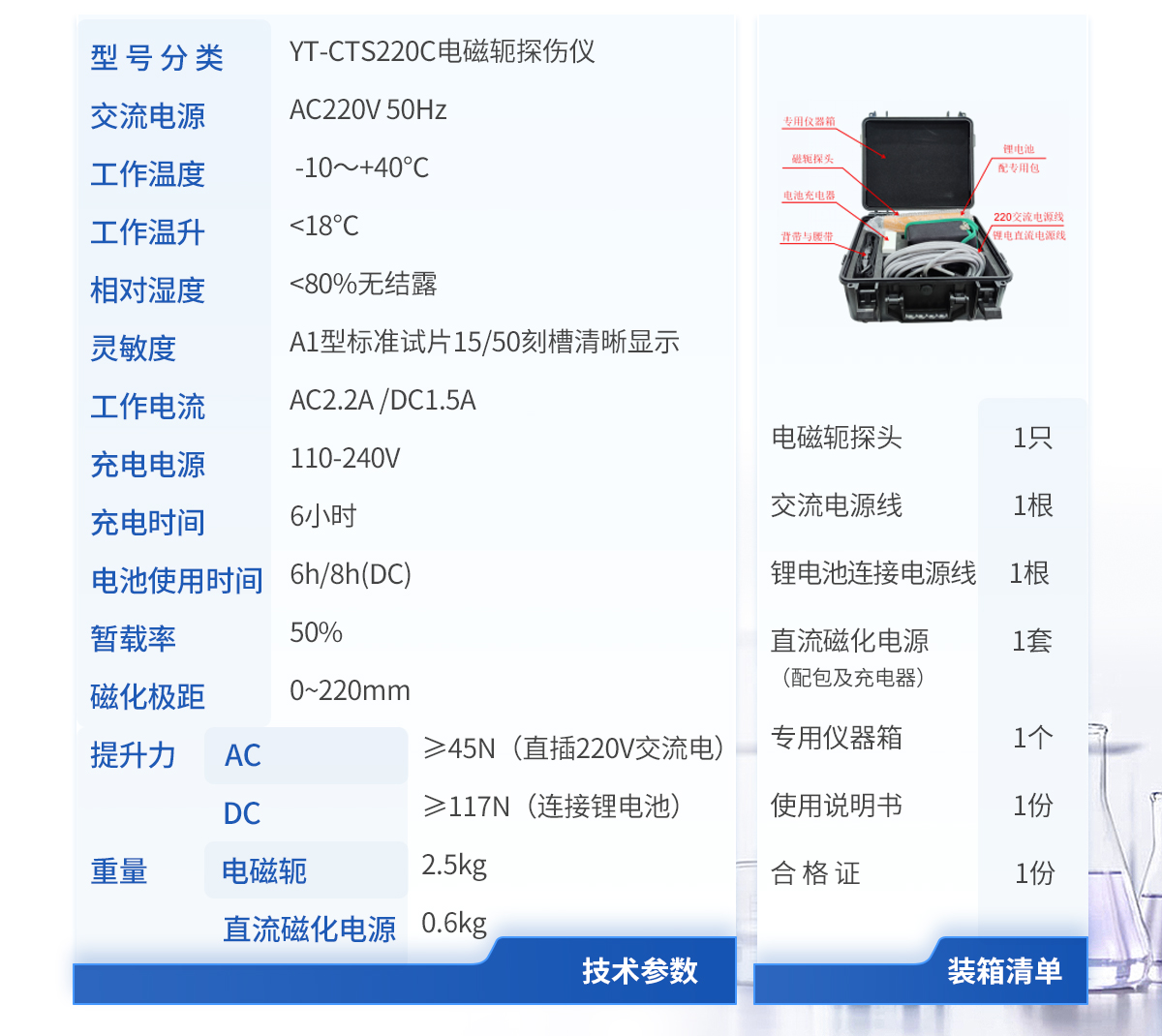 YT-CTS220C型電磁軛磁粉探傷儀,無主機設計,操作簡單方便,噪音小、重量輕、工作穩定。配直流磁化電源(鋰電),具有交流與直流磁化功能,適用于野外無電源現場操作以及高壓不能進入的容器、橋梁、管道等現場操作,一次充電連續工作時間可達6小時以上。交流供電電源采用~220V電源直接輸入,無需其他儀器配套,操作方便、簡單、重量輕、便于攜帶,因而該儀器得到廣泛使用。