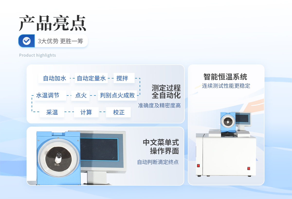 1、采用單片機系統來控制儀器,實現啟動后自動加水、自動定量水、攪拌、水溫調節,點火、判別點火成敗、采溫、計算、校正 。2、裝氧彈外,實現測定過程全自動化,無人為誤差,準確度及精密度高。3、中文菜單式操作界面,在中文大屏幕液晶提示下,用戶裝好氧彈即可完成實驗過程。4、根據用戶需要可加備USB插口,和windowsXP操作系統,即可實現微機控制。5、智能恒溫系統,連續測試性能更穩定、故障率低、系統常數和實驗結果可長時保存并且關機后不丟失等特點。
