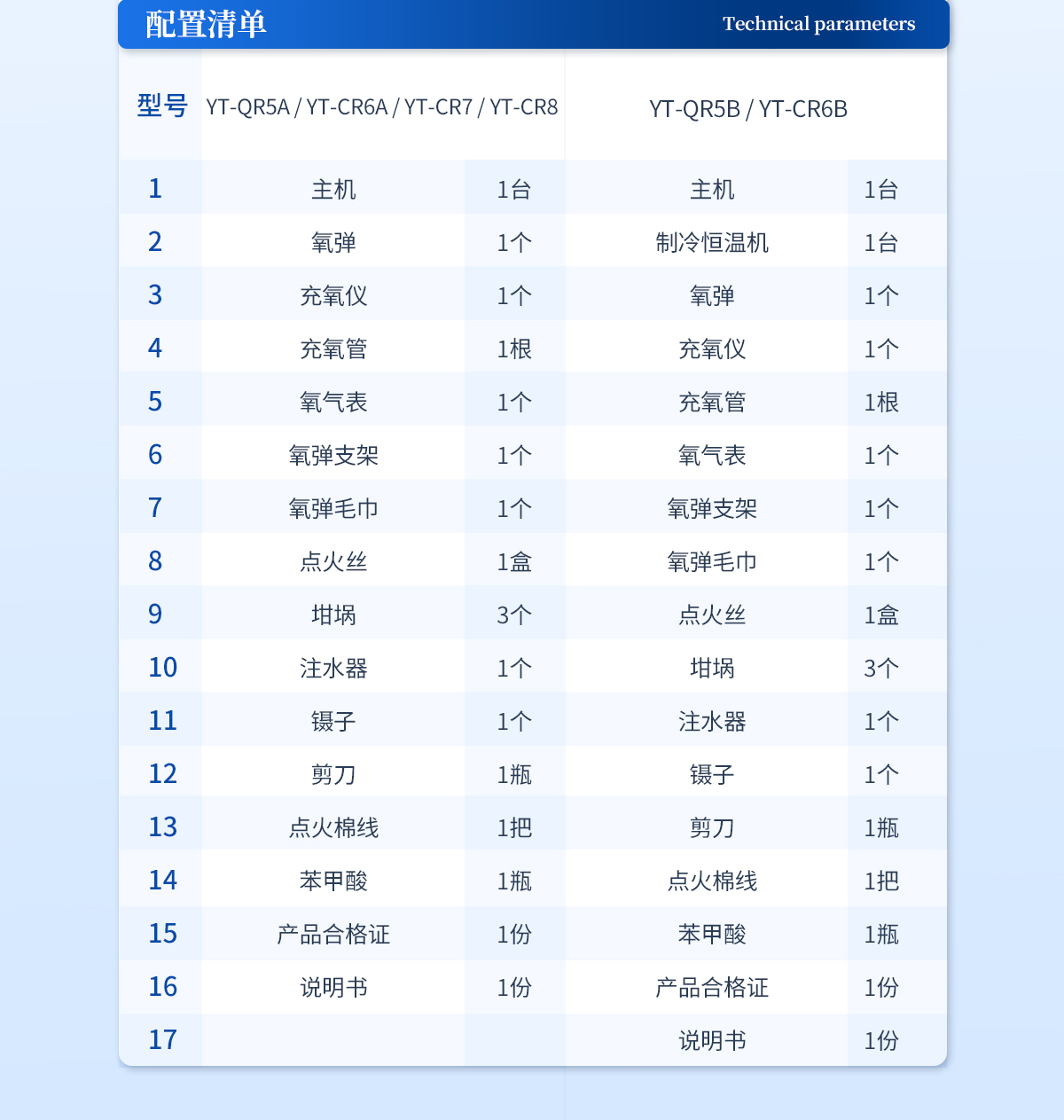 主機 1臺制冷恒溫機 1臺氧彈 1個充氧儀 1個充氧管 1根氧氣表 1個氧彈支架 1個氧彈毛巾 1個點火絲 1盒坩堝 3個注水器 1個鑷子 1個剪刀 1瓶點火棉線 1把苯甲酸 1瓶產品合格證 1份說明書 1份