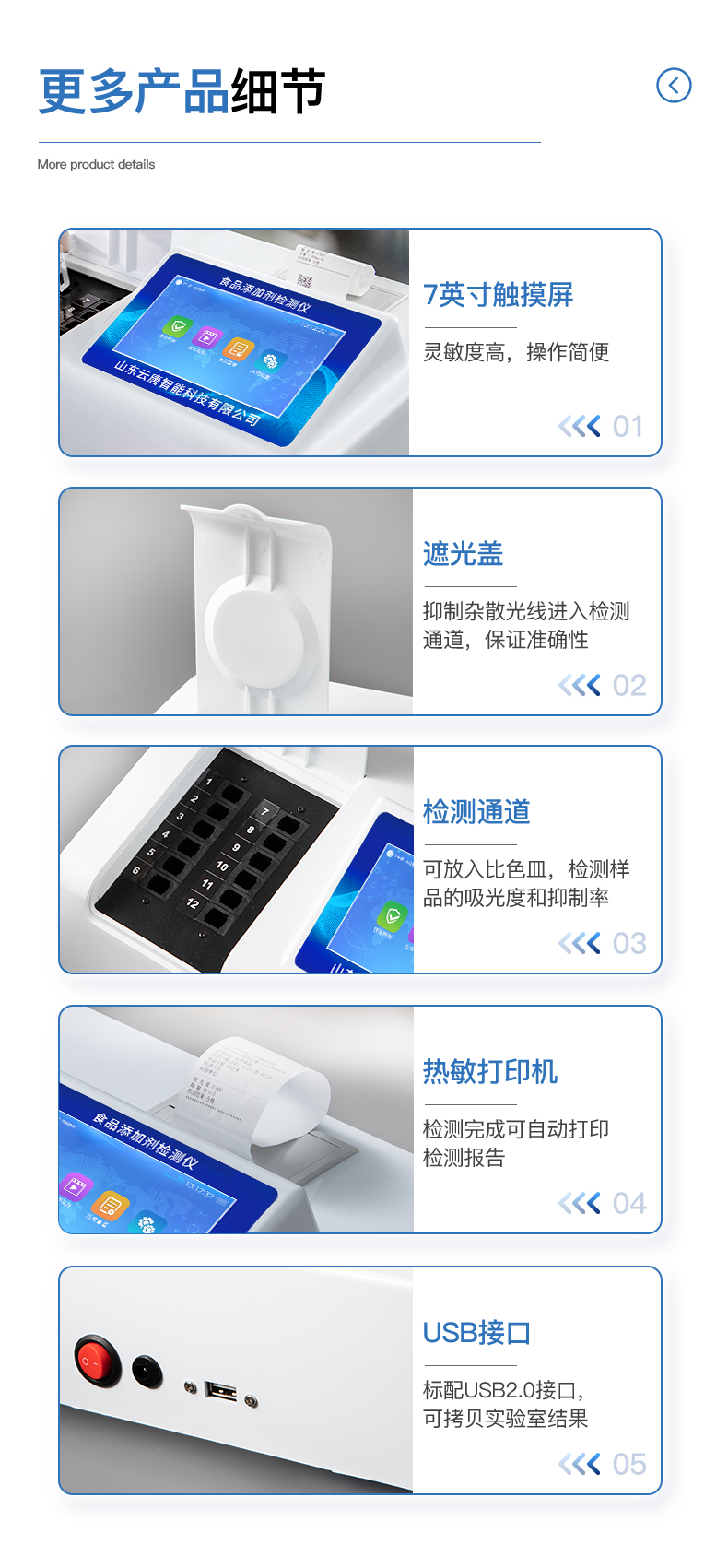 | 安卓智能操作系統,采用更加**和人性化操作,儀器具有網線連接、wifi聯網上傳、GPRS無線遠傳功能,快速上傳數據。 | 能夠在同一軟件下實現所有檢測項目的檢測,并可通過同一窗口直觀顯示檢測結果。 | 智能化程度高,儀器具有自檢功能:具有開機自檢和調零功能,具有自動檢測重復性功能。 | 檢測通道:≥12個檢測通道,可以同時測試多個樣品,每個樣品由程序控制分別獨立工作,不會互相干擾。 | 顯示方式:≥7英寸液晶觸摸屏顯示,人性化中文操作界面,讀數直觀、簡單。 | 配備新一代嵌入式熱敏打印機,可選擇手動打印或者自動打印,檢測完成可自動打印檢測報告和二維碼。 | 光源采用進口超高亮發光二極管,高精度、穩定性強、光源可控、可以關掉不使用的光源,功耗更低。 | 采用USB2.0接口設計,方便數據的存貯和移動,并可隨時與計算機直接相連,并且可用計算機控制儀器。實現數據查詢、瀏覽、分析、統計、打印 |