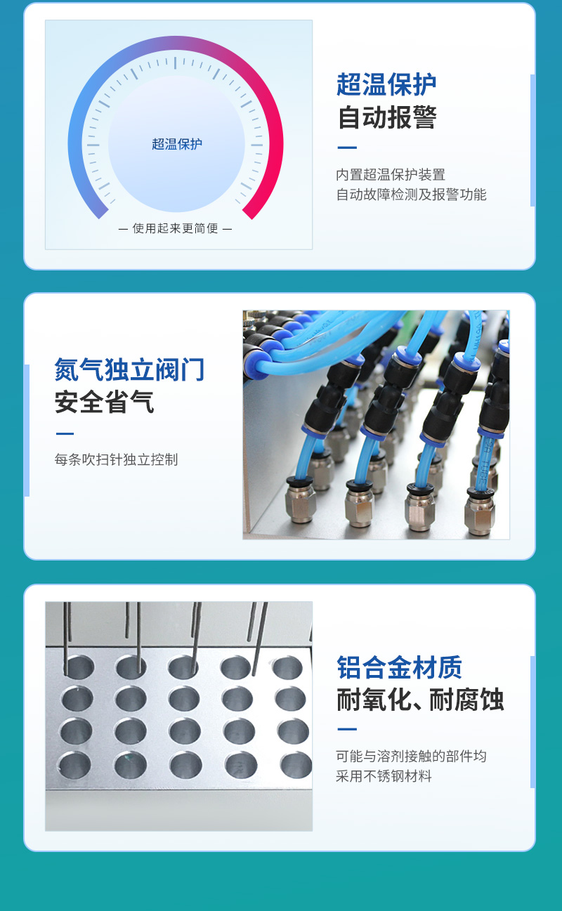 | 每個吹針都可以獨立控制,避免引起交叉污染。 | 儀器氣腔高度可以自行調節,配備標準氣針長度為15厘米。 | 氮吹儀有36個氣道控制開關,節約氣體,每根吹氣針的位置可獨立改變吹掃位置,使之適用不同的樣品容器及不同的樣品位置 | 在濃縮有毒溶劑時,整個系統可置于通風柜中,降低危險。 | 內置超溫保護裝置,自動故障檢測及報警功能,方便實用。 | 儀器有LED顯示屏,溫度同步顯示、時間遞減顯示,可時時觀察溫度變化。 | 具有整體溫度更均勻,加熱速度快 | 本產品還可以作為普通的干式恒溫器使用 | 使用起來更簡便,而且溫度也可以達到150℃,可以更好濃縮樣品 |