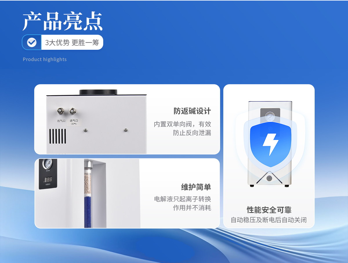 1. 壓力、流量自動顯示,自動恒壓、恒流,氮氣流量可根據用量實現全自動調節。 2. 不銹鋼過濾器,儀器內部采用硅橡膠圈(含硫量低),有效提高氣體質量,保證色譜基線平穩。 3. 配有安全裝置,靈敏可靠,自動防返堿。