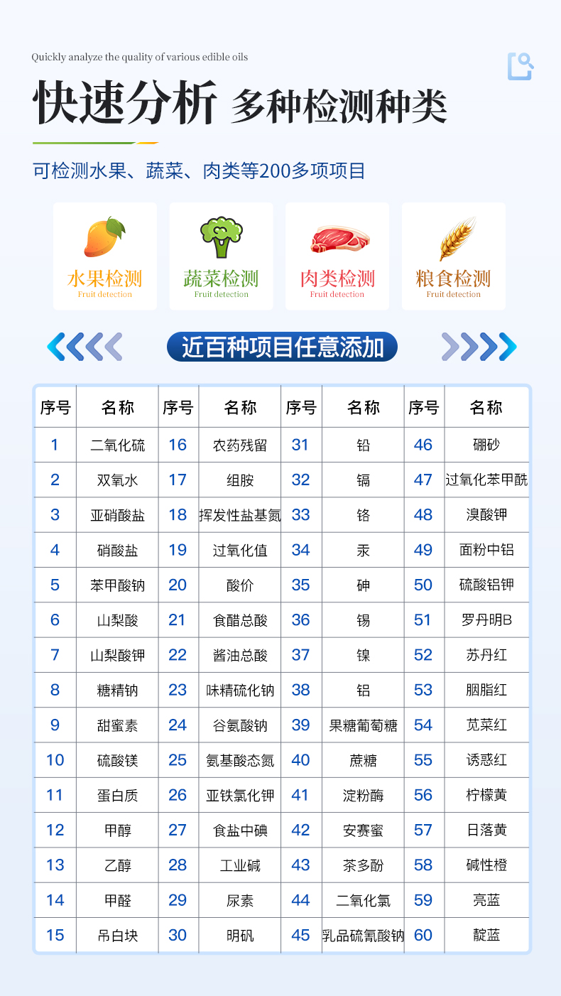 1、儀器采用臺式一體化系統檢測技術,將分光光度模塊、數字化管理模塊、無線通訊模塊高度集成于一體,支持檢測幾十種食品安全檢測項目,同時預留升級檢測方法。