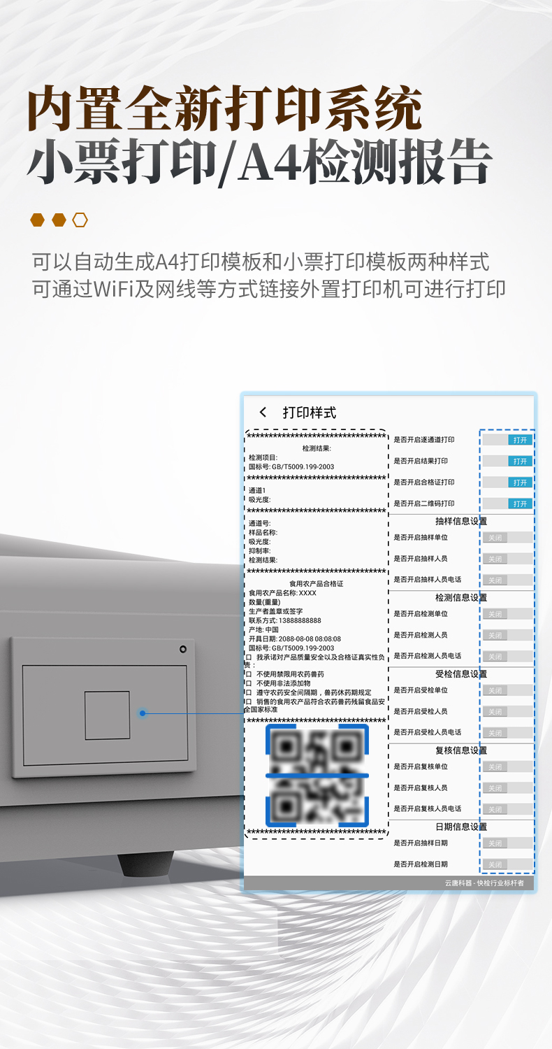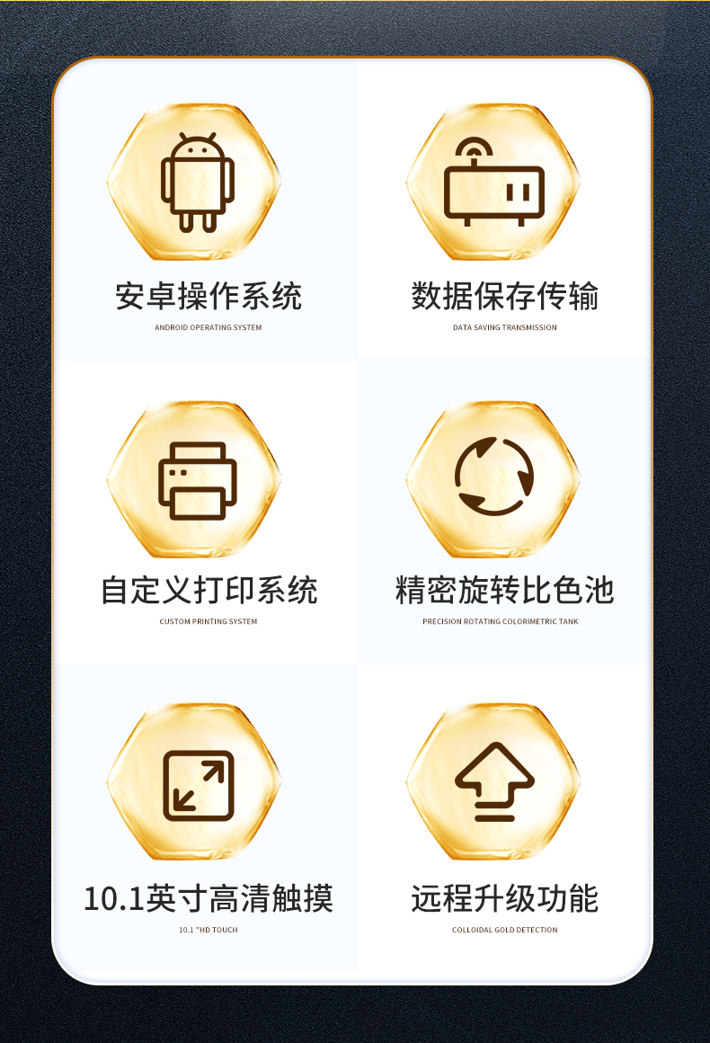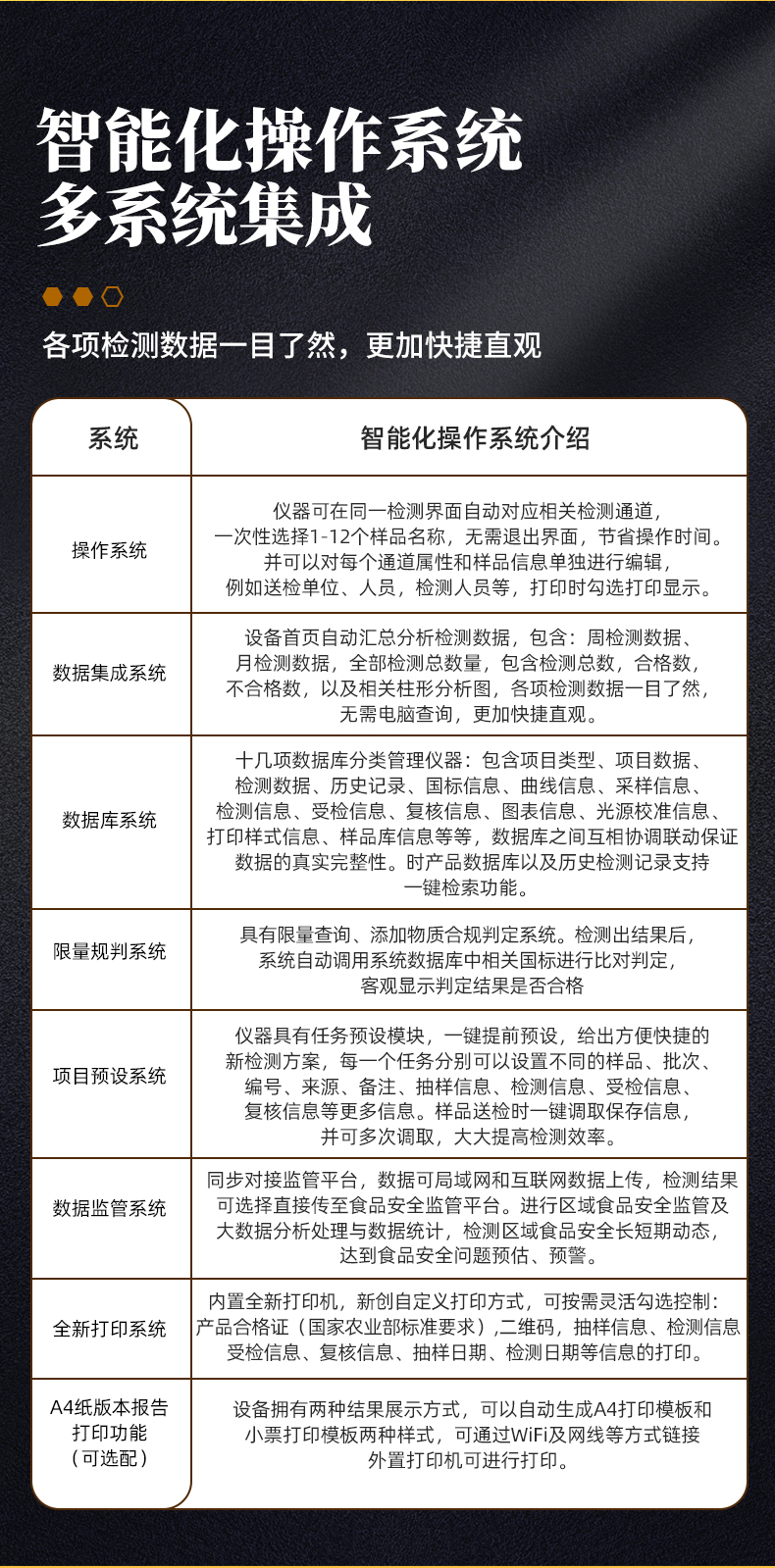 | 儀器采用臺式一體化系統檢測技術,將分光光度模塊、膠體金檢測模塊、新型農殘檢測模塊、數字化管理模塊、無線通訊模塊高度集成于一體,支持檢測200種食品安全檢測項目,同時預留升級檢測方法。 | 儀器檢測模塊標準化、智能化,檢測項目可隨意自由組合。檢測箱體內置多個標準檢測單元,檢測模塊可以調整配置。 | 顯示屏幕:儀器采用10.1英寸豎向液晶觸摸屏顯,搭配運行安卓智能操作系統,主控芯片采用ARM Cortex-A7,RK3288/4核處理器,主頻1.88Ghz,操作方便,性能更強。 | 檢測通道:≥12通道;采用精密旋轉比色池設計,使用同芯片同光源校準精度,解決不同光源之間的誤差值,更加準確**。(1-12通道間誤差0.1%,***:**202022821055.2) | 儀器光源:高精度進口四波長冷光源,每個通道均配置 410、520、590、630nm 波長光源,標配**的光路切換裝置,專利光路切換功能可實現64波長,并且所有檢測項目可實現所有通道同時檢測。 | 設備可一鍵校準,自動保存校準數據,自動對比校驗,得到精準光源,采用Android SP存儲數據,光源數據永不丟失,方便每一次使用。 | 通訊接口:配備無線通信模塊、4G(APN)通訊模塊、藍牙傳輸,同時具有雙USB接口以及RJ45網線接口,可以多方式實現數據保存及數據傳輸 | 存儲方式:支持U盤存儲,標準USB接口,免驅動安裝。檢測結果存儲容量20萬條以上,可生成Excel表格進行拷貝,并具有登錄保護功能。 | 智能化操作系統: | 1)操作系統:儀器可在同一檢測界面自動對應相關檢測通道,一次性選擇1-12個樣品名稱,無需退出界面,節省操作時間。并可以對每個通道屬性和樣品信息單獨進行編輯,例如送檢單位、人員,檢測人員等,打印時勾選打印顯示。 | 2)數據集成系統:設備首頁自動匯總分析檢測數據,包含:周檢測數據、月檢測數據,全部檢測總數量,均包含檢測總數,合格數,不合格數,以及相關柱形分析圖,各項檢測數據一目了然,無需電腦查詢,更加快捷直觀。 | 3)數據庫系統:十幾項數據庫分類管理儀器:包含項目類型、項目數據、檢測數據、歷史記錄、國標信息、曲線信息、采樣信息、檢測信息、受檢信息、復核信息、圖表信息、光源校準信息、打印樣式信息、樣品庫信息等等,數據庫之間互相協調聯動保證數據的真實完整性。同時產品數據庫以及歷史檢測記錄支持一鍵檢索功能。 | 4)限量規判系統:具有限量查詢、添加物質合規判定系統。檢測出結果后,系統自動調用系統數據庫中相關國標進行比對判定,客觀顯示判定結果是否合格。 | 5)項目預設系統:儀器具有任務預設模塊,一鍵提前預設,給出方便快捷的新檢測方案,每一個任務分別可以設置不同的樣品、批次、編號、來源、備注、抽樣信息、檢測信息、受檢信息、復核信息等更多信息。樣品送檢時一鍵調取保存信息,并可多次調取,大大提高檢測效率。 | 6)數據監管系統:同步對接監管平臺,數據可局域網和互聯網數據上傳,檢測結果可選擇直接傳至食品安全監管平臺。進行區域食品安全監管及大數據分析處理與數據統計,檢測區域食品安全長短期動態,達到食品安全問題預估、預警。 | 7)1.全新打印系統:內置全新打印機,新創自定義打印方式,可按需靈活勾選控制:產品合格證(國家農業部標準要求),二維碼,抽樣信息、檢測信息,受檢信息、復核信息、抽樣日期、檢測日期等信息的打印。 2.A4紙版本報告打印功能(可選配):設備擁有兩種結果展示方式,可以自動生成A4打印模板和小票打印模板兩種樣式,可通過WiFi及網線等方式鏈接外置打印機可進行打印。 | 供電模式:儀器交直流兩用,直流12V供電,可連接車載電源,可配6ah大容量充電鋰電池,電量可實時顯示,方便戶外流動測試。 | 膠體金檢測模塊:采用雙通道CMOS成像處理技術及膠體金免疫層析技術,可同時讀取雙膠體金卡數據,自動采集、處理分析,將檢測結果顯示,并可根據參考限值自動判斷檢測結果,可檢測常見的獸藥殘留、生物毒素、抗生素、違禁添加物等。 | 1)探測技術:CMOS成像探測; | 2)檢測通道:1個通道; | 3)檢測方式:消線法和比色法; | 4)顯示模式:陰性或陽性; | 5)曲線形式:直插式掃描方式,顯示金標卡圖像,實時生成、識別CT曲線圖,無需手動調整,完成檢測后自動退出檢測卡。兼容市場上其他金標卡,使用耗材不受限制。 | 儀器具備遠程升級功能,可定向分客戶分儀器更新,開機后自動更新,并可持續性免費更新系統版本,無需像傳統產品返廠更新,節省時間及人力成本并避免了物流運輸返廠升級導致設備損壞的潛在風險。 |