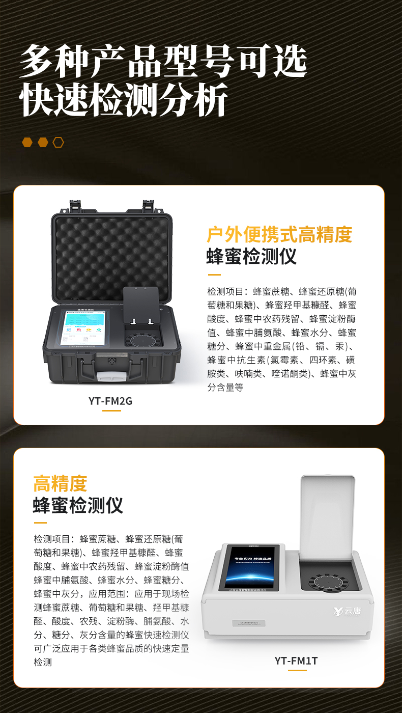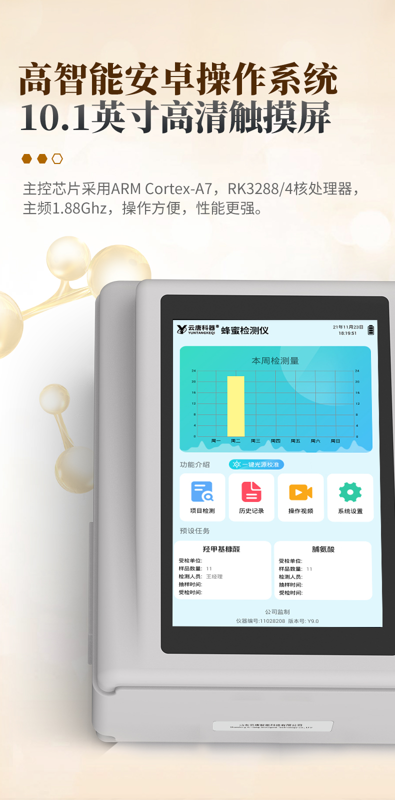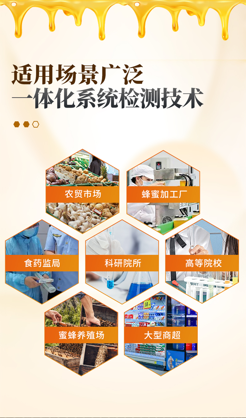 蜂蜜蔗糖、蜂蜜還原糖(葡萄糖和果糖)、蜂蜜羥甲基糠醛、蜂蜜酸度、蜂蜜中農藥殘留、蜂蜜淀粉酶值、蜂蜜中脯氨酸、蜂蜜水分、蜂蜜糖分、蜂蜜中重金屬(鉛、鎘、汞)、蜂蜜中抗生素(氯霉素、四環素、磺胺類、呋喃類、喹諾酮類)、蜂蜜中灰分,應用范圍:應用于現場檢測蜂蜜蔗糖、葡萄糖和果糖、羥甲基糠醛、酸度、農殘、淀粉酶、脯氨酸、水分、糖分、重金屬、抗生素、灰分含量的蜂蜜快速檢測儀,可廣泛應用于各類蜂蜜品質的快速定量檢測。