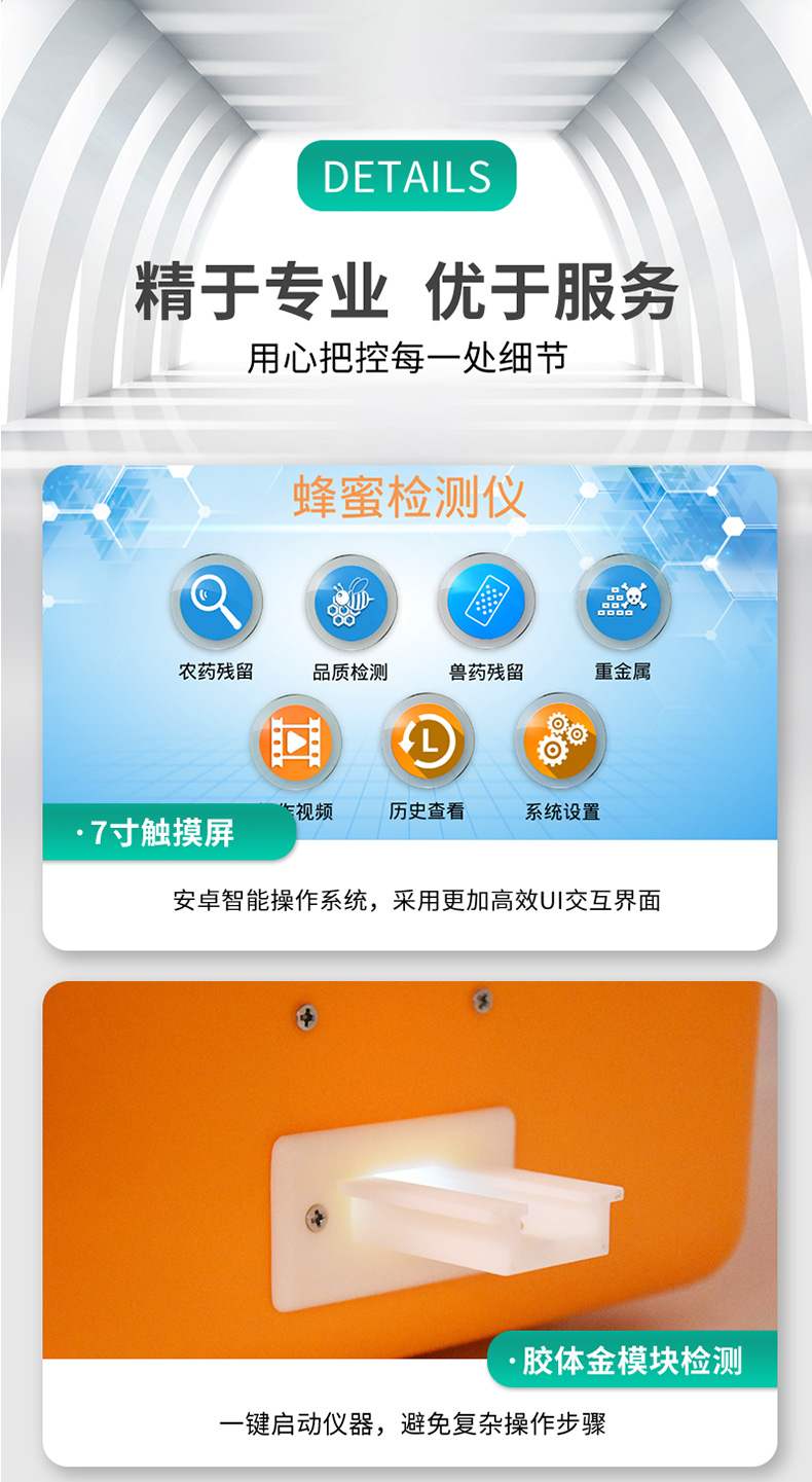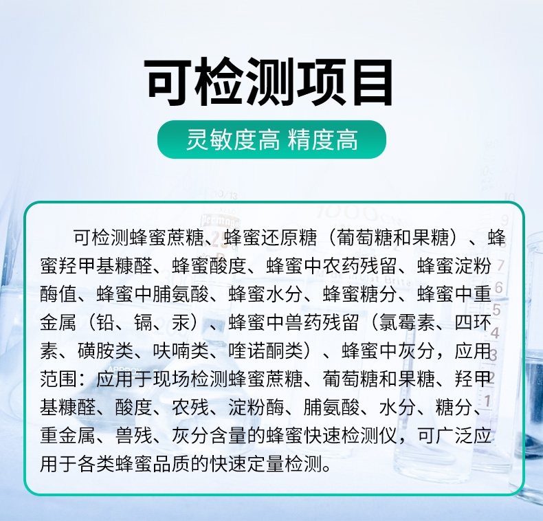 檢測(cè)項(xiàng)目:蜂蜜蔗糖、蜂蜜還原糖(葡萄糖和果糖)、蜂蜜羥甲基糠醛、蜂蜜酸度、蜂蜜中農(nóng)藥殘留、蜂蜜淀粉酶值、蜂蜜中脯氨酸、蜂蜜水分、蜂蜜糖分、蜂蜜中重金屬(鉛、鎘、汞)、蜂蜜中抗生素(氯霉素、四環(huán)素、磺胺類、呋喃類、喹諾酮類)、蜂蜜中灰分,可廣泛應(yīng)用于各類蜂蜜品質(zhì)的快速定量檢測(cè)。