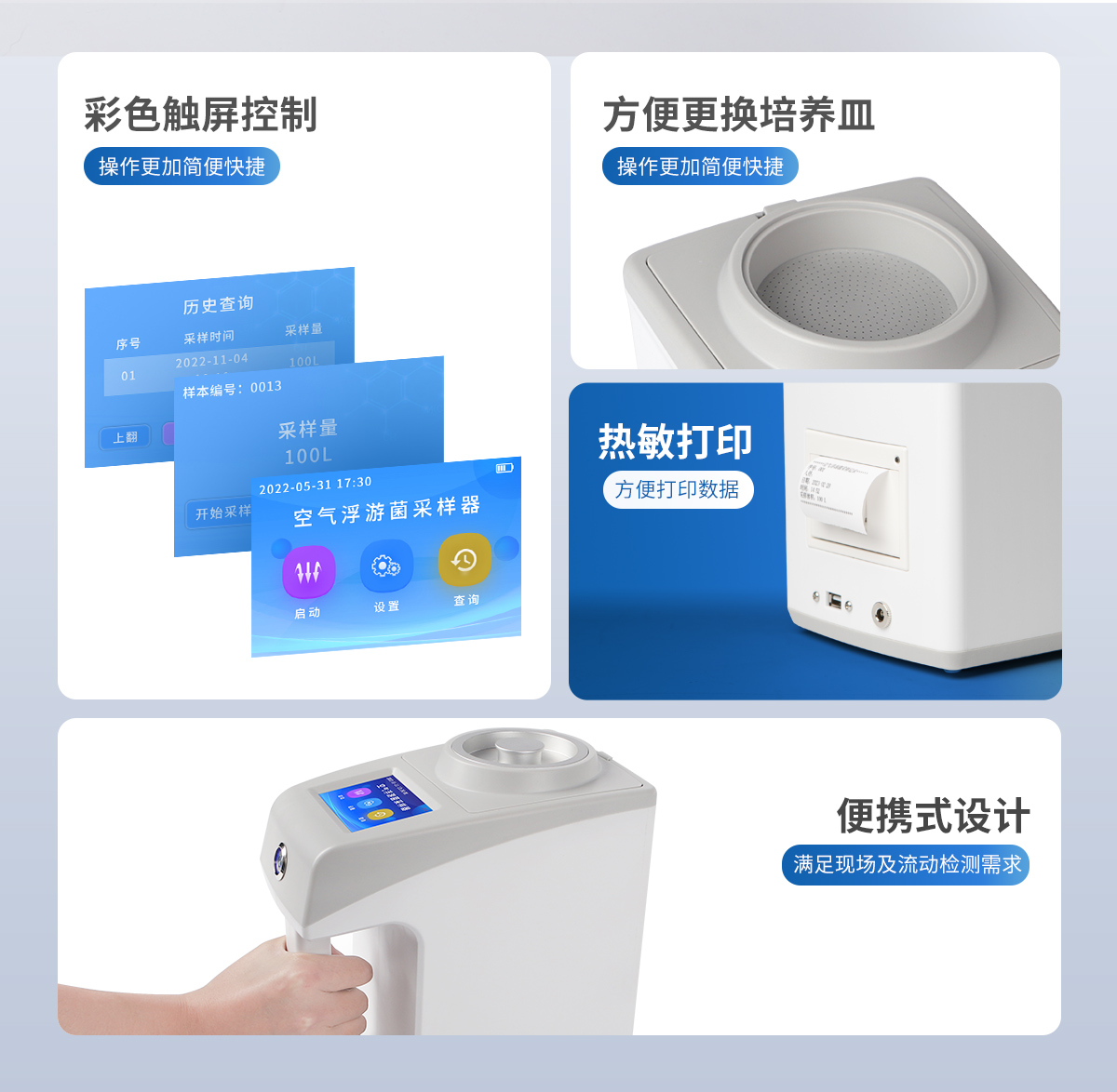 ●新型手持式外觀,美觀大方,使用方便。 ●彩色觸屏控制,操作更加**快捷。 ●LCD顯示采樣量,采樣時(shí)間等參數(shù)。 ●可將采樣量,采樣時(shí)間等參數(shù)按組儲存。 ●更換培養(yǎng)皿簡便,拿下采樣口即可更換培養(yǎng)皿。 ●帶熱敏打印機(jī),方便打印數(shù)據(jù)。 ●帶上位機(jī)軟件,數(shù)據(jù)可導(dǎo)出電腦,方便歷史分析。 ●交直流兩用,內(nèi)置6000mAh大容量鋰電池,可連續(xù)采樣8小時(shí)。 ●程序支持中文或英文。