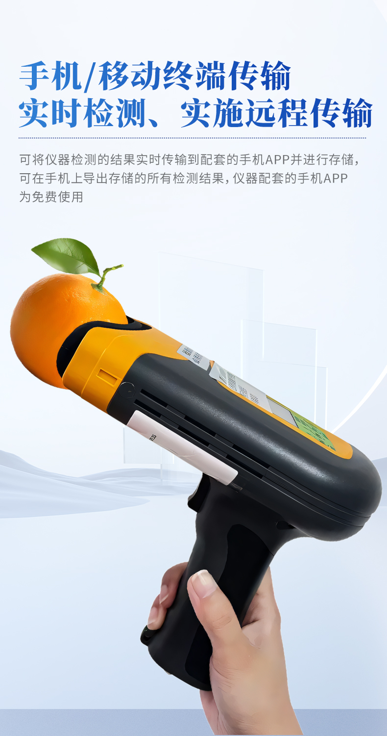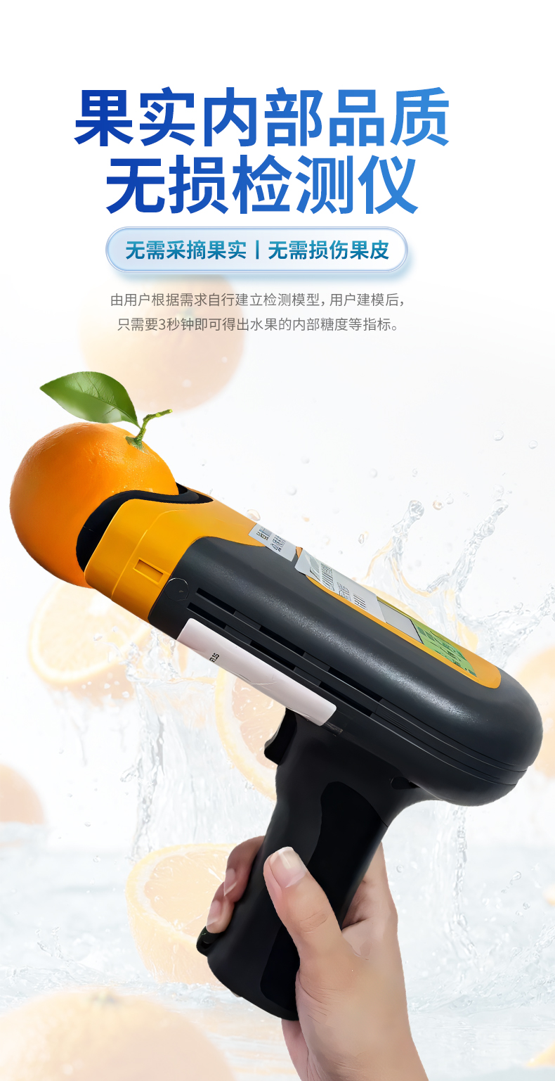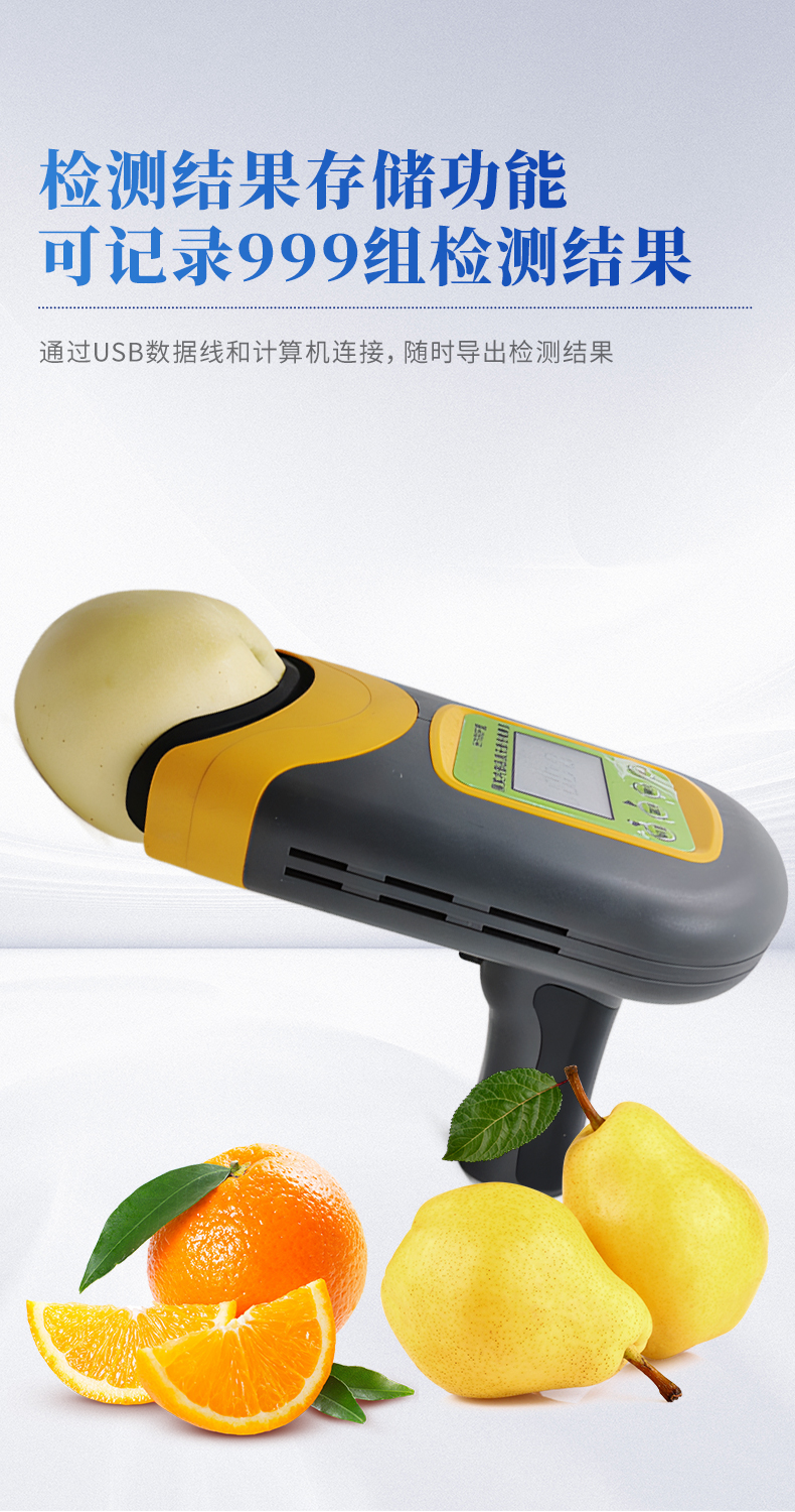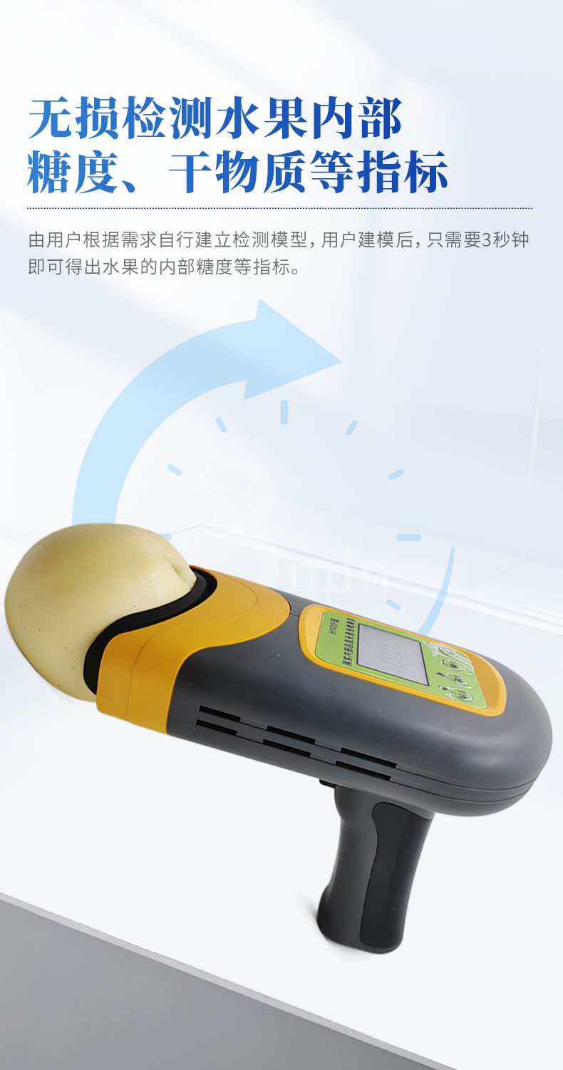 果實內部品質無損檢測儀是一款便攜式的果實質量檢測儀,可以方便的檢測水果內部的糖度、干物質等指標,由用戶根據需求自行建立檢測模型,用戶建模后,只需要3秒鐘即可得出水果的內部糖度等指標。儀器內置可充電鋰電池,單次充滿后可連續檢測2000次,檢測結果實時顯示在設備屏幕上,用戶可以通過數據線將檢測數據上傳到電腦中。