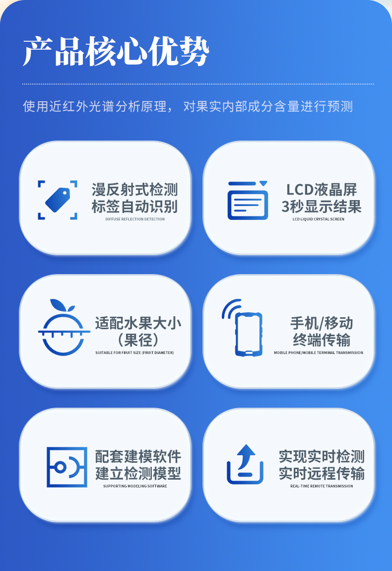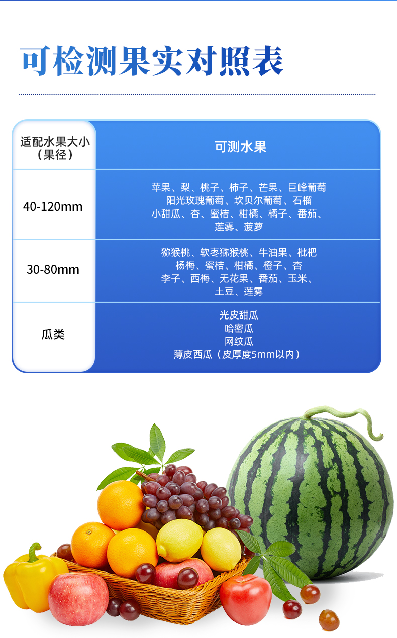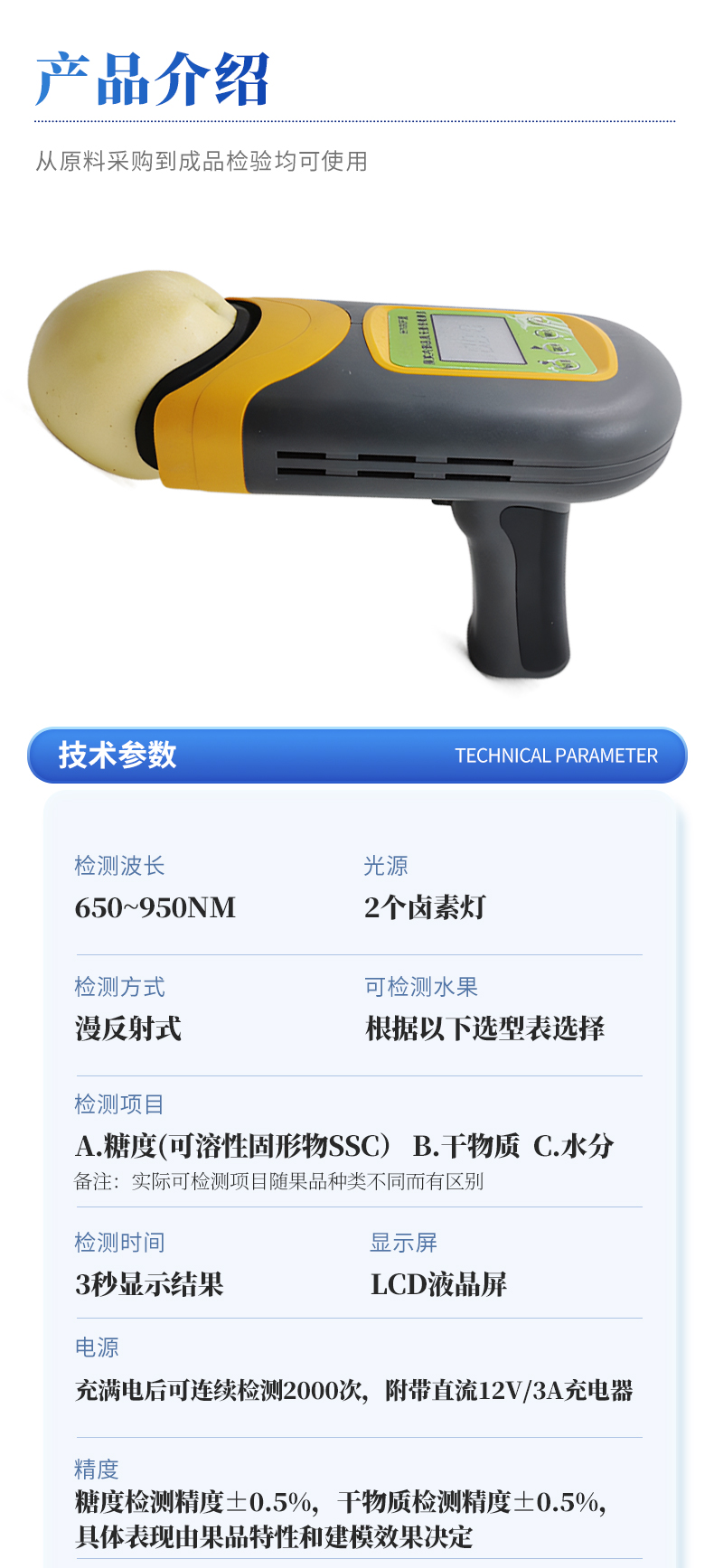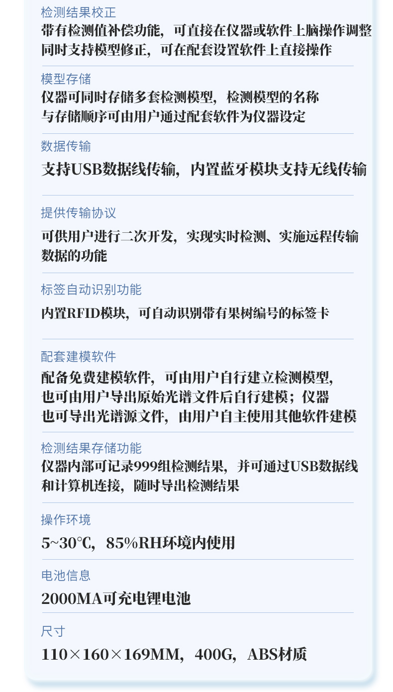 | 1.檢測波長:650~950nm; | 2.光源:2個鹵素燈; | 3.檢測方式:漫反射式; | 4.可檢測水果:根據以下選型表選擇 | 5.適配水果大小(果徑):H100F型(40-120mm),H100C型(30-80mm),H100M型(瓜類) | 6.檢測項目: a.糖度(可溶性固形物SSC) b.干物質 c.水分 備注:實際可檢測項目隨果品種類不同而有區別 | 7.檢測時間:3秒顯示結果; | 8.電源:充滿電后可連續檢測2000次,附帶直流12V/3A充電器; | 9.精度:糖度檢測精度±0.5%,干物質檢測精度±0.5%,具體表現由果品特性和建模效果決定; | 10.檢測結果校正:帶有檢測值補償功能,可直接在儀器或軟件上腦操作調整;同時支持模型修正,可在配套設置軟件上直接操作; | 11.模型存儲:儀器可同時存儲多套檢測模型,檢測模型的名稱與存儲順序可由用戶通過配套軟件為儀器設定; | 12.數據傳輸:支持USB數據線傳輸,內置藍牙模塊支持無線傳輸; | 13.手機/移動終端傳輸功能:可將儀器檢測的結果實時傳輸到配套的手機APP并進行存儲,可在手機上導出存儲的所有檢測結果,儀器配套的手機APP為免費使用; | 14.提供傳輸協議,可供用戶進行二次開發,實現實時檢測、實施遠程傳輸數據的功能; | 15.標簽自動識別功能:內置RFID模塊,可自動識別帶有果樹編號的標簽卡; | 16.支持光譜信息存儲和導出; | 17.配套建模軟件:配備免費建模軟件,可由用戶自行建立檢測模型,也可由用戶導出原始光譜文件后自行建模;儀器也可導出光譜源文件,由用戶自主使用其他軟件建模; | 18.檢測結果存儲功能:儀器內部可記錄999組檢測結果,并可通過USB數據線和計算機連接,隨時導出檢測結果; | 19.操作環境:5~30℃,85%RH環境內使用 | 20.顯示屏:LCD液晶屏 | 21.電池信息:2000mA可充電鋰電池 | 22.尺寸:110×160×169mm,400g,ABS材質 | 23.附件:橡膠遮光罩,充電器,USB數據線,便攜箱,軟件(免費電子版) |
