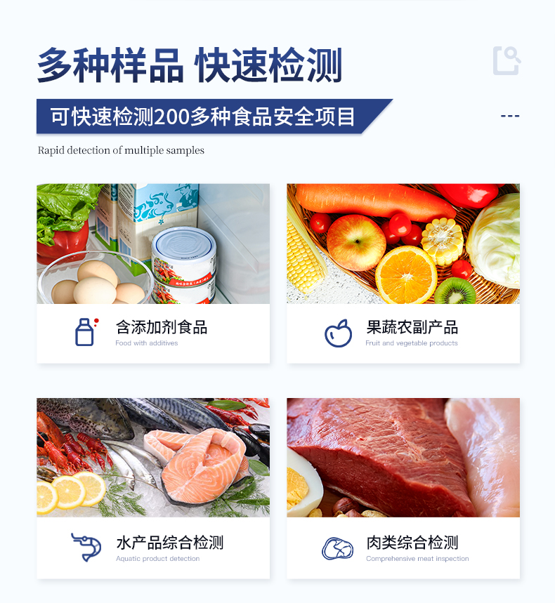 9、儀器具有多品類多種類樣品菜單庫,可靈活選擇檢測樣品,不同的檢測通道可同時(shí)檢測不同的樣品項(xiàng)目。也可在儀器上直接編輯錄入樣品名稱、檢測指標(biāo)、送檢單位等信息并保存進(jìn)樣品數(shù)據(jù)庫。