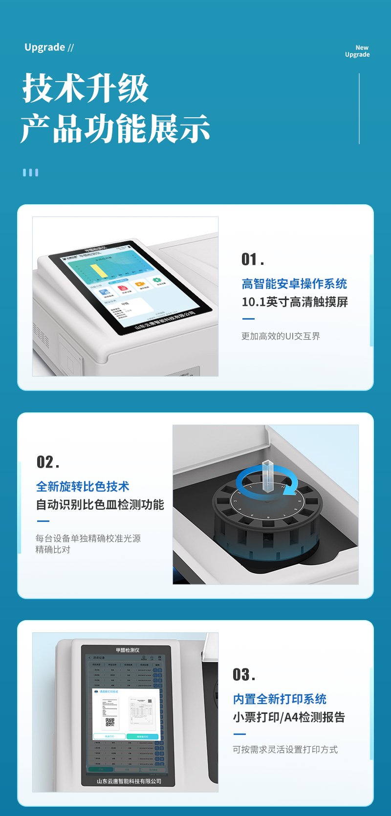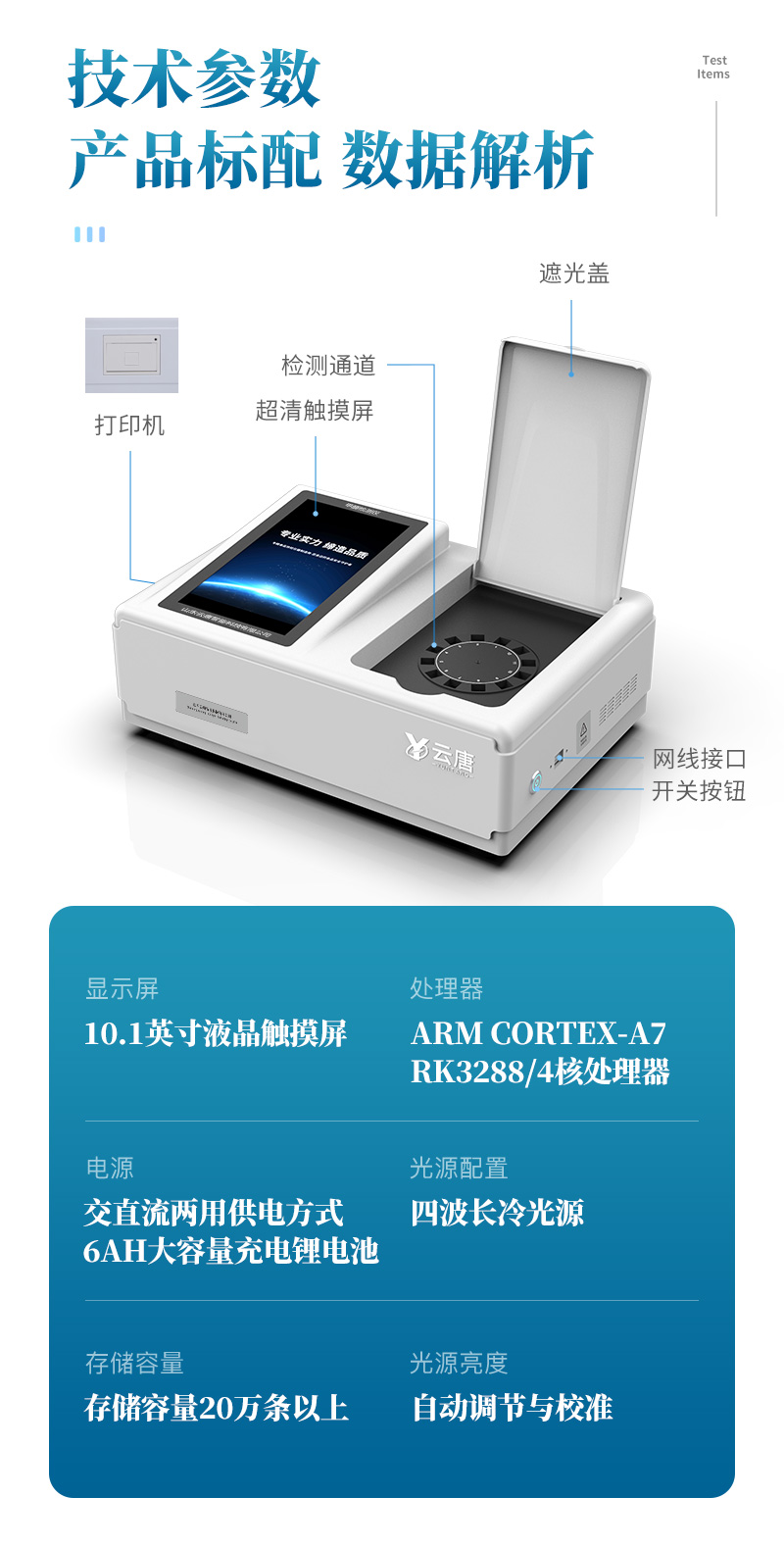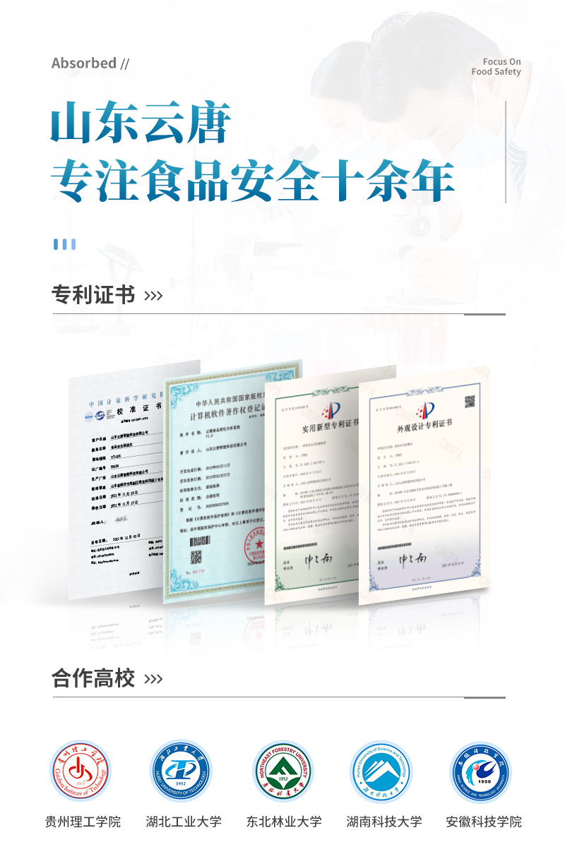 | 儀器采用臺式一體化系統(tǒng)檢測技術,將分光光度模塊、膠體金檢測模塊、新型農(nóng)殘檢測模塊、數(shù)字化管理模塊、無線通訊模塊高度集成于一體,支持檢測200種食品安全檢測項目,同時預留升級檢測方法。 | 儀器檢測模塊標準化、智能化,檢測項目可隨意自由組合。檢測臺式體內(nèi)置多個標準檢測單元,檢測模塊可以調(diào)整配置。 | 顯示屏幕:儀器采用10.1英寸豎向液晶觸摸屏顯,搭配運行安卓智能操作系統(tǒng),主控芯片采用ARM Cortex-A7,RK3288/4核處理器,主頻1.88Ghz,操作方便,性能更強。 | 檢測通道:≥12通道;采用精密旋轉(zhuǎn)比色池設計,使用同芯片同光源校準精度,解決不同光源之間的誤差值,更加準確**。(1-12通道間誤差0.1%,***:**202022821055.2) | 儀器光源:高精度進口四波長冷光源,每個通道均配置 410、520、590、630nm 波長光源,標配**的光路切換裝置,專利光路切換功能可實現(xiàn)64波長,并且所有檢測項目可實現(xiàn)所有通道同時檢測。 | 設備可一鍵校準,自動保存校準數(shù)據(jù),自動對比校驗,得到精準光源,采用Android SP存儲數(shù)據(jù),光源數(shù)據(jù)永不丟失,方便每一次使用。 | 通訊接口:配備無線通信模塊、4G(APN)通訊模塊、藍牙傳輸,同時具有雙USB接口以及RJ45網(wǎng)線接口,可以多方式實現(xiàn)數(shù)據(jù)保存及數(shù)據(jù)傳輸。 | 存儲方式:支持U盤存儲,標準USB接口,免驅(qū)動安裝。檢測結(jié)果存儲容量20萬條以上,可生成Excel表格進行拷貝,并具有登錄保護功能。 | 操作系統(tǒng):儀器可在同一檢測界面自動對應相關檢測通道,一次性選擇1-12個樣品名稱,無需退出界面,節(jié)省操作時間。并可以對每個通道屬性和樣品信息單獨進行編輯,例如送檢單位、人員,檢測人員等,打印時勾選打印顯示。 | 數(shù)據(jù)集成系統(tǒng):設備首頁自動匯總分析檢測數(shù)據(jù),包含:周檢測數(shù)據(jù)、月檢測數(shù)據(jù),全部檢測總數(shù)量,包含檢測總數(shù),合格數(shù),不合格數(shù),以及相關柱形分析圖,各項檢測數(shù)據(jù)一目了然,無需電腦查詢,更加快捷直觀。 | 數(shù)據(jù)庫系統(tǒng):十幾項數(shù)據(jù)庫分類管理儀器:包含項目類型、項目數(shù)據(jù)、檢測數(shù)據(jù)、歷史記錄、國標信息、曲線信息、采樣信息、檢測信息、受檢信息、復核信息、圖表信息、光源校準信息、打印樣式信息、樣品庫信息等等,數(shù)據(jù)庫之間互相協(xié)調(diào)聯(lián)動保證數(shù)據(jù)的真實完整性。同時產(chǎn)品數(shù)據(jù)庫以及歷史檢測記錄支持一鍵檢索功能。 | 限量規(guī)判系統(tǒng):具有限量查詢、添加物質(zhì)合規(guī)判定系統(tǒng)。檢測出結(jié)果后,系統(tǒng)自動調(diào)用系統(tǒng)數(shù)據(jù)庫中相關國標進行比對判定,客觀顯示判定結(jié)果是否合格。 | 項目預設系統(tǒng):儀器具有任務預設模塊,一鍵提前預設,給出方便快捷的新檢測方案,每一個任務分別可以設置不同的樣品、批次、編號、來源、備注、抽樣信息、檢測信息、受檢信息、復核信息等更多信息。樣品送檢時一鍵調(diào)取保存信息,并可多次調(diào)取,大大提高檢測效率。 | 數(shù)據(jù)監(jiān)管系統(tǒng):同步對接監(jiān)管平臺,數(shù)據(jù)可局域網(wǎng)和互聯(lián)網(wǎng)數(shù)據(jù)上傳,檢測結(jié)果可直接傳至食品安全監(jiān)管平臺。進行區(qū)域食品安全監(jiān)管及大數(shù)據(jù)分析處理與數(shù)據(jù)統(tǒng)計,監(jiān)測區(qū)域食品安全長短期動態(tài)及問題預估、預警。 | 全新打印系統(tǒng):內(nèi)置全新打印機,新創(chuàng)自定義打印方式,可按需靈活勾選控制:產(chǎn)品合格證(國家農(nóng)業(yè)部標準要求),二維碼,抽樣信息、檢測信息,受檢信息、復核信息、抽樣日期、檢測日期等信息的打印。 | A4紙版本報告打印功能(可選配):設備擁有兩種結(jié)果展示方式,可以自動生成A4打印模板和小票打印模板兩種樣式,可通過WiFi及網(wǎng)線等方式鏈接外置打印機可進行打印。 | 供電模式:儀器交直流兩用,直流12V供電,可連接車載電源,配6ah大容量充電鋰電池,電量可實時顯示,方便戶外流動測試。 | 膠體金檢測模塊:采用CMOS成像處理技術及膠體金免疫層析技術,可讀取膠體金卡數(shù)據(jù),自動采集、處理分析,將檢測結(jié)果顯示,并可根據(jù)參考限值自動判斷檢測結(jié)果,可檢測常見的獸藥殘留、生物毒素、抗生素、違禁添加物等。 | 探測技術:CMOS成像探測; | 檢測通道:1個通道; | 檢測方式:消線法和比色法; | 顯示模式:陰性或陽性; | 曲線形式:軌道式掃描方式,顯示金標卡圖像,實時生成、識別CT曲線圖,無需手動調(diào)整,完成檢測后自動退出檢測卡。兼容市場上其他金標卡,使用耗材不受限制。 | 儀器具備遠程升級功能,可定向分客戶分儀器更新,開機后自動更新,并可持續(xù)性免費更新系統(tǒng)版本,無需像傳統(tǒng)產(chǎn)品返廠更新,節(jié)省時間及人力成本并避免了物流運輸返廠升級導致設備損壞的潛在風險。 |