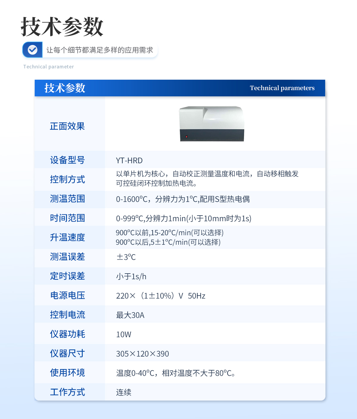 1、控制方式:以單片機為核心,自動校正測量溫度和電流,自動移相觸發可控硅閉環控制加熱電流。2、測溫范圍:0-1600oC,分辨力為1oC,配用S型熱電偶.3、時間范圍:0-999oC,分辨力1min(小于10mm時為1s)4、升溫速度:900oC以前,15-20oC/min(可以選擇).900oC以后,5±1oC/min(可以選擇)5、測溫誤差:±3oC6、定時誤差:小于1s/h7、電源電壓:220×(1±10%)V   50Hz8、控制電流:**30A9、儀器功耗:10W10儀器尺寸(mm):305×120×39011、使用環境:溫度0-40oC,相對溫度不大于80oC12、工作方式:連續