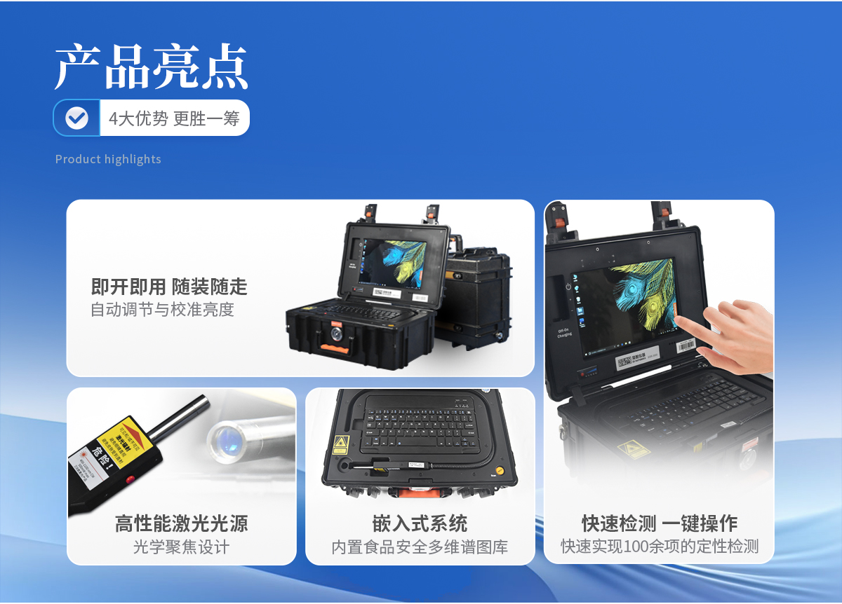 更專業(yè) 785nm光源:有效抑制熒光,適合便攜式移動應(yīng)用 超寬的光譜范圍:檢測物質(zhì)種類更多 更高的信噪比:超強(qiáng)的微小信號探測能力 優(yōu)質(zhì)激光光源:數(shù)字可調(diào)高功率輸出,窄線寬保障譜圖質(zhì)量 更便捷 光學(xué)聚焦設(shè)計:可以隔著塑料袋、玻璃瓶直接檢測 快速自穩(wěn)定光源:機(jī)器啟動無預(yù)熱時間,即開即用 超快檢測速度:一秒出結(jié)果 便攜式設(shè)計:獨(dú)立可充電電源供電,隨裝隨走,適合各種現(xiàn)場快檢 更貼合應(yīng)用 在線譜圖庫:提供各行業(yè)應(yīng)用多維譜圖庫,支持在線升級 專業(yè)分析算法:智能解譜,自動匹配,多組分分析 行業(yè)應(yīng)用軟件:提供針對行業(yè)專用軟件,支持客戶訂制