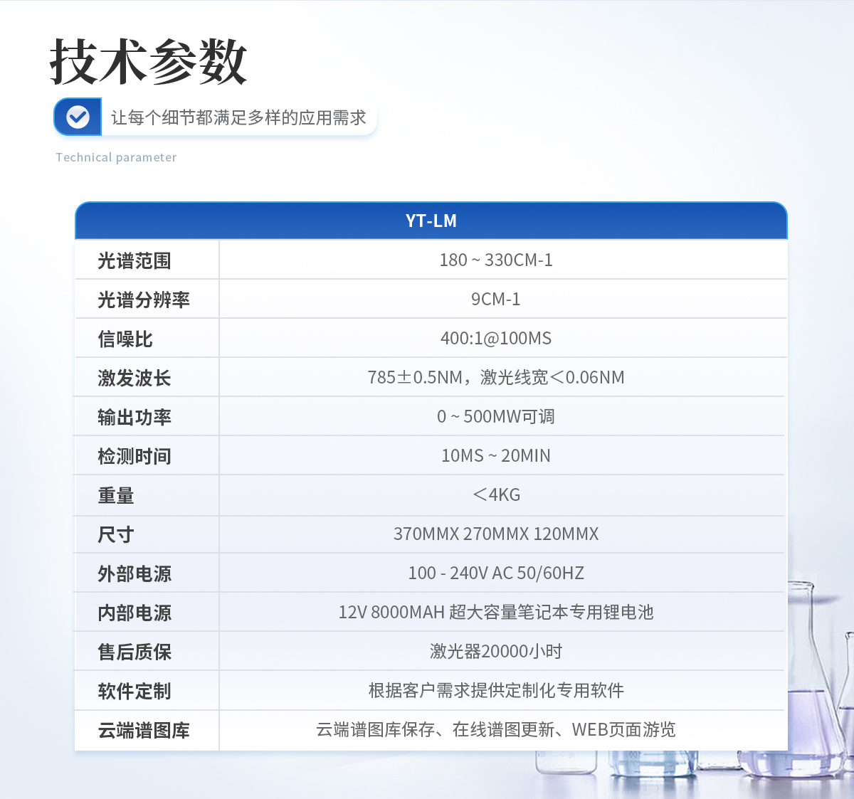 規(guī)格:YT-LM標(biāo)準(zhǔn)版 光譜范圍:180 ~ 3300cm-1 光譜分辨率:9cm-1 信噪比:400:1@100ms 激發(fā)波長:785+0.5nm,激光線寬< 0.06 nm 輸出功率:0~ 500mW可調(diào) 檢測時間:10ms ~ 20min 重量:<4kg 尺寸:370mmx 270mmx 120mm 外部電源:100-240V AC 50/60Hz 內(nèi)部電源:12V 8000mAH 超大容量筆記本專用鋰電池 售后質(zhì)保:激光器20000小時 軟件定制:根據(jù)客戶需求提供定制化專用軟件 云端譜圖庫:支持云端譜圖保存、 在線譜圖更新、WEB 頁面瀏覽
