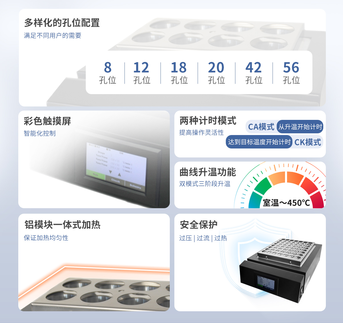 3. ☆智能化控制、時間控制、曲線升溫功能(雙模式三階段升溫)。雙模式分別為:CA模式:從升溫開始計時,CK模式:達到目標溫度開始計時。