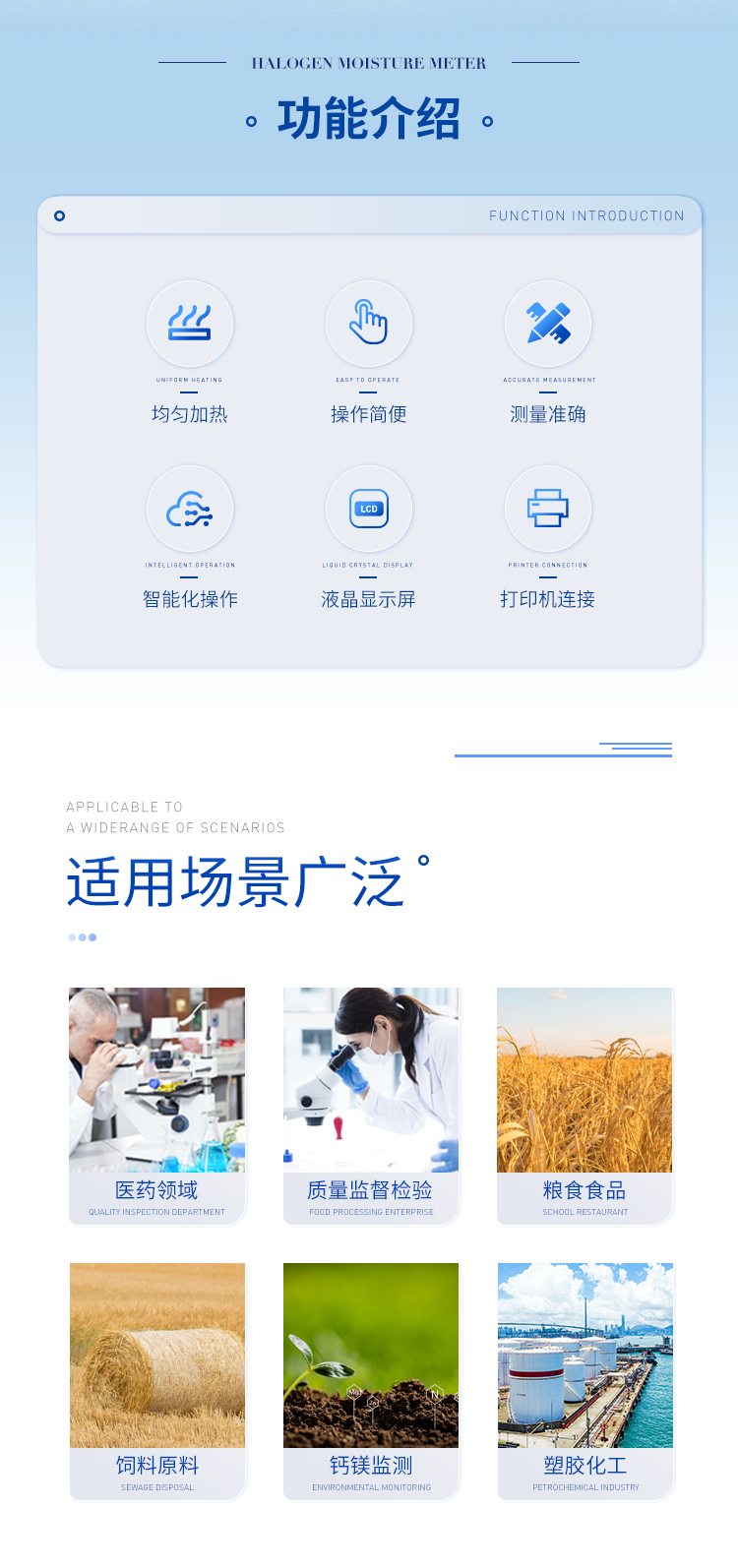 可廣泛應(yīng)用于一切需要快速測(cè)定水分的行業(yè),如醫(yī)藥,糧食、飼料、種子,菜籽,脫水蔬菜、煙草,化工,茶葉,食品、肉類以及紡織,農(nóng)林、造紙、橡膠、塑膠、紡織等行業(yè)中的實(shí)驗(yàn)室與生產(chǎn)過程中。同時(shí)滿足固體、顆粒、粉末、膠狀體及液體含水率的測(cè)定要求