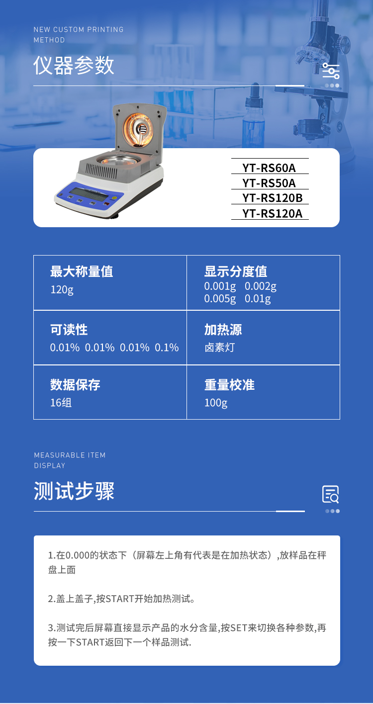 | 1、稱重范圍: 0.0001g-60g | 2、水分測(cè)定范圍:0.001-100%(10PPM-100%) | 3、傳感器精度:0.0001g(采用電磁力平衡傳感器) | 4、樣品質(zhì)量:0.3-60g | 5、加熱溫度范圍:起始-200℃ | 6、操作模式:全自動(dòng)、定時(shí)、手動(dòng) | 7、加熱模式:快速、標(biāo)準(zhǔn)、柔和 | 8、加熱源:500W鹵素?zé)?/td> | 9、水分含量可讀性:0.001% | 10、示參數(shù):%水分,時(shí)間,溫度,重量 | 11、通訊接口:標(biāo)配RS232通訊接口 | 12、秤盤尺寸(mm)直徑90 |