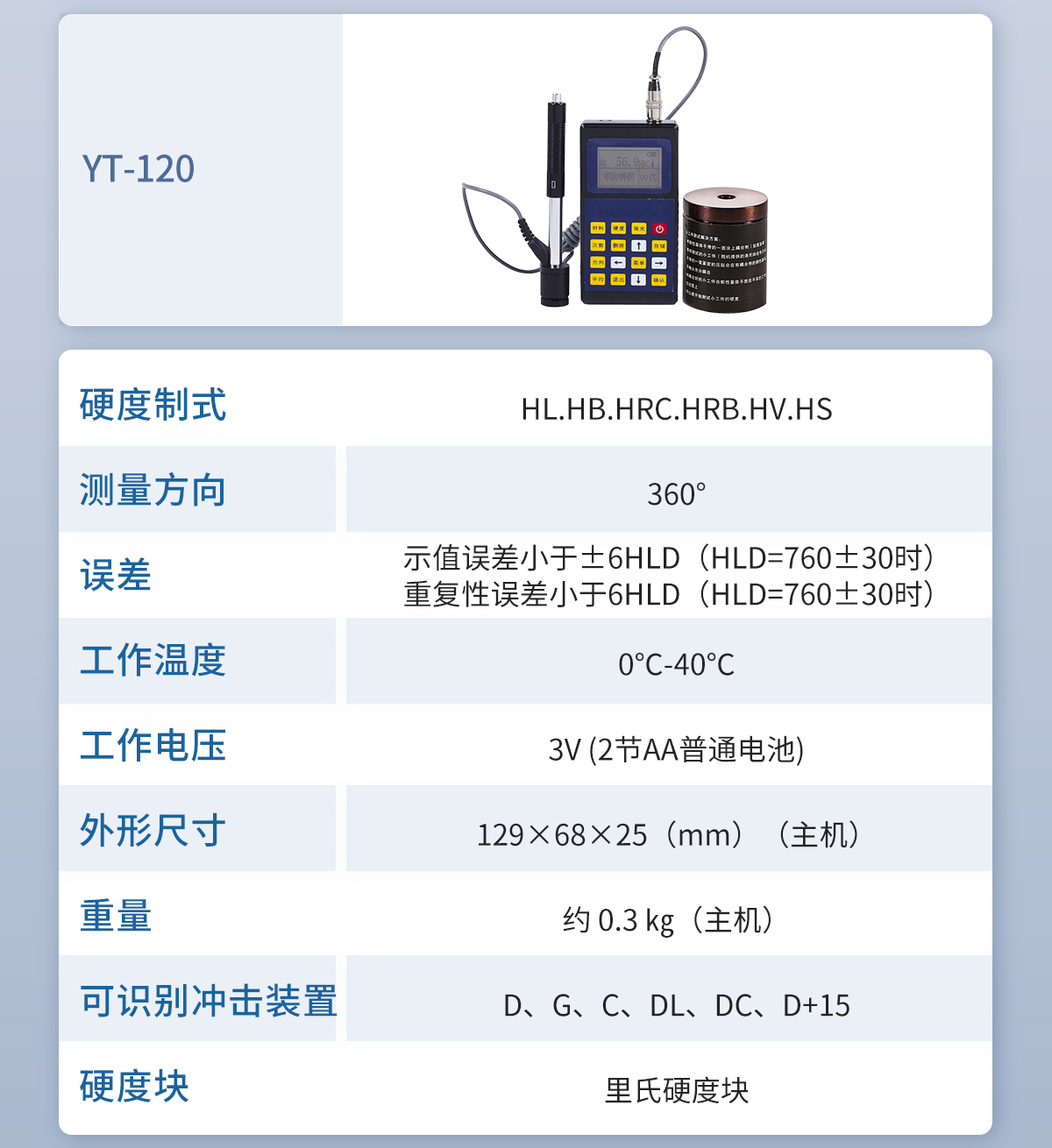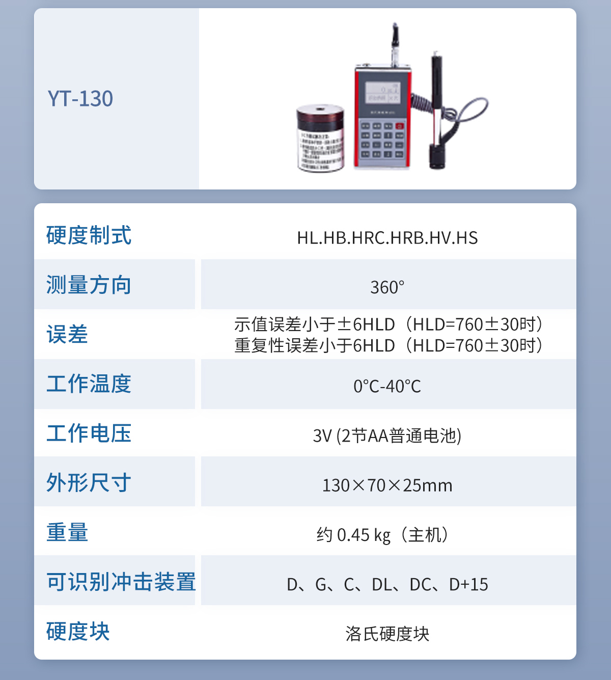 YT-130 里氏硬度計是我公司生產的多功能的硬度測量儀器。使用全中文顯示,菜單式操作,操作簡單、方便。本機可直接;顯示里氏、布氏、洛氏、維氏、肖氏等各種硬度值。儀器小巧、便攜、可靠性高,適用于惡劣的操作環境,抗振動、沖擊和電磁干擾。