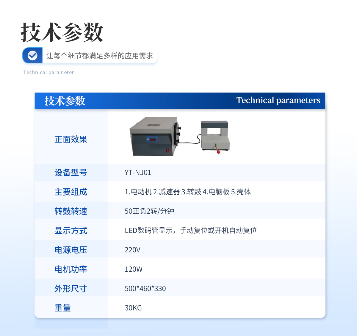 1.轉鼓轉速  50正負2轉/分鐘2.顯示方式  LED數碼管顯示,手動復位或開機自動復位3.電源電壓  220V4.電機功率  120W5.外形尺寸  500*460*3306.重量      30KG
