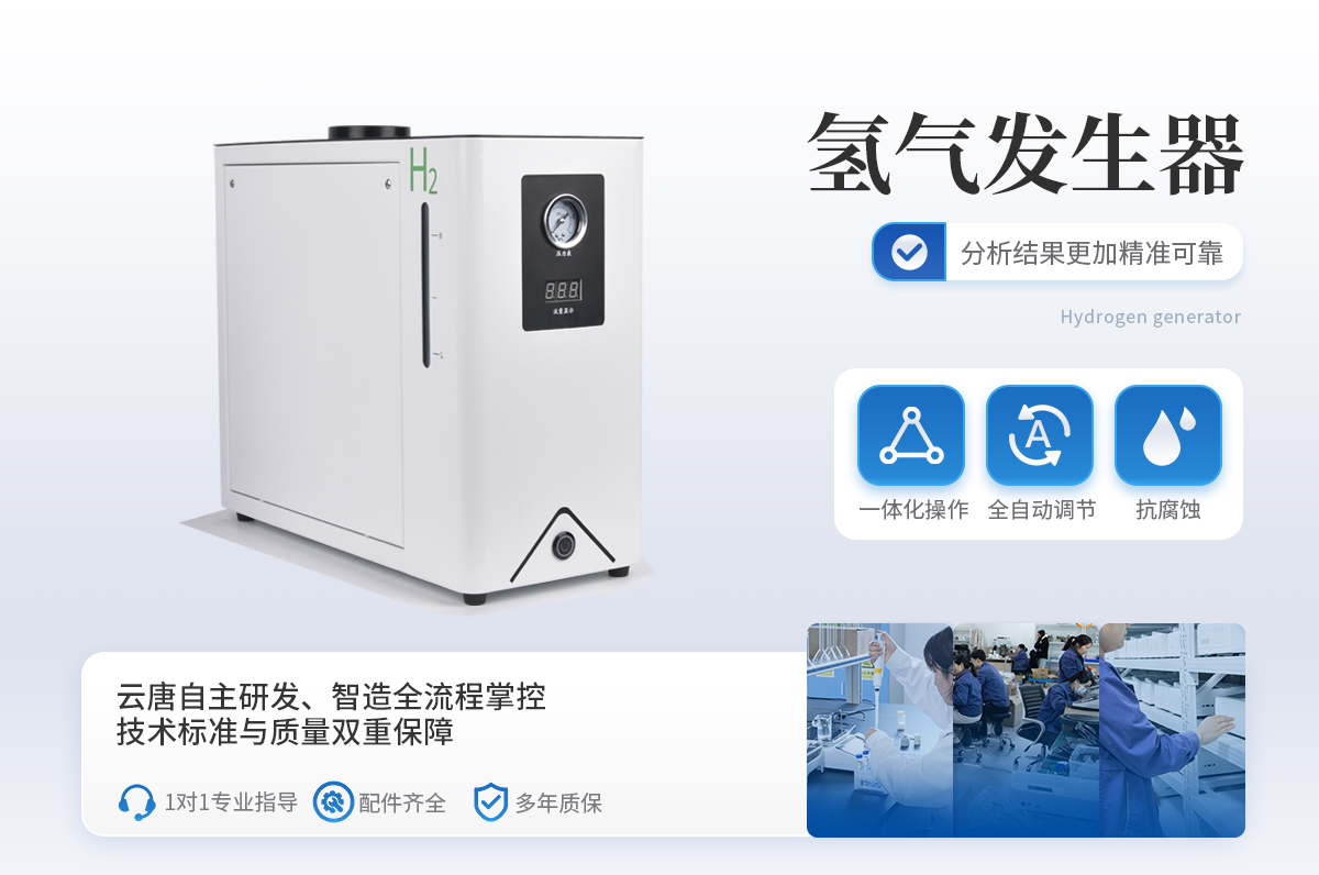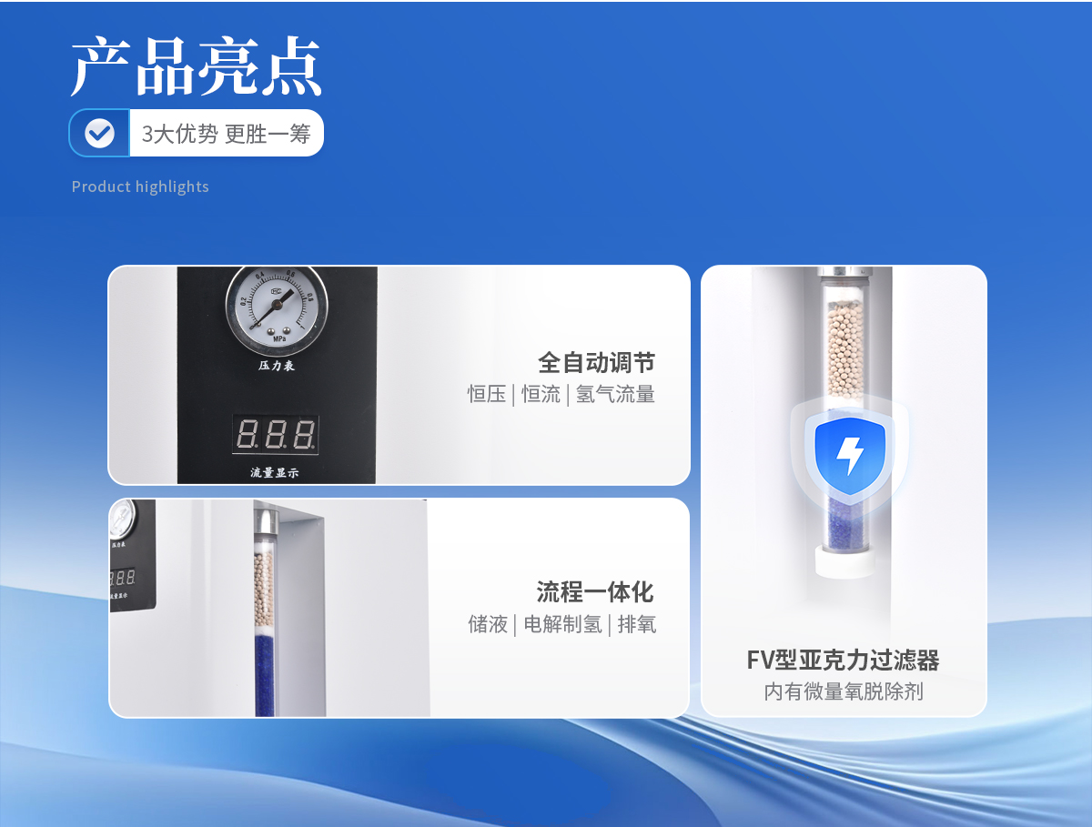 1、壓力、流量自動顯示,自動恒壓、恒流、氫氣流量可根據(jù)用量實現(xiàn)全自動調(diào)節(jié)。 2、FV型亞克力過濾器,內(nèi)有微量氧脫除劑(不需要活化),氫氣純度更高;儀器內(nèi)部采用硅橡膠圈(含硫量低),有效提高氣體質(zhì)量,保證色譜基線平穩(wěn)。 3、儲液、電解制氫、排氧一體化,池溫低,壽命長久。 4、配有安全裝置,靈敏可靠,自動防返堿。
