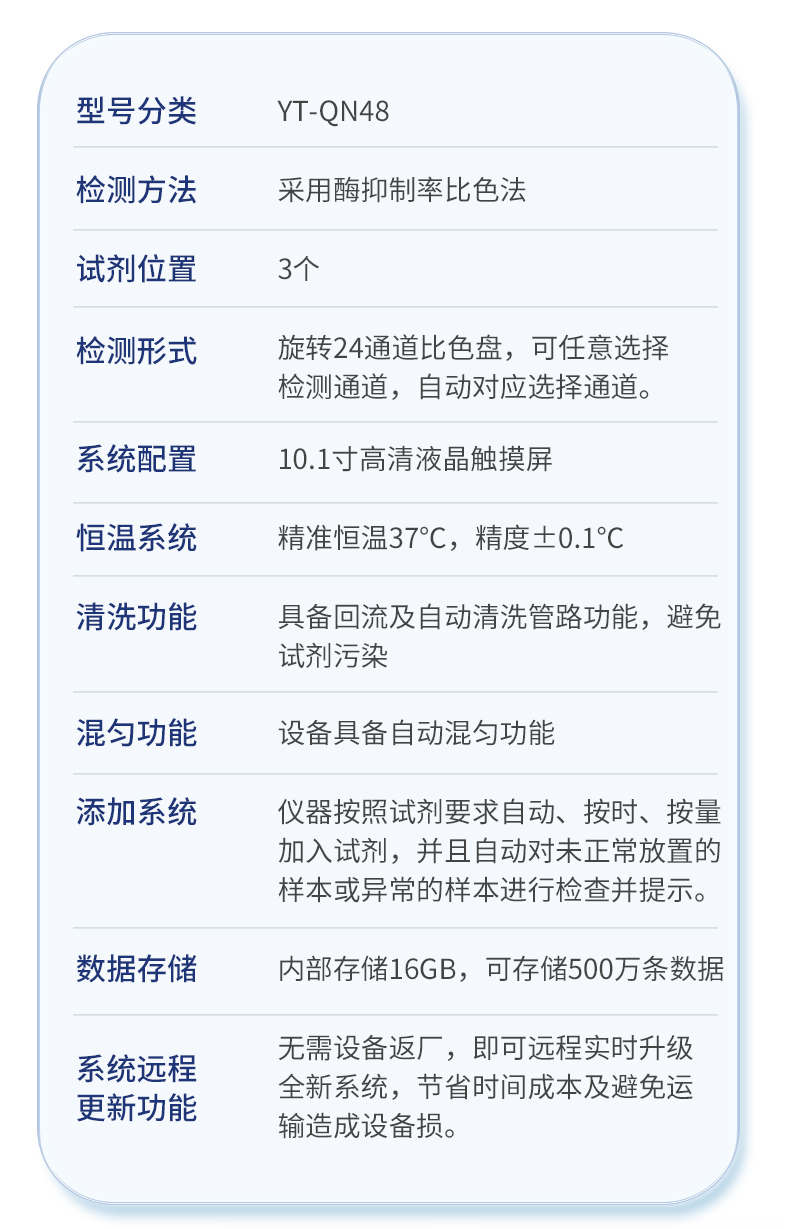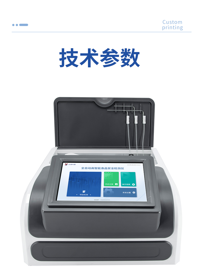 1. 試劑位置:3個2. 檢測形式:旋轉(zhuǎn)48通道比色盤,可任意選擇檢測通道,自動對應選擇通道。3. 系統(tǒng)配置:10.1寸高清液晶觸摸屏,采用ARM Cortex-A7,RK3288/4核處理器,運行內(nèi)存1GB。Android7.1.1 系統(tǒng)分辨率1280×800。4.恒溫系統(tǒng):具有自動加溫溫控系統(tǒng),精準恒溫37℃,精度±0.1℃。5.添加系統(tǒng):儀器按照試劑要求自動、按時、按量加入試劑,并且自動對未正常放置的樣本或異常的樣本進行檢查并提示。 6.清洗功能:儀器具備回流及自動清洗管路功能,避免試劑污染。7.混勻功能:設備具備自動混勻功能。8.光源校準:設備可自動校準,確保檢測準確度。9.實時監(jiān)控:儀器測試過程中屏幕顯示運行狀態(tài),可實時查看。10.數(shù)據(jù)存儲:內(nèi)部存儲16GB,可存儲500萬條數(shù)據(jù)。11.樣品多選功能:設備具備樣品一鍵多選功能,選擇樣品自動匹配檢測通道。12.項目預設:可提前設置單個及多個相同或不相同的檢測任務,可單次或者多次調(diào)取,減少檢測時間。13.自定義打印系統(tǒng):內(nèi)置自定義打印系統(tǒng),可按需靈活設置開啟或關(guān)閉:產(chǎn)品合格證(國家農(nóng)業(yè)部標準),二維碼,抽樣信息、檢測信息,受檢信息等信息的打印。14.A4版本報告打印功能:設備可自動生成A4版報告,A4報告帶二維碼,可掃描二維碼生成電子版,并可識別真?zhèn)巍?/td>15.傳輸方式:儀器配備無線通信模塊: 4G(APN)通訊模塊、Wifi模塊,藍牙傳輸模塊,同時具有USB接口以及RJ45接口能以多種方式實現(xiàn)數(shù)據(jù)保存和數(shù)據(jù)傳輸功能,設備數(shù)據(jù)可以同步上傳至平臺。16.數(shù)據(jù)監(jiān)管系統(tǒng):設備自帶監(jiān)管平臺,并可同步對接監(jiān)管平臺,數(shù)據(jù)可局域網(wǎng)和互聯(lián)網(wǎng)數(shù)據(jù)上傳,檢測結(jié)果可直接傳至食品安全監(jiān)管平臺。達到食品安全問題預估、預警。17.系統(tǒng)遠程更新功能:無需設備返廠,即可遠程實時升級全新系統(tǒng),節(jié)省時間成本及避免運輸造成設備損。