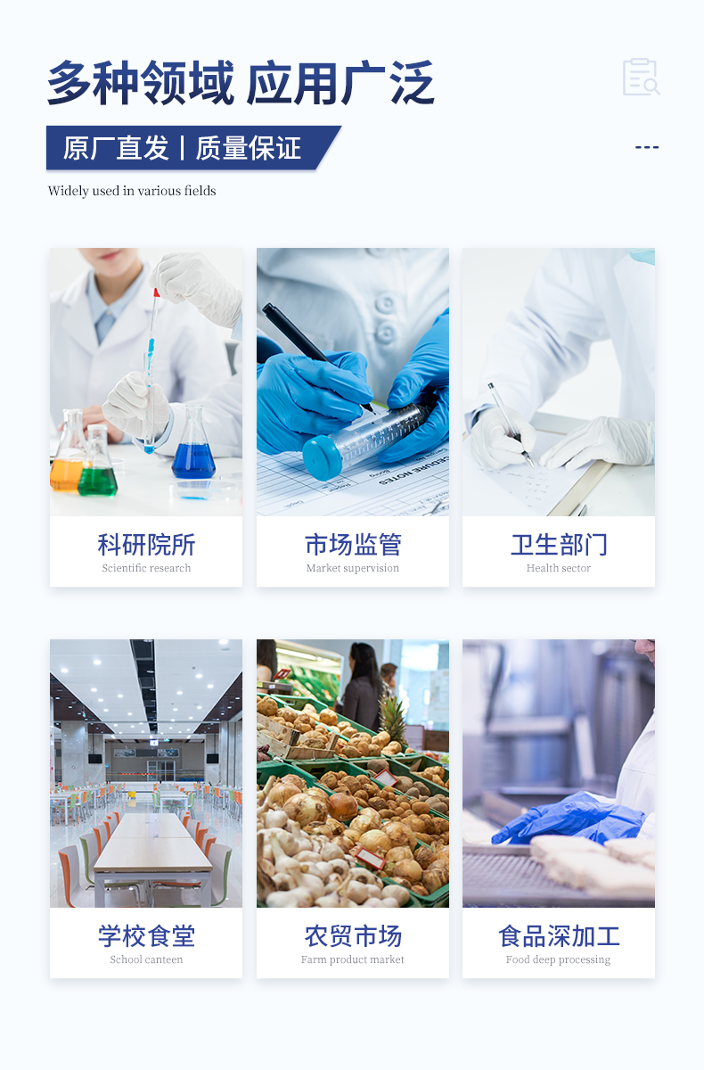 | 病害肉診斷:組胺、揮發性鹽基氮、肉制品酸價、水發產品中組胺 | 瘦肉精激素類(獸藥):鹽酸克倫特羅、沙丁胺醇、萊克多巴胺、己烯雌酚、喹乙醇等 | 抗生素殘留類(獸藥):四環素類、硝基呋喃類、磺胺類、沙星類、喹諾酮類、慶大霉素、鏈霉素、阿莫西林、紅霉素等 | 水產品安全類:孔雀石綠、氯霉素、呋喃妥因代謝、呋喃西林代謝、呋喃它酮代謝、呋喃唑酮代謝 |