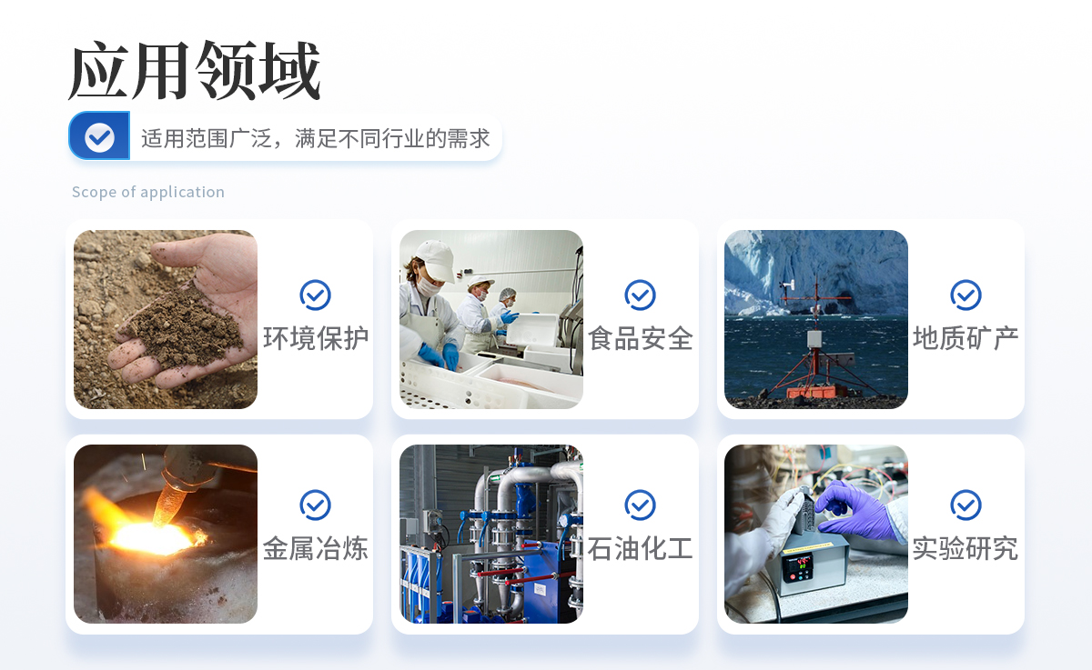 原子熒光光譜儀的應用領域較為廣泛,主要測試樣品中 11 種超痕量元素的含量,**檢測下限可達千億分之一級。應用領域包括水質、土壤、大氣等樣環境檢測項目、食品檢驗、檢驗檢疫、藥品檢驗、化妝品檢驗、土壤飼料肥料檢驗、地質礦產測試、冶金樣品檢驗、教學研究等。