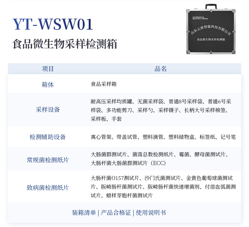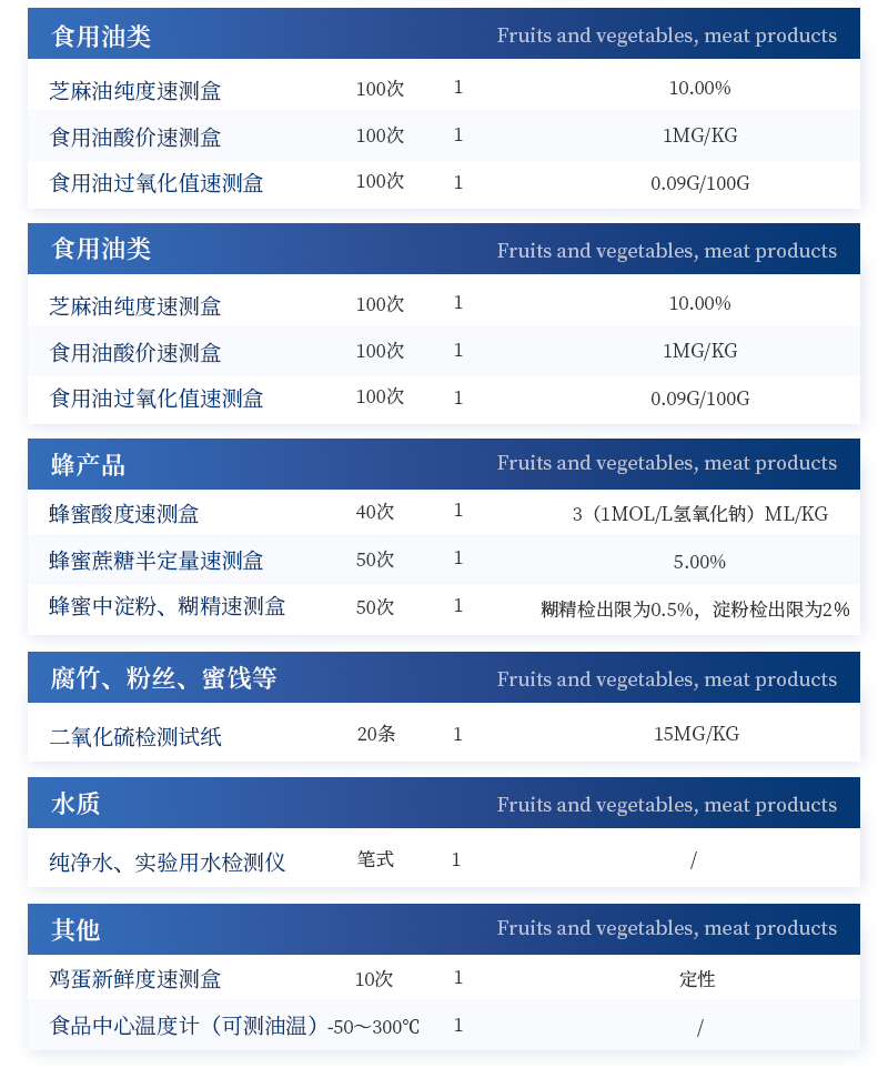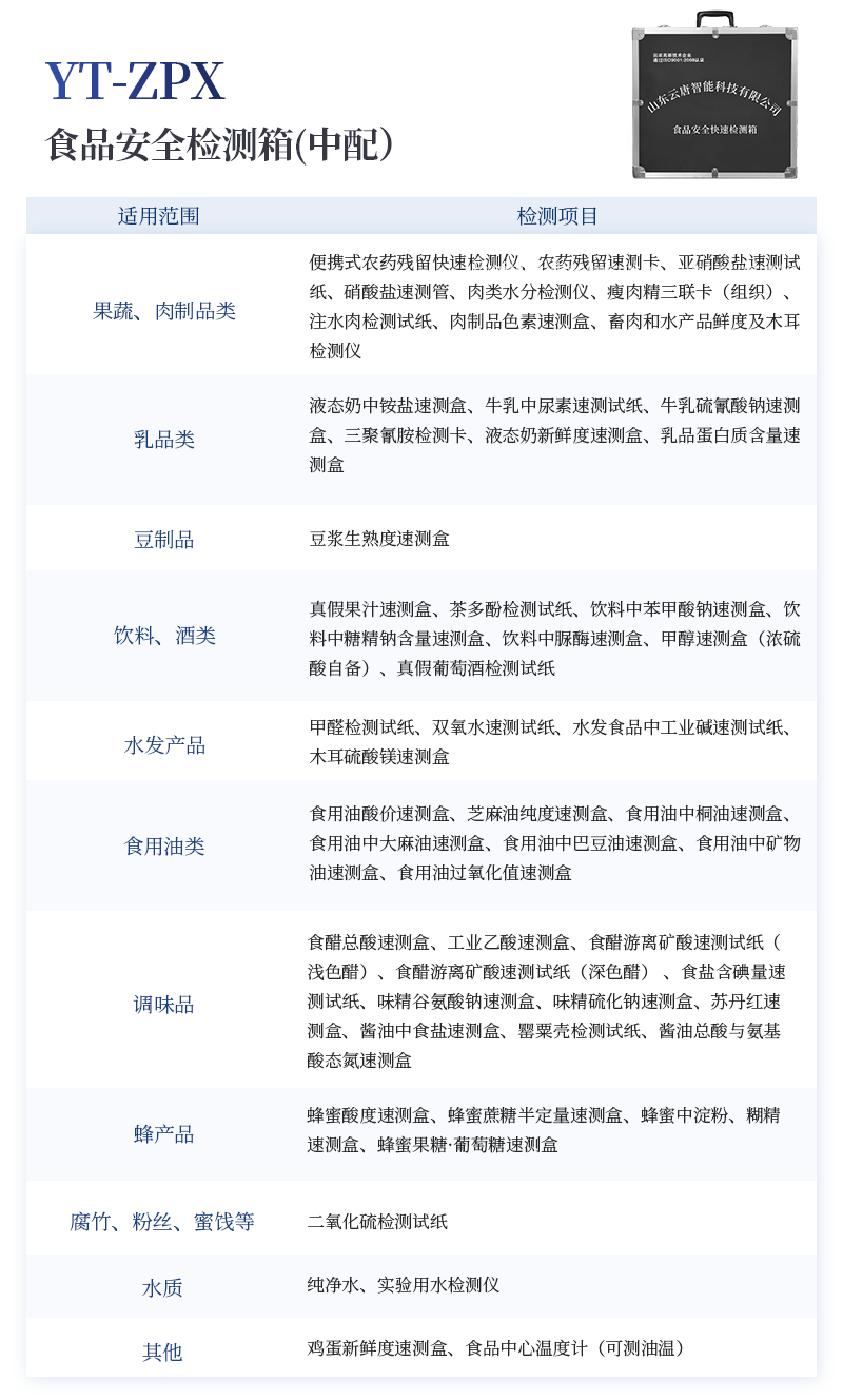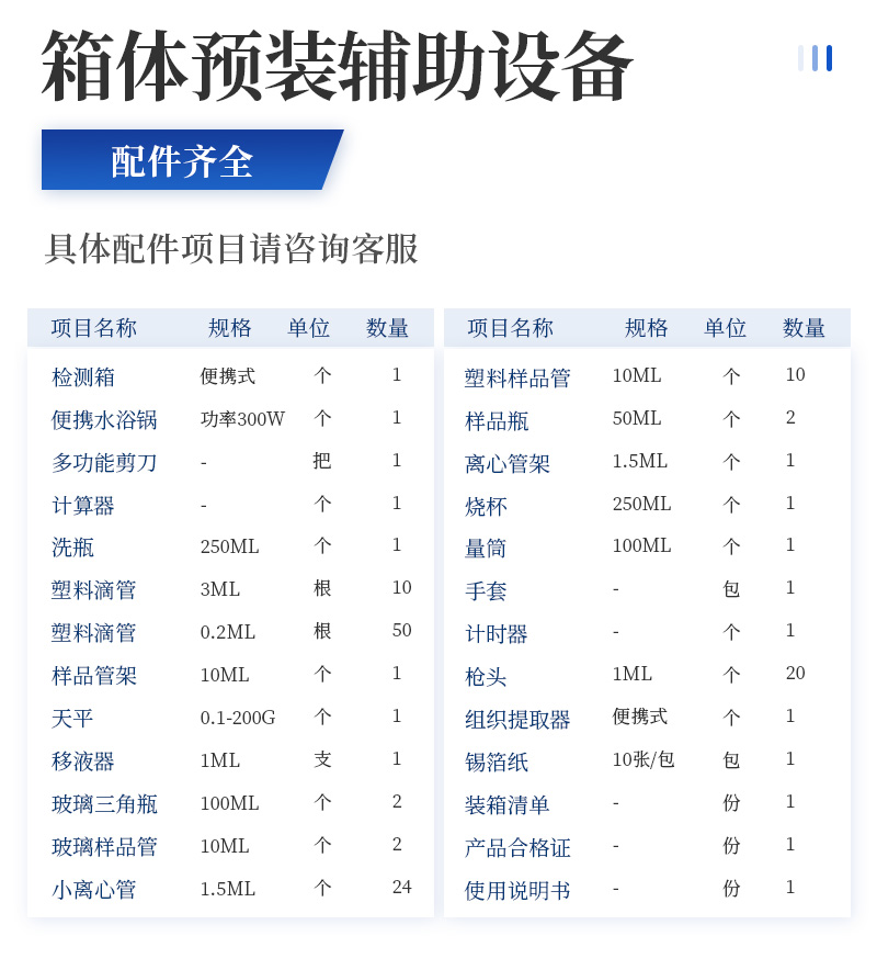 水產(chǎn)品安全快速檢測箱 序號 項(xiàng)目品 名 規(guī) 格 檢出限 單位 數(shù)量 1 箱體 食品安全快速檢測箱I 便攜式 / 個(gè) 1 2 實(shí)驗(yàn)器材 空氣吹干機(jī) 功率:450W / 個(gè) 1 微型離心機(jī) 5000轉(zhuǎn)/分鐘 / 個(gè) 1 多功能攪拌機(jī) 轉(zhuǎn)速:18000-22000轉(zhuǎn)/分鐘 / 臺(tái) 1 天平 0.1-200g / 個(gè) 1 移液器 1mL / 個(gè) 1 1ml 吸頭盒 內(nèi)含吸頭 / 個(gè) 1 多功能剪刀 - / 個(gè) 1 樣品管架 10ml / 個(gè) 1 計(jì)時(shí)器 - / 個(gè) 1 塑料樣品管 10ml / 個(gè) 20 小離心管 1.5ml / 個(gè) 50 3 水產(chǎn)品安全快速檢測卡 氯霉素檢測卡 10次/盒 0.3ppb 盒 1 磺胺類檢測卡 10次/盒 20ppb 盒 1 孔雀石綠檢測卡 10次/盒 2ppb 盒 1 呋喃西林檢測卡 10次/盒 0.5ppb 盒 1 呋喃妥因檢測卡 10次/盒 0.5ppb 盒 1 呋喃唑酮檢測卡 10次/盒 0.5ppb 盒 1 呋喃它酮檢測卡 10次/盒 0.5ppb 盒 1 4 裝箱清單 —— —— —— 份 1 5 產(chǎn)品合格證 —— —— —— 份 1 6 使用說明書 —— —— —— 份 1 |