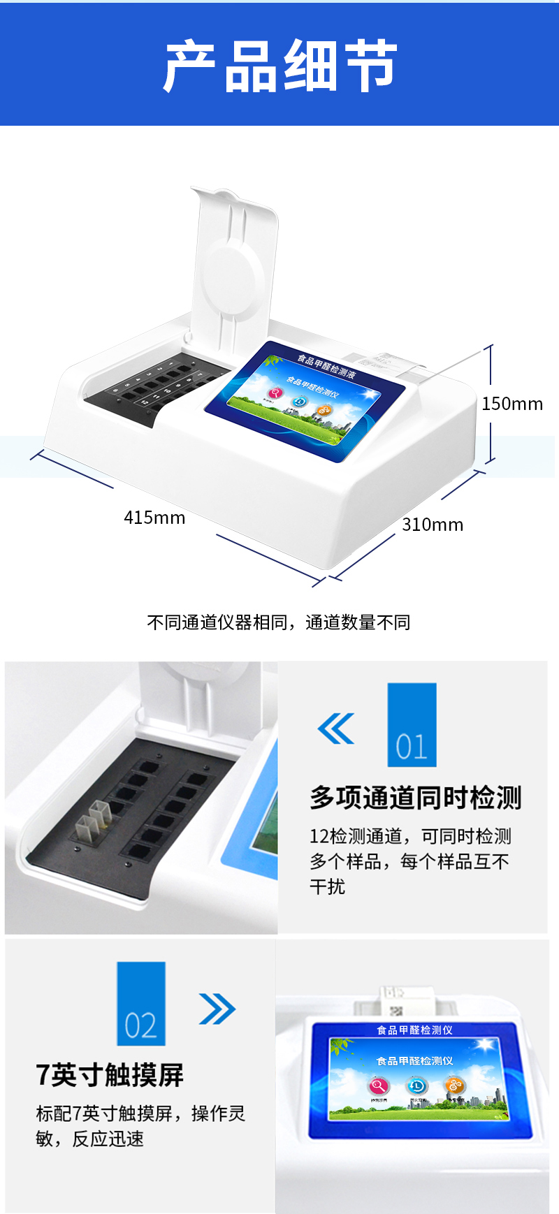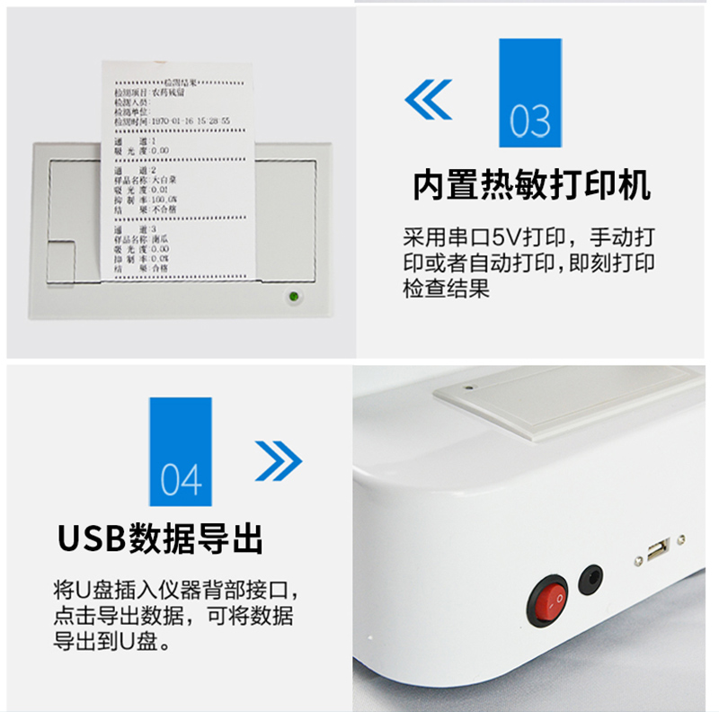 | 儀器采用臺(tái)式一體化系統(tǒng)檢測(cè)技術(shù),將分光光度模塊、新型農(nóng)殘檢測(cè)模塊、數(shù)字化管理模塊、無(wú)線通訊模塊高度集成于一體,支持檢測(cè)200種食品安全檢測(cè)項(xiàng)目,同時(shí)預(yù)留升級(jí)檢測(cè)方法。 | 儀器檢測(cè)模塊標(biāo)準(zhǔn)化、智能化,可隨意自由組合。檢測(cè)箱體內(nèi)置多個(gè)標(biāo)準(zhǔn)檢測(cè)單元,檢測(cè)模塊可以調(diào)整配置。 | 儀器采用全新安卓智能系統(tǒng),主控芯片采用 ARM Cortex-A7,RK3288/4核處理器,10.1寸高清液晶觸摸豎屏,更加**的UI交互界面,運(yùn)轉(zhuǎn)快捷;儀器配備無(wú)線通信模塊: 4G(APN)通訊模塊、Wifi模塊,藍(lán)牙傳輸,同時(shí)具有雙USB接口以及RJ45接口能以多種方式實(shí)現(xiàn)數(shù)據(jù)保存和數(shù)據(jù)傳輸功能。 | 創(chuàng)新檢測(cè)模式: | ★檢測(cè)通道:≥12通道;采用精密旋轉(zhuǎn)比色池設(shè)計(jì),使用同芯片同光源校準(zhǔn)精度,解決不同光源之間的誤差值。1-12通道間誤差0.1%。(***:**202022821055.2) | ★儀器具有自動(dòng)識(shí)別比色皿檢測(cè)功能,即:將樣品比色皿放入儀器后,點(diǎn)擊樣品檢測(cè),儀器自動(dòng)識(shí)別比色皿進(jìn)行通道檢測(cè)。 | 進(jìn)口高精光源: | 高精度進(jìn)口四波長(zhǎng)冷光源,通道配置 410、520、590、630nm 波長(zhǎng)光源,一個(gè)光源芯片驅(qū)動(dòng)一個(gè)光源,誤差極小,每臺(tái)設(shè)備單獨(dú)**校準(zhǔn)光源,**比對(duì),同時(shí)參照四種不同波段光源全方位覆蓋市面上99%的農(nóng)殘食品項(xiàng)目檢測(cè)。 | 智能化操作系統(tǒng): | 便捷操作系統(tǒng):設(shè)備檢測(cè)時(shí)可在同一檢測(cè)界面自動(dòng)對(duì)應(yīng)相關(guān)檢測(cè)通道一次性選擇1-12個(gè)樣品名稱,無(wú)須退出界面,節(jié)省操作時(shí)間。 | 數(shù)據(jù)集成系統(tǒng):設(shè)備首頁(yè)自動(dòng)統(tǒng)計(jì)檢測(cè)數(shù)據(jù)包含:周檢測(cè)數(shù)據(jù)、月檢測(cè)數(shù)據(jù),全部檢測(cè)總數(shù)量,均包含檢測(cè)總數(shù),合格數(shù),不合格數(shù),以及相關(guān)柱形分析圖,對(duì)各項(xiàng)檢測(cè)數(shù)據(jù)清晰掌握,無(wú)需電腦查詢,更加快捷直觀。 | 項(xiàng)目預(yù)設(shè)系統(tǒng):支持添加單個(gè)及多個(gè)相同或不相同的任務(wù)預(yù)設(shè),一鍵快速調(diào)取,每一個(gè)任務(wù)分別可以設(shè)置不同的樣品、批次、編號(hào)、來(lái)源、備注、抽樣信息、檢測(cè)信息、受檢信息、復(fù)核信息等更多信息。無(wú)縫鏈接平臺(tái)和APP實(shí)時(shí)查看下發(fā)任務(wù)。 | 數(shù)據(jù)監(jiān)管系統(tǒng):同步對(duì)接監(jiān)管平臺(tái),數(shù)據(jù)可局域網(wǎng)和互聯(lián)網(wǎng)數(shù)據(jù)上傳,檢測(cè)結(jié)果可選擇直接傳至食品安全監(jiān)管平臺(tái)。集成OSS輸出存儲(chǔ)服務(wù)、區(qū)分設(shè)備定向管理應(yīng)用,進(jìn)行區(qū)域食品安全監(jiān)管及大數(shù)據(jù)分析處理與數(shù)據(jù)統(tǒng)計(jì),檢測(cè)區(qū)域食品安全長(zhǎng)短期動(dòng)態(tài),達(dá)到食品安全問(wèn)題預(yù)估、預(yù)警。 | 自定義打印系統(tǒng):內(nèi)置全新打印系統(tǒng),新創(chuàng)自定義打印方式,可按需靈活設(shè)置開(kāi)啟或關(guān)閉:產(chǎn)品合格證(國(guó)家農(nóng)業(yè)部標(biāo)準(zhǔn)要求),二維碼,抽樣信息、檢測(cè)信息,受檢信息、復(fù)核信息、抽樣日期、檢測(cè)日期等信息的打印。 | 系統(tǒng)遠(yuǎn)程更新功能:可定向分客戶分儀器更新系統(tǒng),按照不同客戶后期實(shí)際需求添加項(xiàng)目,無(wú)需機(jī)器返廠,即可遠(yuǎn)程實(shí)時(shí)升級(jí)全新系統(tǒng),節(jié)省時(shí)間成本及避免運(yùn)輸造成設(shè)備損壞。 | 儀器主機(jī)采用一體化防水、抗壓、防撞擊、防腐蝕箱體設(shè)計(jì),同時(shí)配備交直流供電,可連接車載電源,可選配大容量充電鋰電池,滿足現(xiàn)場(chǎng)野外檢測(cè)需求。 | 安全證書(shū),放心保障:儀器具有中國(guó)計(jì)量科學(xué)研究院校準(zhǔn)證書(shū),權(quán)威認(rèn)證。 |