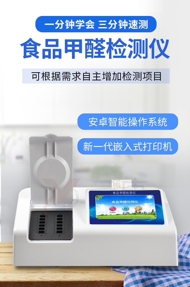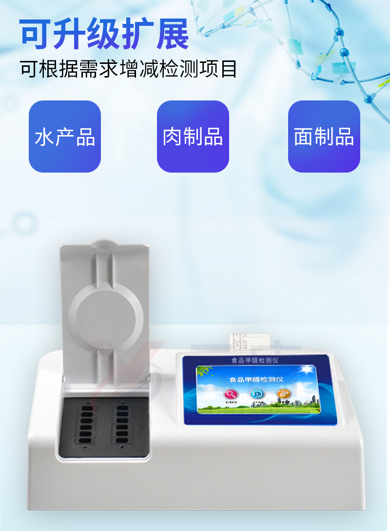 可快速定量檢測(cè)各類食品中的甲醛的含量,儀器預(yù)留其他項(xiàng)目檢測(cè)程序和端口,根據(jù)日后需求可方便的自主增加檢測(cè)項(xiàng)目。日后可升級(jí)為檢測(cè),水產(chǎn)品,肉制品,面制品的綜合類型儀器。