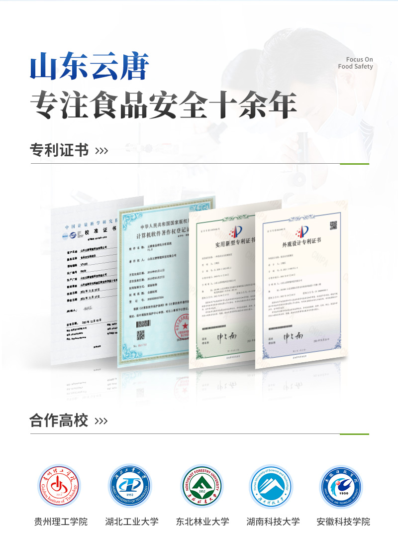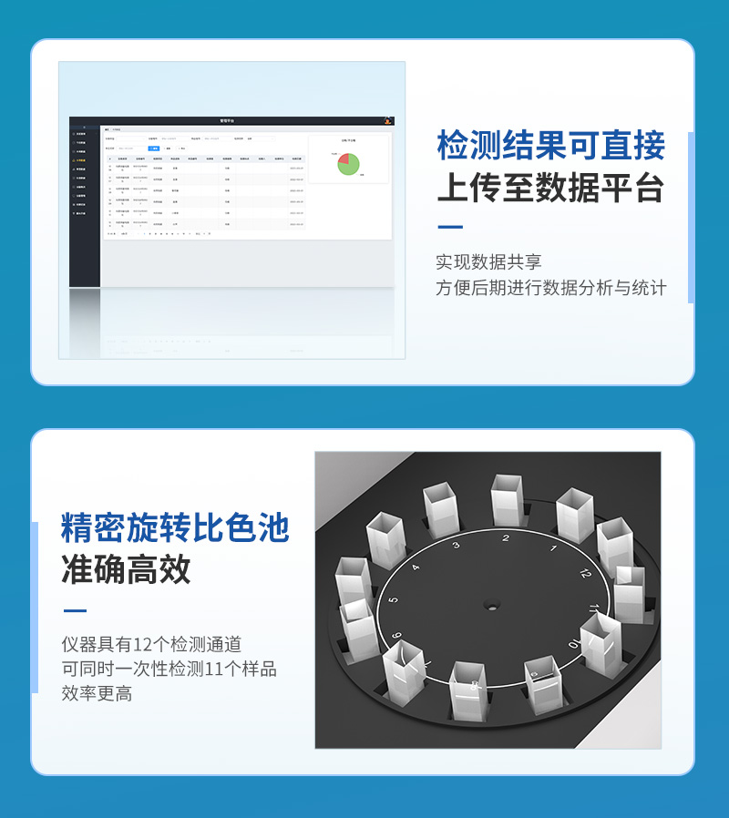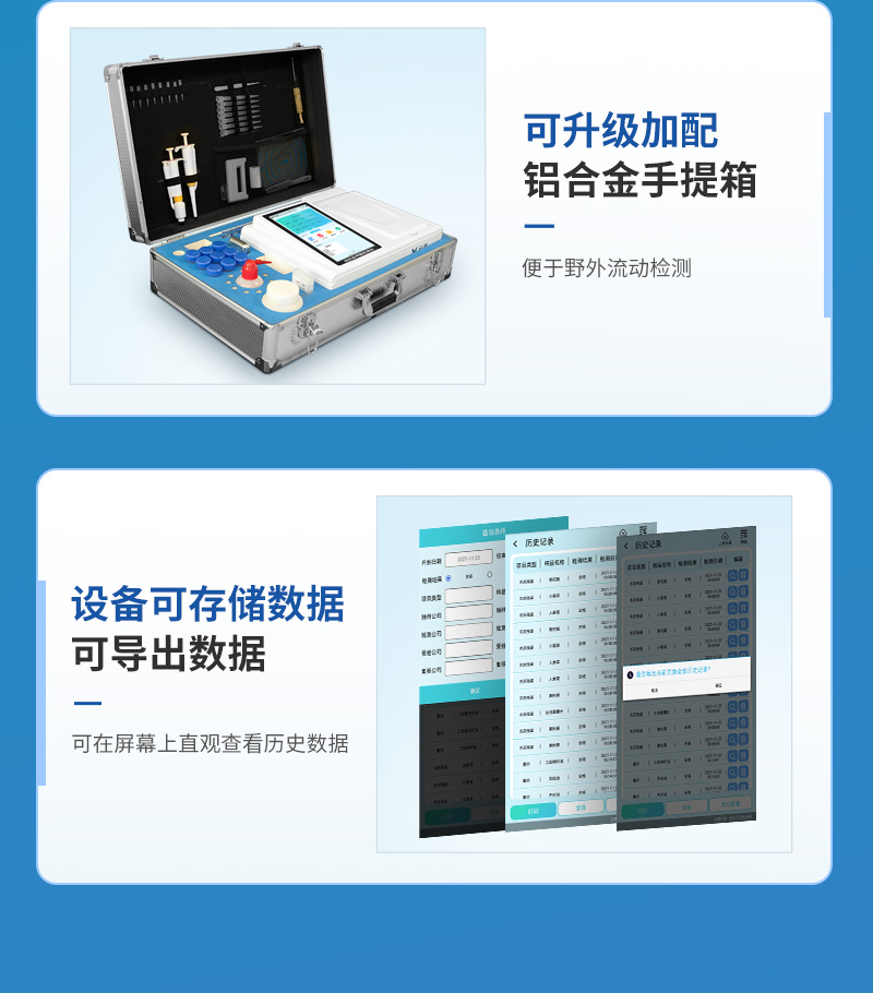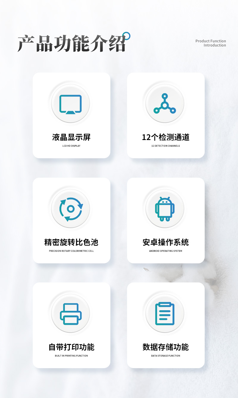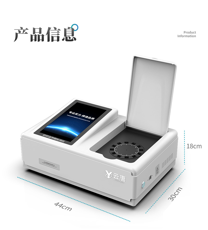 該儀器采用ARM Cortex-A7,RK3288/4核處理器,搭配運行安卓智能操作系統,集實驗操作,分析結果,打印報告等功能于一體,使用方便,性能更強。儀器采用7.1英寸液晶觸摸屏,單機即可操作,無需連接外部顯示設備或控制裝置。設備具有12個檢測通道,可一次性檢測11個樣品,效率更高。儀器采用精密旋轉比色池設計,使用同光源校準精度,檢測結果更為準確**。設備具有數據存儲功能,設備可以存儲數據100000組,可在屏幕上直觀查看歷史數據,可導出數據。設備自帶打印功能,可對樣品信息及檢測結果無限次隨意打印。該儀器模塊化高度集成,同步設有數字化管理模塊、無線通訊模塊,可將檢測結果進行分析,直接上傳至數據平臺,實現數據共享,方便后期進行數據分析與統計。儀器采用高度智能化系統,儀器自動對檢測結果與國標限量值進行對比,自動判定樣品是否合格,結果更為直觀。本設備可以針對檢測樣品信息,對每個通道屬性單獨進行編輯,例如受檢單位,檢測人員等。設備具有過壓保護、防靜電干擾、防磁場干擾等功能該設備可進行技術性遠程升級,更新程序,無需返廠,并且后期我司將持續免費更新系統版本,降低使用成本及運輸損耗風險。