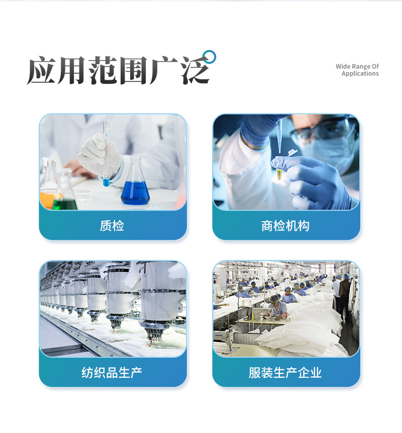 該紡織品甲醛檢測系統與質檢、商檢機構采用同樣執行標準、檢測方法,專業為廣大紡織品、服裝等生產企業、質檢商檢單位提供“一站式服務”,同時為各類紡織品甲醛實驗室提供專業的解決方案。