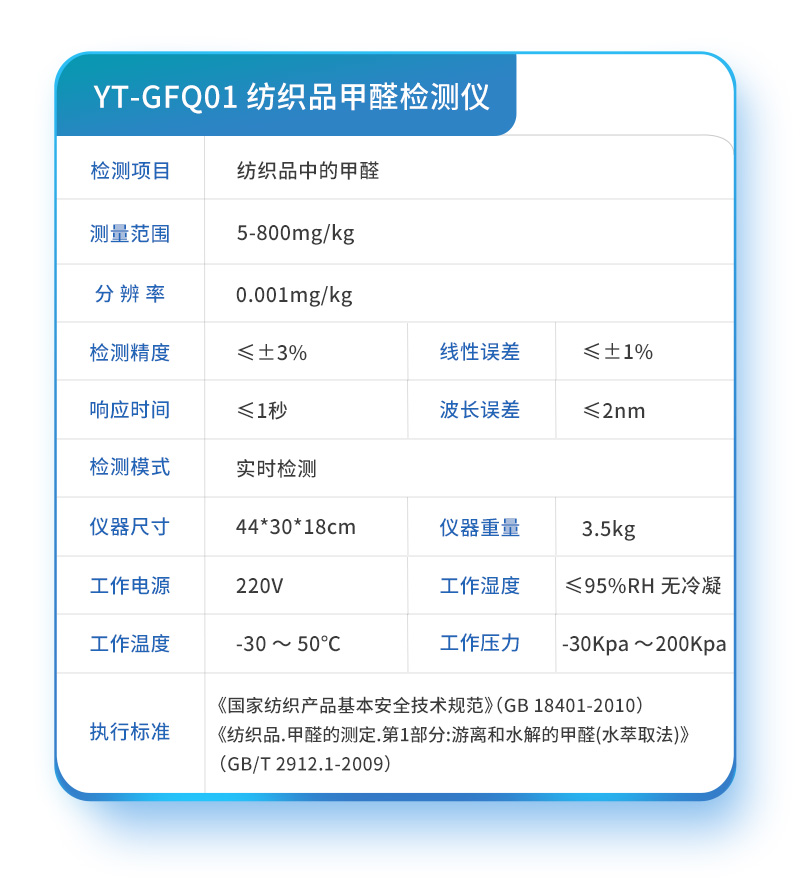 紡織品甲醛檢測儀滿足紡織品甲醛含量檢測的中國標準《國家紡織產品基本安全技術規范》(GB 18401-2010)、《紡織品.甲醛的測定.第1部分:游離和水解的甲醛(水萃取法)》(GB/T 2912.1-2009), 適合各種紡織品、服裝等的甲醛含量檢測。2026-04-14