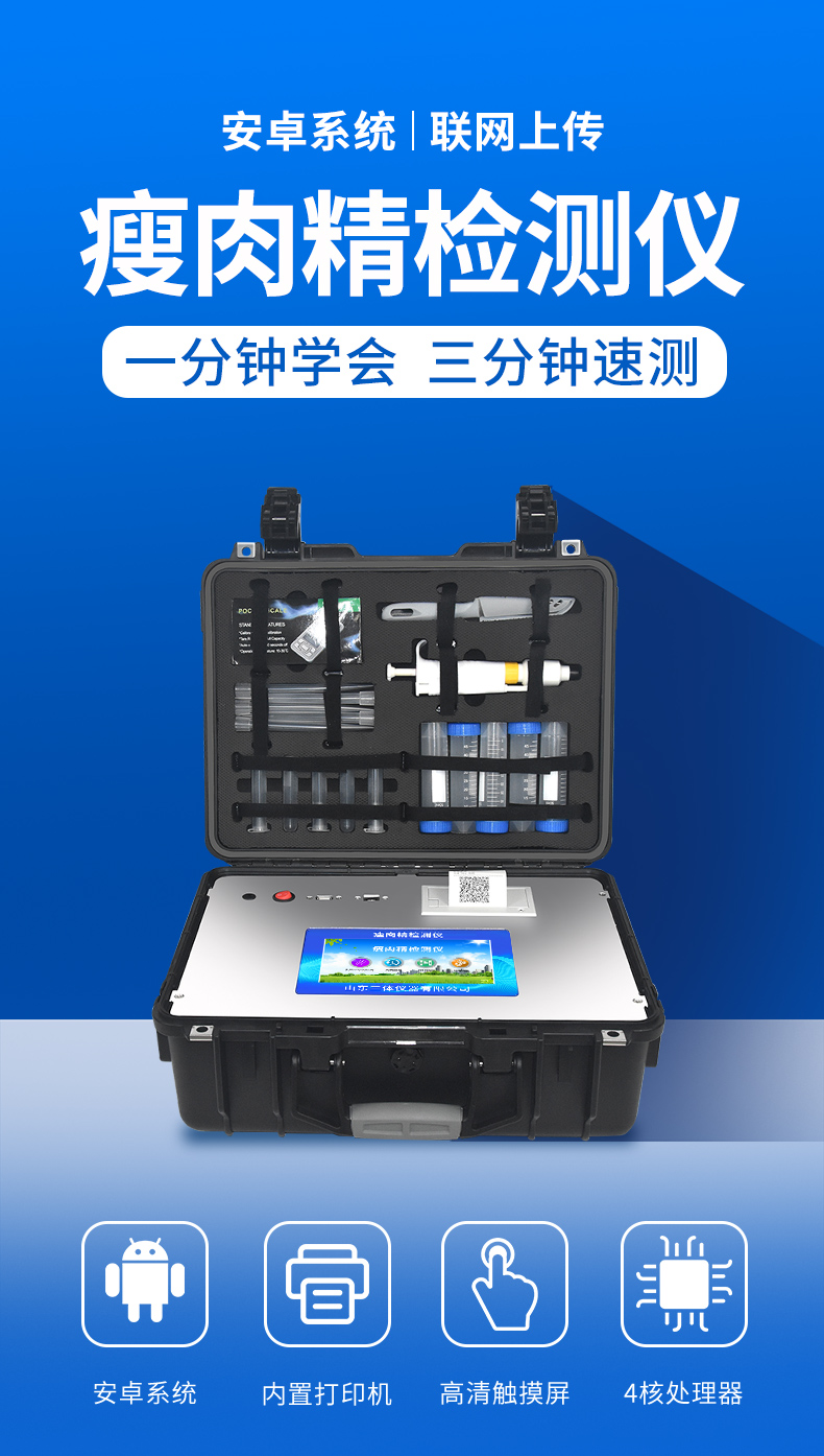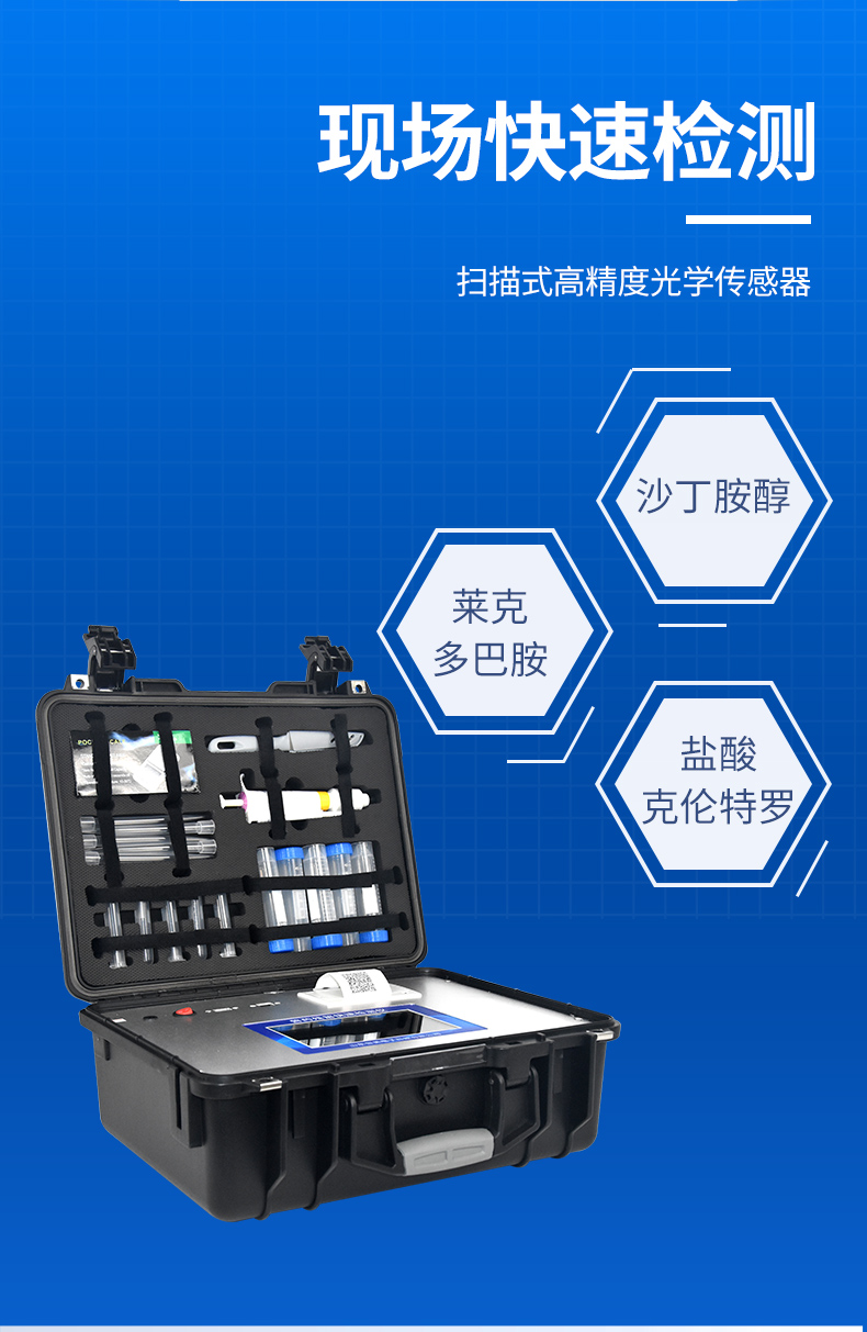 瘦肉精檢測儀可現場快速檢測鹽酸克倫特羅、萊克多巴胺、沙丁胺醇、己烯雌酚、喹乙醇等。儀器預留其他項目檢測程序和端口,根據日后需求可方便的自主增加檢測項目。日后可升級為檢測抗生素、獸藥殘留、動物疫病、病害肉、的綜合類型儀器