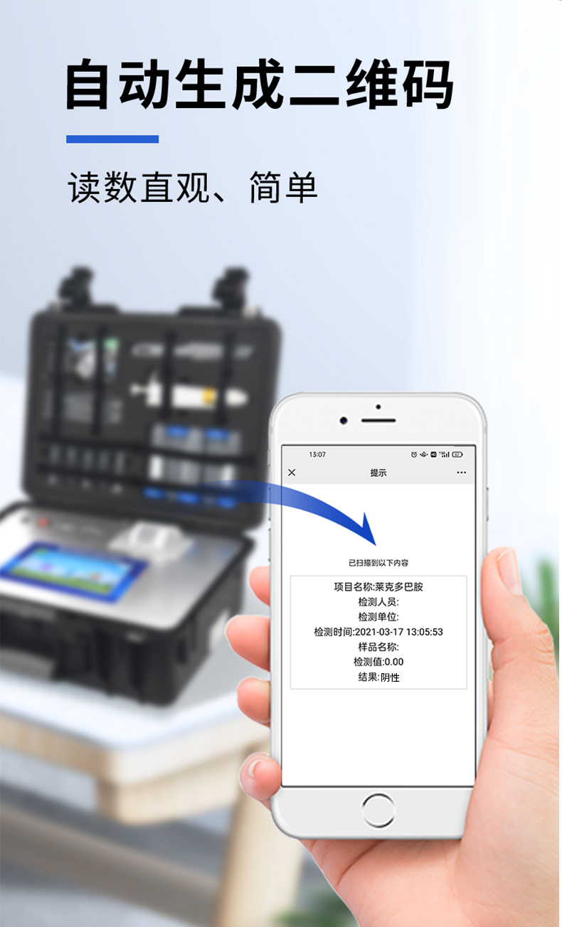 安卓智能操作系統,采用更加**和人性化操作,儀器具有wifi聯網上傳、4G聯網傳輸、GPRS無線遠傳、網線連接功能,快速上傳數據。智能化程度高,儀器具有自檢功能:具有開機自檢和調零功能,具有自動檢測重復性功能。新一代高速熱敏打印機,檢測完成可自動打印檢測報告和二維碼。儀器帶有監管平臺,數據可局域網和互聯網數據上傳,檢測結果直接傳至食品安全監管平臺。進行區域食品安全監管及大數據分析處理與數據統計,檢測區域食品安全長短期動態,達到食品安全問題預估、預警一體化便攜式快檢設備,滿足現場及流動檢測使用需求,能夠在同一軟件下實現所有檢測項目的檢測,并可通過同一窗口直觀顯示檢測結果。膠體金模塊檢測方式:軌道式自動傳輸掃描,檢測完成后自動退出檢測卡。儀器內置攝像頭拍照,可顯示金標卡實時圖像,系統自動分析并呈現出CT曲線圖,CT線自動識別,無需手動調整。儀器具有品類多種類樣品菜單庫,可靈活選擇檢測樣品,不同的檢測通道可同時檢測不同的樣品項目。樣品處理簡單省力,整體操作快速、安全、便捷。高靈敏度,高檢測精度,高重復性精度,掃描式高精度光學傳感器。內置強大的數據庫,可在儀器上直接選擇樣品名稱、檢測指標、送檢單位等信息,也可在儀器上直接編輯錄入樣品名稱、檢測指標、送檢單位等信息并保存進樣品數據庫。儀器具有自身保護功能,可設置用戶名及密碼,防止非工作人員操作等。儀器具有重新校準、鎖定、恢復出廠設置功能。結果判定線可修改,對照值標定值可保存,斷電不丟失數據。兼容市場上所有的膠體金卡,使用耗材不受限制,極大增強用戶使用體驗。