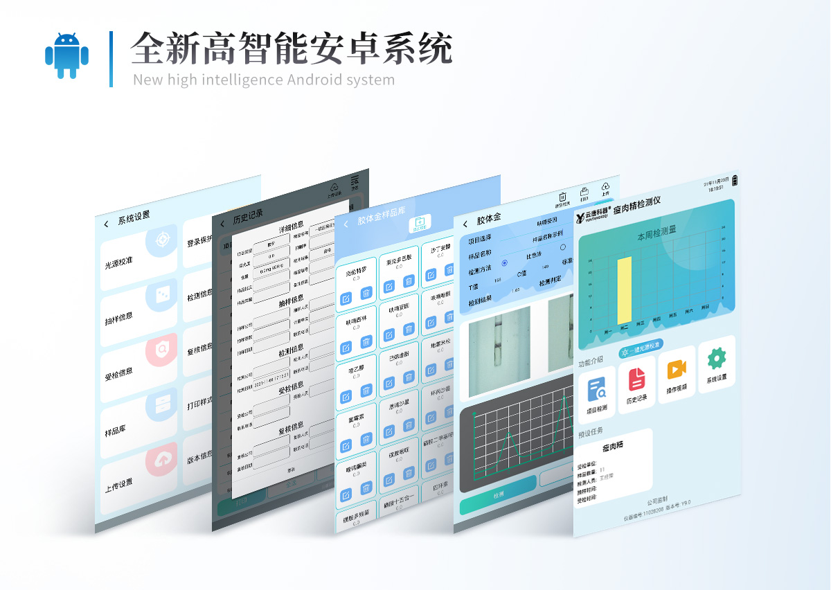 | 儀器采用10.1英寸液晶觸摸屏顯,搭配運行安卓智能操作系統,主控芯片采用ARM Cortex-A7,RK3288/4核處理器,主頻1.88Ghz,運轉速度更快速,性能更強。 | 儀器功能包括:膠體金檢測模塊、數字化管理模塊、無線通訊模塊等,可以滿足同一軟件下實現所有檢測項目的檢測,并在同一窗口展示檢測結果。 | 一體化臺式快檢設備,采用交直流兩用供電方式,可連接車載電源,配備6ah大容量充電鋰電池,可以滿足現場及流動檢測使用的需求。儀器尺寸:43×35×20cm, 主機凈重:5.1kg | 系統自帶數據集成模塊,設備首頁自動統計檢測數據包含:周檢測數據、月檢測數據,全部檢測總數量,均包含檢測總數,合格數,不合格數,以及相關柱形分析圖,對各項檢測數據清晰掌握,無需電腦查詢,更加快捷直觀。 | 儀器具有任務預設模塊,可在樣品送檢前提前預設樣品名稱、檢測指標、送檢單位等信息,樣品送檢時一鍵調取保存信息,檢測更加方便快捷。 | 直插式自動掃描方式,可實時顯示金標卡實時圖像,系統自動分析并呈現出CT曲線圖,CT線自動識別,無需手動調整,完成檢測后自動退出檢測卡。 | 膠體金模塊檢測方式:軌道式自動傳輸掃描,檢測完成后自動退出檢測卡。 | 儀器檢測系統擁有龐大數據庫,并且構建了完善的檢索、修訂功能。食品庫涵蓋多種樣品名稱,可按需添加或刪除、編輯樣品名稱;產品數據庫以及歷史檢測記錄支持一鍵檢索功能。 | 系統打印自定義化,打印格式多樣化,產品合格證(國家標準要求),二維碼,抽樣信息、檢測信息,受檢信息、復核信息、抽樣日期、檢測日期等信息結果,可按需求自行設置打印內容。 | A4紙版本報告打印功能(可選配):設備擁有兩種結果展示方式,可以自動生成A4打印模板和小票打印模板兩種樣式,可通過WiFi及網線等方式鏈接外置打印機可進行打印 | 儀器具有 wifi 聯網上傳、RJ45網線連接功能,可以快速上傳數據。同步對接監管平臺,數據可局域網和互聯網數據上傳,檢測結果直接傳至食品安全監管平臺。進行區域食品安全監管及大數據分析處理與數據統計,檢測區域食品安全長短期動態,達到食品安全問題預估、預警。 | 設備支持U盤存儲,標準USB接口,免驅動安裝。檢測結果存儲容量20萬條以上,可生成Excel表格,進行一鍵拷貝,并具有登錄保護功能,可設置用戶名及密碼,規范不同人員操作權限,防止非工作人員操作,并且可以進行重新校準、鎖定、恢復出廠設置功能。儀器固件可升級,后期檢測項目可擴充。 | 儀器具備遠程升級功能,可定向分客戶分儀器更新,開機后自動更新,并可持續性免費更新系統版本,無需像傳統產品返廠更新,節省時間及人力成本并避免了物流運輸返廠升級導致設備損壞的潛在風險。 |
