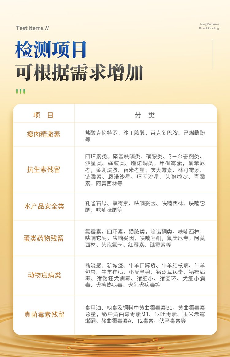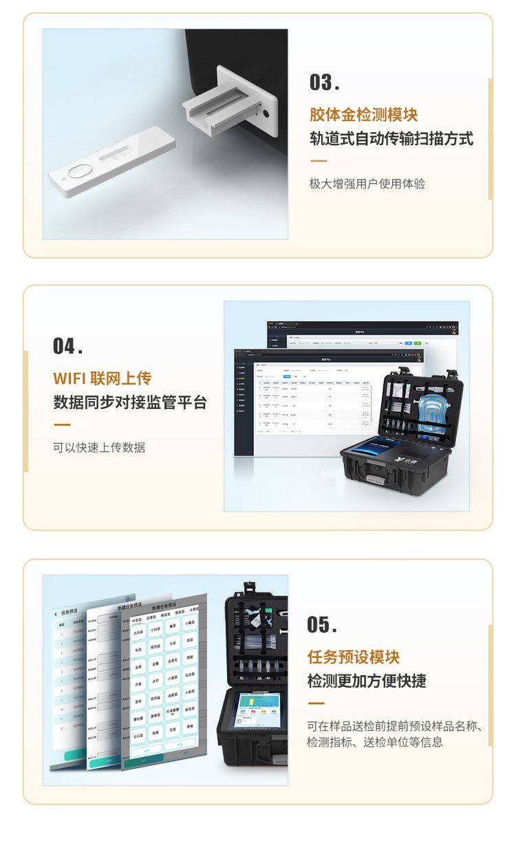 儀器檢測系統擁有龐大數據庫,并且構建了完善的檢索、修訂功能。食品庫涵蓋多種樣品名稱,可按需添加或刪除、編輯樣品名稱;產品數據庫以及歷史檢測記錄支持一鍵檢索功能。系統打印自定義化,打印格式多樣化,產品合格證(國家標準要求),二維碼,抽樣信息、檢測信息,受檢信息、復核信息、抽樣日期、檢測日期等信息結果,可按需求自行設置打印內容。內置限量規判程序:具有限量查詢、添加物質合規判定系統。檢測出結果后,系統自動調用系統數據庫中相關國標進行比對判定,客觀顯示判定結果是否合格,檢測對象是否允許添加該物質,若允許添加則能準確獲得食品中添加該物質的限量及添加依據的國家標準。儀器具有 wifi 聯網上傳、RJ45網線連接功能,可以快速上傳數據。同步對接監管平臺,數據可局域網和互聯網數據上傳,檢測結果直接傳至食品安全監管平臺。進行區域食品安全監管及大數據分析處理與數據統計,檢測區域食品安全長短期動態,達到食品安全問題預估、預警。設備支持U盤存儲,標準USB接口,免驅動安裝。檢測結果存儲容量20萬條以上,可生成Excel表格,進行一鍵拷貝,并具有登錄保護功能,可設置用戶名及密碼,規范不同人員操作權限,防止非工作人員操作,并且可以進行重新校準、鎖定、恢復出廠設置功能。儀器固件可升級,后期檢測項目可擴充。儀器加入遠程升級功能,可定向分客戶分儀器更新,開機后自動更新,客戶無需任何操作,即可升級全新項目。做到了無需退換機器即可實現實時遠程升級檢測儀器。可連接外部打印機,打印A4紙規格的檢測報告(可選配)