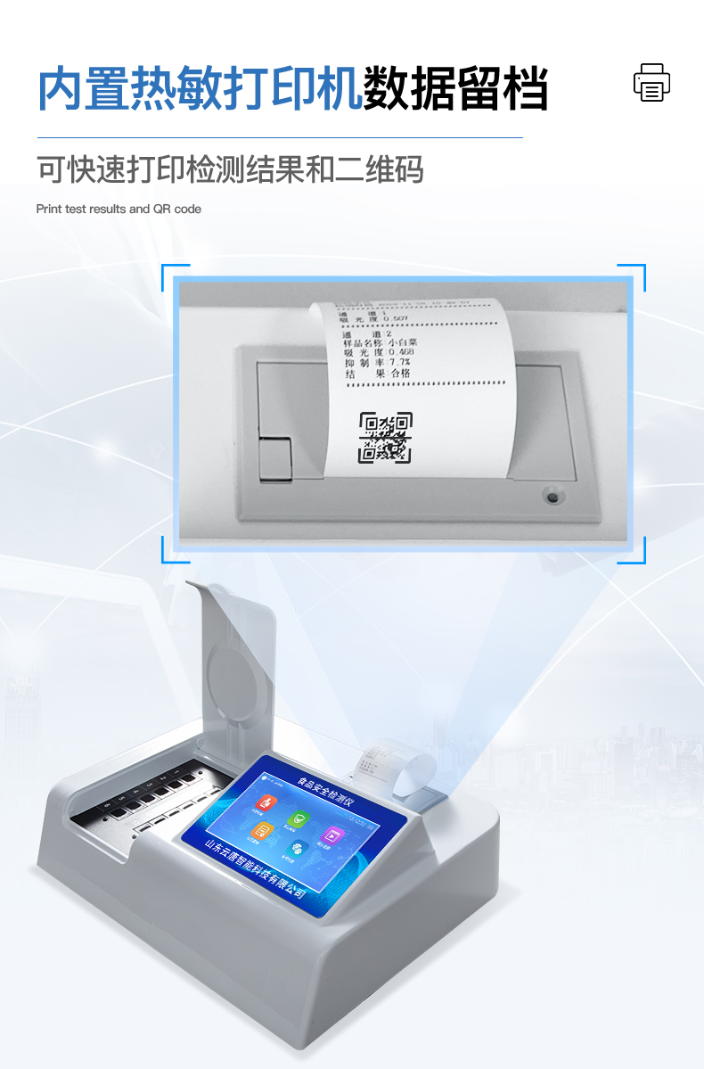 | 安卓智能操作系統,采用更加**和人性化操作,儀器具有網線連接、wifi聯網上傳、GPRS無線遠傳功能,快速上傳數據。 | 智能化程度高,儀器具有自檢功能:具有開機自檢和調零功能,具有自動檢測重復性功能。 | 檢測通道:≥12個檢測通道,可以同時測試多個樣品,每個樣品由程序控制分別獨立工作,不會互相干擾。 | 顯示方式:≥8英寸液晶觸摸屏顯示,人性化中文操作界面,讀數直觀、簡單。 | 配備新一代嵌入式熱敏打印機,可選擇手動打印或者自動打印,檢測完成可自動打印檢測報告和二維碼。 | 光源采用進口超高亮發光二極管,高精度、穩定性強、光源可控、可以關掉不使用的光源,功耗更低。 | 采用USB2.0接口設計,方便數據的存貯和移動,并可隨時與計算機直接相連,并且可用計算機控制儀器。實現數據查詢、瀏覽、分析、統計、打印等。 | 儀器帶有監管平臺。數據可局域網和互聯網數據上傳,檢測結果直接傳至食品安全監管平臺。進行區域食品安全監管及大數據分析處理,檢測區域食品安全長短期動態,達到食品安全問題預估、預警 | 一體化便攜式快檢設備,滿足現場及流動檢測使用需求,能夠在同一軟件下實現所有檢測項目的檢測,并可通過同一窗口直觀顯示檢測結果。 | 儀器具有多品類多種類樣品菜單庫,可靈活選擇檢測樣品,不同的檢測通道可同時檢測不同的樣品項目。也可在儀器上直接編輯錄入樣品名稱、檢測指標、送檢單位等信息并保存進樣品數據庫。 | 樣品處理簡單省力,整體操作快速、安全、便捷。 | 儀器具有自身保護功能,可設置用戶名及密碼,防止非工作人員操作等。 | 高靈敏度,高檢測精度,高重復性精度,掃描式高精度光學傳感器。 | 內置強大的數據庫,可在儀器上直接選擇樣品名稱、檢測指標、送檢單位等信息,也可在儀器上直接編輯錄入樣品名稱、檢測指標、送檢單位等信息并保存進樣品數據庫。 | 儀器具有重新校準、鎖定、恢復出廠設置功能。 | 支持U盤存儲。 結果判定線可修改,對照值標定值可保存,斷電不丟失數據。 |