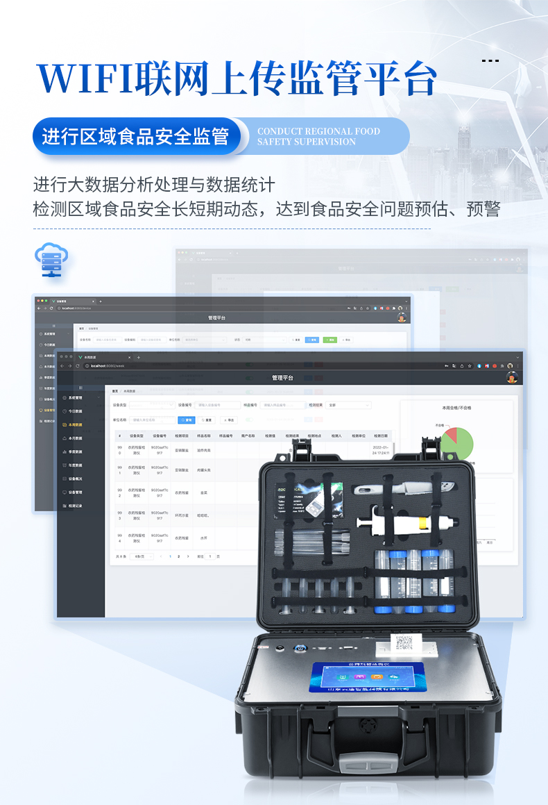 該多功能食品安全檢測儀為集成化食品安全快速檢測分析設備,廣泛應用于市場監管局、食品肉產品深加工企業、學校食堂、衛生部門、畜牧部門、屠宰場、檢驗檢疫部門等單位使用。