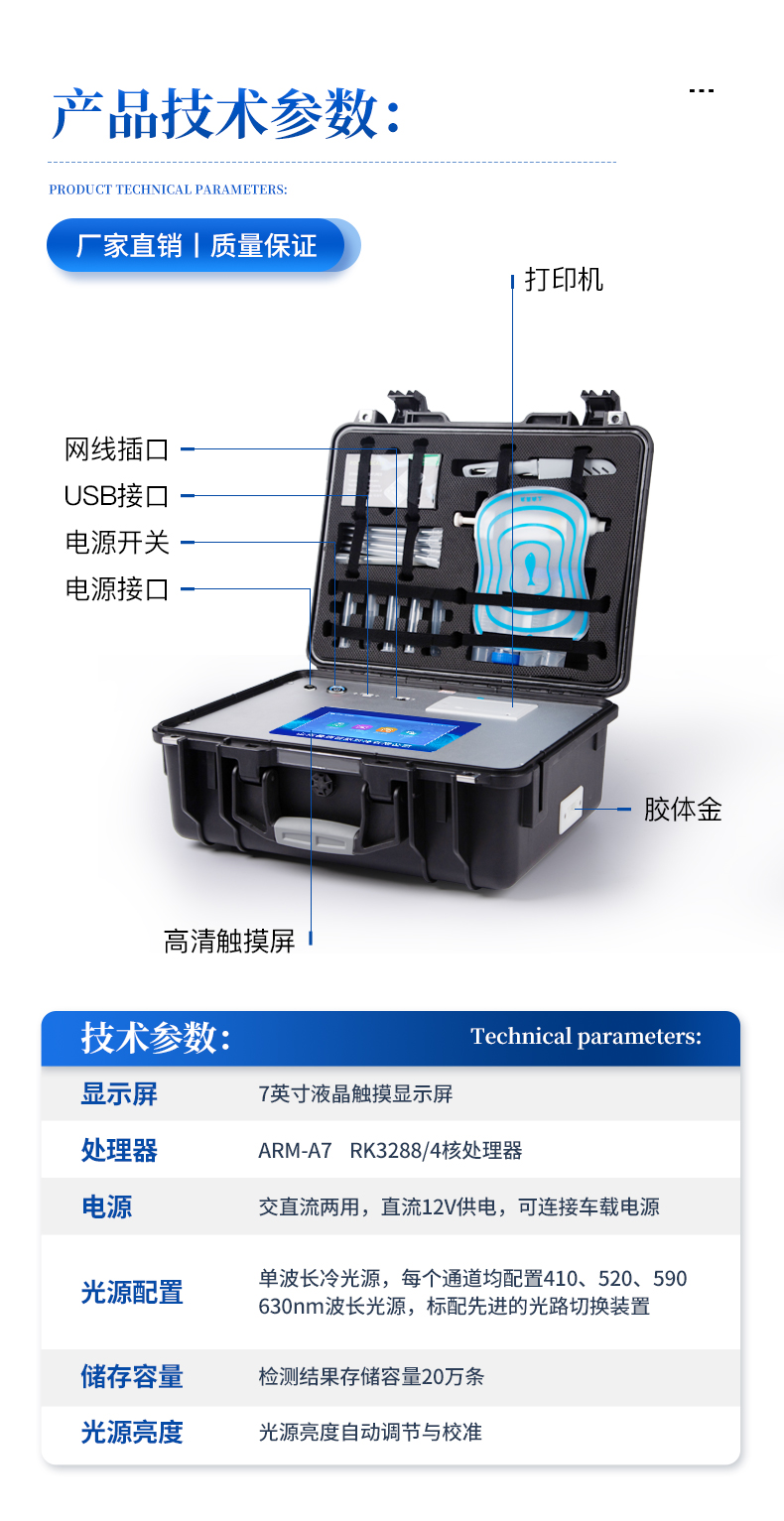 | 儀器采用手提式一體化系統檢測技術,將分光光度模塊、新型農殘檢測模塊、數字化管理模塊、無線通訊模塊高度集成于一體,支持檢測200種食品安全檢測項目,同時預留升級檢測方法。 | 儀器檢測模塊標準化、智能化,檢測項目可隨意自由組合。檢測箱體內置多個標準檢測單元,檢測模塊可以調整配置。 | 顯示屏幕:儀器采用10.1英寸豎向液晶觸摸屏顯,搭配運行安卓智能操作系統,主控芯片采用ARM Cortex-A7,RK3288/4核處理器,主頻1.88Ghz,操作方便,性能更強。 | 檢測通道:≥12通道;采用精密旋轉比色池設計,使用同芯片同光源校準精度,解決不同光源之間的誤差值,更加準確**。(1-12通道間誤差0.1%,***:**202022821055.2) | 儀器光源:高精度進口四波長冷光源,每個通道均配置 410、520、590、630nm 波長光源,標配**的光路切換裝置,專利光路切換功能可實現64波長,并且所有檢測項目可實現所有通道同時檢測。 | 設備可一鍵校準,自動保存校準數據,自動對比校驗,得到精準光源,采用Android SP存儲數據,光源數據永不丟失,方便每一次使用。 | 通訊接口:配備無線通信模塊、4G(APN)通訊模塊、藍牙傳輸,同時具有雙USB接口以及RJ45網線接口,可以多方式實現數據保存及數據傳輸 | 存儲方式:支持U盤存儲,標準USB接口,免驅動安裝。檢測結果存儲容量20萬條以上,可生成Excel表格進行拷貝,并具有登錄保護功能。 | 智能化操作系統: | 1)操作系統:儀器可在同一檢測界面自動對應相關檢測通道,一次性選擇1-12個樣品名稱,無需退出界面,節省操作時間。并可以對每個通道屬性和樣品信息單獨進行編輯,例如送檢單位、人員,檢測人員等,打印時勾選打印顯示。 | 2)數據集成系統:設備首頁自動匯總分析檢測數據,包含:周檢測數據、月檢測數據,全部檢測總數量,均包含檢測總數,合格數,不合格數,以及相關柱形分析圖,各項檢測數據一目了然,無需電腦查詢,更加快捷直觀。 | 3)數據庫系統:十幾項數據庫分類管理儀器:包含項目類型、項目數據、檢測數據、歷史記錄、國標信息、曲線信息、采樣信息、檢測信息、受檢信息、復核信息、圖表信息、光源校準信息、打印樣式信息、樣品庫信息等等,數據庫之間互相協調聯動保證數據的真實完整性。同時產品數據庫以及歷史檢測記錄支持一鍵檢索功能。 | 4)限量規判系統:具有限量查詢、添加物質合規判定系統。檢測出結果后,系統自動調用系統數據庫中相關國標進行比對判定,客觀顯示判定結果是否合格。 | 5)項目預設系統:儀器具有任務預設模塊,一鍵提前預設,給出方便快捷的新檢測方案,每一個任務分別可以設置不同的樣品、批次、編號、來源、備注、抽樣信息、檢測信息、受檢信息、復核信息等更多信息。樣品送檢時一鍵調取保存信息,并可多次調取,大大提高檢測效率。 | 6)數據監管系統:同步對接監管平臺,數據可局域網和互聯網數據上傳,檢測結果可選擇直接傳至食品安全監管平臺。進行區域食品安全監管及大數據分析處理與數據統計,檢測區域食品安全長短期動態,達到食品安全問題預估、預警。 | 7)打印系統:內置全新打印機,新創自定義打印方式,可按需靈活勾選控制:產品合格證(國家農業部標準要求),二維碼,抽樣信息、檢測信息,受檢信息、復核信息、抽樣日期、檢測日期等信息的打印。 | 供電模式:儀器交直流兩用,直流12V供電,可連接車載電源,可配6ah大容量充電鋰電池,電量可實時顯示,方便戶外流動測試。 | 膠體金檢測模塊:采用雙通道CMOS成像處理技術及膠體金免疫層析技術,可同時讀取雙膠體金卡數據,自動采集、處理分析,將檢測結果顯示,并可根據參考限值自動判斷檢測結果,可檢測常見的獸藥殘留、生物毒素、抗生素、違禁添加物等。 | 1)探測技術:CMOS成像探測; | 2)檢測通道:1個通道; | 3)檢測方式:消線法和比色法; | 4)顯示模式:陰性或陽性; | 5)曲線形式:軌道式掃描方式,顯示金標卡圖像,實時生成、識別CT曲線圖,無需手動調整,完成檢測后自動退出檢測卡。兼容市場上其他金標卡,使用耗材不受限制。 | 儀器加入遠程升級功能,可定向分客戶分儀器更新,開機后自動更新,客戶無需任何操作,即可升級全新項目。做到了無需退換機器即可實現實時遠程升級檢測儀器。 |