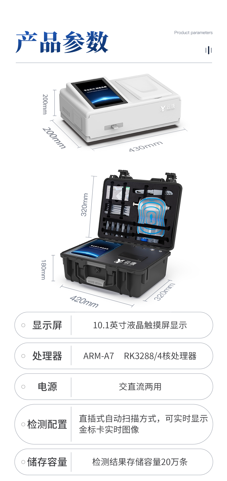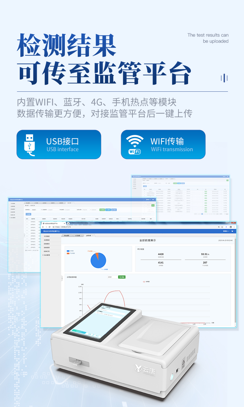 | 1、儀器采用臺式一體化系統(tǒng)檢測技術,將分光光度模塊、數(shù)字化管理模塊、無線通訊模塊高度集成于一體,支持檢測幾十種食品安全檢測項目,同時預留升級檢測方法。 | 2、儀器檢測模塊標準化、智能化,檢測項目可隨意自由組合。檢測箱體內置多個標準檢測單元,檢測模塊可以調整配置。 | 3、顯示屏幕:儀器采用7英寸液晶觸摸屏,搭配運行安卓智能操作系統(tǒng),主控芯片采用ARM Cortex-A7,RK3288/4核處理器,主頻1.88Ghz,操作方便,性能更強。 | 4、檢測通道:≥12通道;采用精密旋轉比色池設計,使用同芯片同光源校準精度,解決不同光源之間的誤差值,更加準確**。 | 5、儀器光源:高精度進口四波長冷光源,每個通道均配置 410、520、590、630nm 波長光源,標配**的光路切換裝置,專利光路切換功能可實現(xiàn)64波長,并且所有檢測項目可實現(xiàn)所有通道同時檢測。 | 6、通訊接口:配備無線通信模塊、可選配4G(APN)通訊模塊和藍牙傳輸,同時具有USB接口,可以多方式實現(xiàn)數(shù)據(jù)保存及數(shù)據(jù)傳輸。 | 7、存儲方式:支持U盤存儲,標準USB接口,免驅動安裝。檢測結果存儲容量20萬條以上,可生成Excel表格進行拷貝,并具有登錄保護功能。 | 8、智能化操作系統(tǒng) | 8.1、操作系統(tǒng):儀器可在同一檢測界面自動對應相關檢測通道,一次性選擇1-12個樣品名稱,無需退出界面,節(jié)省操作時間。并可以對每個通道屬性和樣品信息單獨進行編輯,例如送檢單位、人員,檢測人員等,打印時勾選打印顯示。 | 8.2、限量規(guī)判系統(tǒng):具有限量查詢、添加物質合規(guī)判定系統(tǒng)。檢測出結果后,系統(tǒng)自動調用系統(tǒng)數(shù)據(jù)庫中相關國標進行比對判定,客觀顯示結果是否合格。 | 8.3、數(shù)據(jù)監(jiān)管系統(tǒng):同步對接監(jiān)管平臺,數(shù)據(jù)可局域網(wǎng)和互聯(lián)網(wǎng)數(shù)據(jù)上傳,檢測結果可選擇直接傳至食品安全監(jiān)管平臺。進行區(qū)域食品安全監(jiān)管及大數(shù)據(jù)分析處理與數(shù)據(jù)統(tǒng)計,檢測區(qū)域食品安全長短期動態(tài),達到食品安全問題預估、預警。 | 8.4、打印系統(tǒng):內置全新打印機,可以打印:項目名稱,二維碼,抽樣信息、檢測信息,受檢信息、復核信息、抽樣日期、檢測日期等信息的打印。 | 9、供電模式:儀器交直流兩用,直流12V供電(標配),可連接車載電源,亦可選配6ah大容量充電鋰電池,電量可實時顯示,方便戶外流動測試。 | 10、儀器具有重新校準、鎖定、恢復出廠設置功能, | 11、外觀尺寸:415X310X150(mm) ,并可加配鋁合金手提箱 |