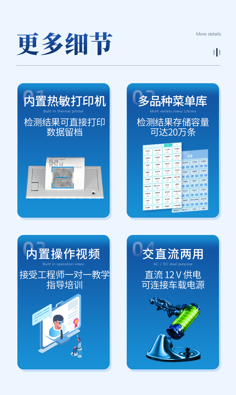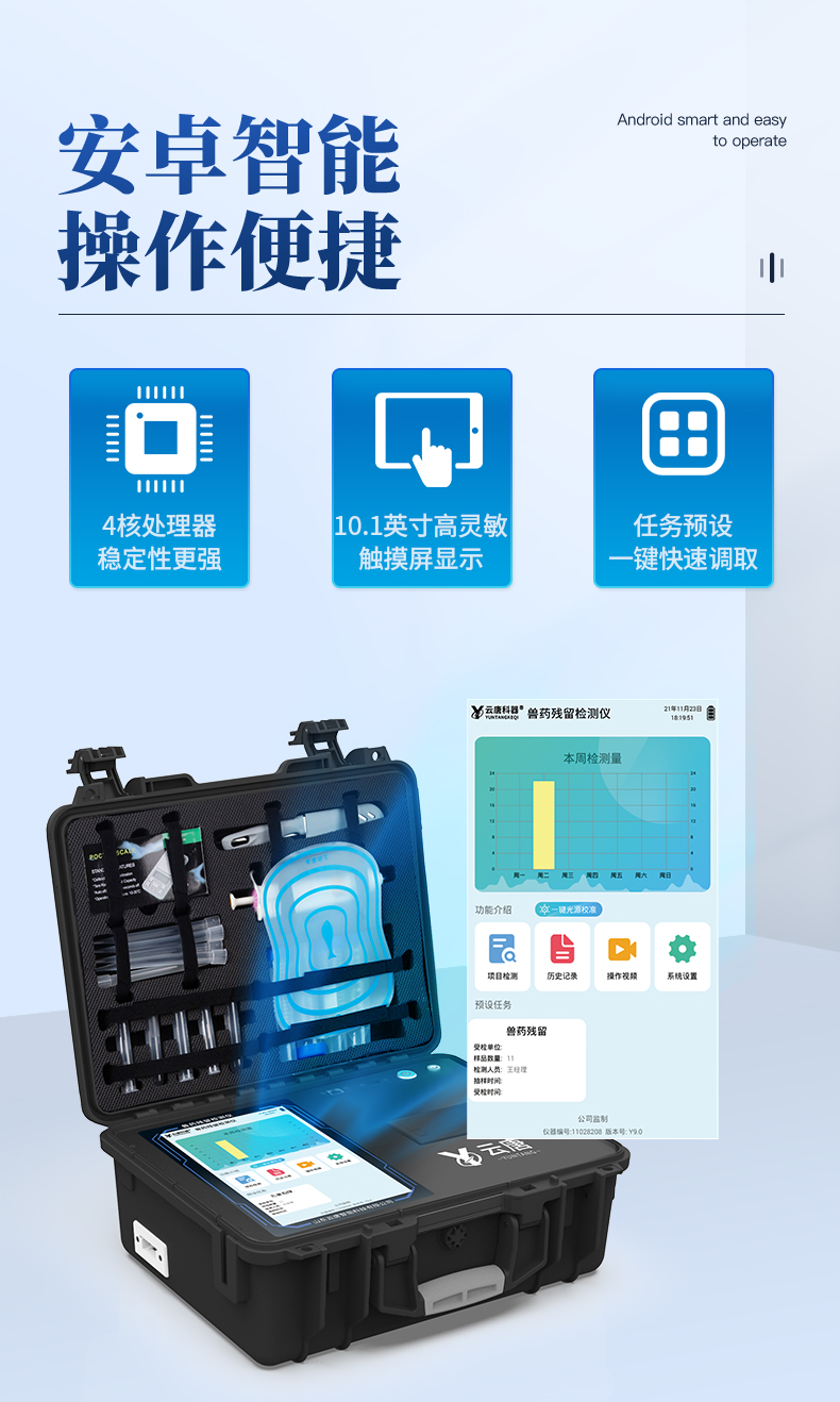 | 儀器采用手提一體化系統檢測技術,將分光光度模塊、數字化管理模塊、無線通訊模塊高度集成于一體,可支持檢測60種食品安全檢測項目,同時預留升級檢測方法。 | 儀器檢測模塊標準化、智能化,檢測項目可隨意自由組合。檢測箱體內置多個標準檢測單元,檢測模塊可以調整配置。 | 顯示屏幕:儀器采用10.1英寸豎向液晶觸摸屏顯,搭配運行安卓智能操作系統,主控芯片采用ARM Cortex-A7,RK3288/4核處理器,主頻1.88Ghz,操作方便,性能更強。 | 檢測通道:≥12通道;采用精密旋轉比色池設計,使用同芯片同光源校準精度,解決不同光源之間的誤差值,更加準確**。(1-12通道間誤差0.1%,***:**202022821055.2) | 儀器光源:高精度進口四波長冷光源,每個通道均配置 410、520、590、630nm 波長光源,標配**的光路切換裝置,專利光路切換功能可實現64波長,并且所有檢測項目可實現所有通道同時檢測。 | 設備可一鍵校準,自動保存校準數據,自動對比校驗,得到精準光源,采用Android SP存儲數據,光源數據永不丟失,方便每一次使用。 | 通訊接口:配備無線通信模塊、4G(APN)通訊模塊、藍牙傳輸,同時具有雙USB接口以及RJ45網線接口,可以多方式實現數據保存及數據傳輸。 | 存儲方式:支持U盤存儲,標準USB接口,免驅動安裝。檢測結果存儲容量20萬條以上,可生成Excel表格進行拷貝,并具有登錄保護功能。 | 智能化操作系統: | 1、操作系統:儀器可在同一檢測界面自動對應相關檢測通道,一次性選擇1-12個樣品名稱,無需退出界面,節省操作時間。并可以對每個通道屬性和樣品信息單獨進行編輯,例如送檢單位、人員,檢測人員等,打印時勾選打印顯示。 | 2、數據集成系統:設備首頁自動匯總分析檢測數據,包含:周檢測數據、月檢測數據,全部檢測總數量,均包含檢測總數,合格數,不合格數,以及相關柱形分析圖,各項檢測數據一目了然,無需電腦查詢,更加快捷直觀。 | 3、數據庫系統:十幾項數據庫分類管理儀器:包含項目類型、項目數據、檢測數據、歷史記錄、國標信息、曲線信息、采樣信息、檢測信息、受檢信息、復核信息、圖表信息、光源校準信息、打印樣式信息、樣品庫信息等等,數據庫之間互相協調聯動保證數據的真實完整性。同時產品數據庫以及歷史檢測記錄支持一鍵檢索功能。 | 4、限量規判系統:具有限量查詢、添加物質合規判定系統。檢測出結果后,系統自動調用系統數據庫中相關國標進行比對判定,客觀顯示判定結果是否合格。 | 5、項目預設系統:儀器具有任務預設模塊,一鍵提前預設,給出方便快捷的新檢測方案,每一個任務分別可以設置不同的樣品、批次、編號、來源、備注、抽樣信息、檢測信息、受檢信息、復核信息等更多信息。樣品送檢時一鍵調取保存信息,并可多次調取,大大提高檢測效率。 | 6、數據監管系統:同步對接監管平臺,數據可局域網和互聯網數據上傳,檢測結果可選擇直接傳至食品安全監管平臺。進行區域食品安全監管及大數據分析處理與數據統計,檢測區域食品安全長短期動態,達到食品安全問題預估、預警。 | 7.1、全新打印系統:內置全新打印機,新創自定義打印方式,可按需靈活勾選控制:二維碼,抽樣信息、檢測信息,受檢信息、復核信息、抽樣日期、檢測日期等信息的打印。 | 7.2、A4紙版本報告打印功能(可選配):設備擁有兩種結果展示方式,可以自動生成A4打印模板和小票打印模板兩種樣式,可通過WiFi及網線等方式鏈接外置打印機可進行打印。 | 供電模式:儀器交直流兩用,直流12V供電,可連接車載電源,可配6ah大容量充電鋰電池,電量可實時顯示,方便戶外流動測試。 | 儀器具備遠程升級功能,可定向分客戶分儀器更新,開機后自動更新,并可持續性免費更新系統版本,無需像傳統產品返廠更新,節省時間及人力成本并避免了物流運輸返廠升級導致設備損壞的潛在風險。 |