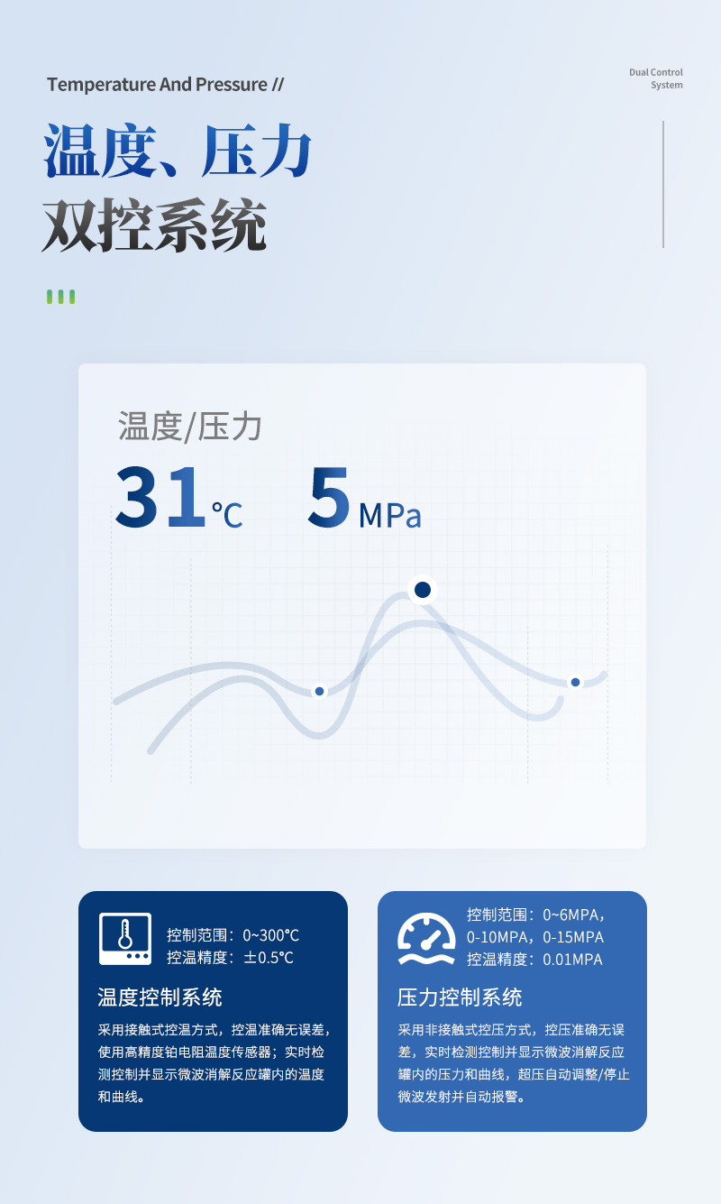 (1)溫度控制系統:采用接觸式控溫方式,控溫準確無誤差,使用高精度鉑電阻溫度傳感器;實時檢測控制并顯示微波消解反應罐內的溫度和曲線;(2)溫度控制范圍:0~300℃;控溫精度:±0.5℃;(3)控溫能力:速率升溫功能。(4)壓力控制系統:采用非接觸式控壓方式,控壓準確無誤差,是沿襲100年技術成熟的控壓方式。實時檢測控制并顯示微波消解反應罐內的壓力和曲線;(5)壓力控制范圍:范圍: 0~6MPa,0-10MPa.0-15MPa,任選。;控壓精度:0.01MPa;(6)壓力保護:超壓自動調整/停止微波發射并自動報警;
