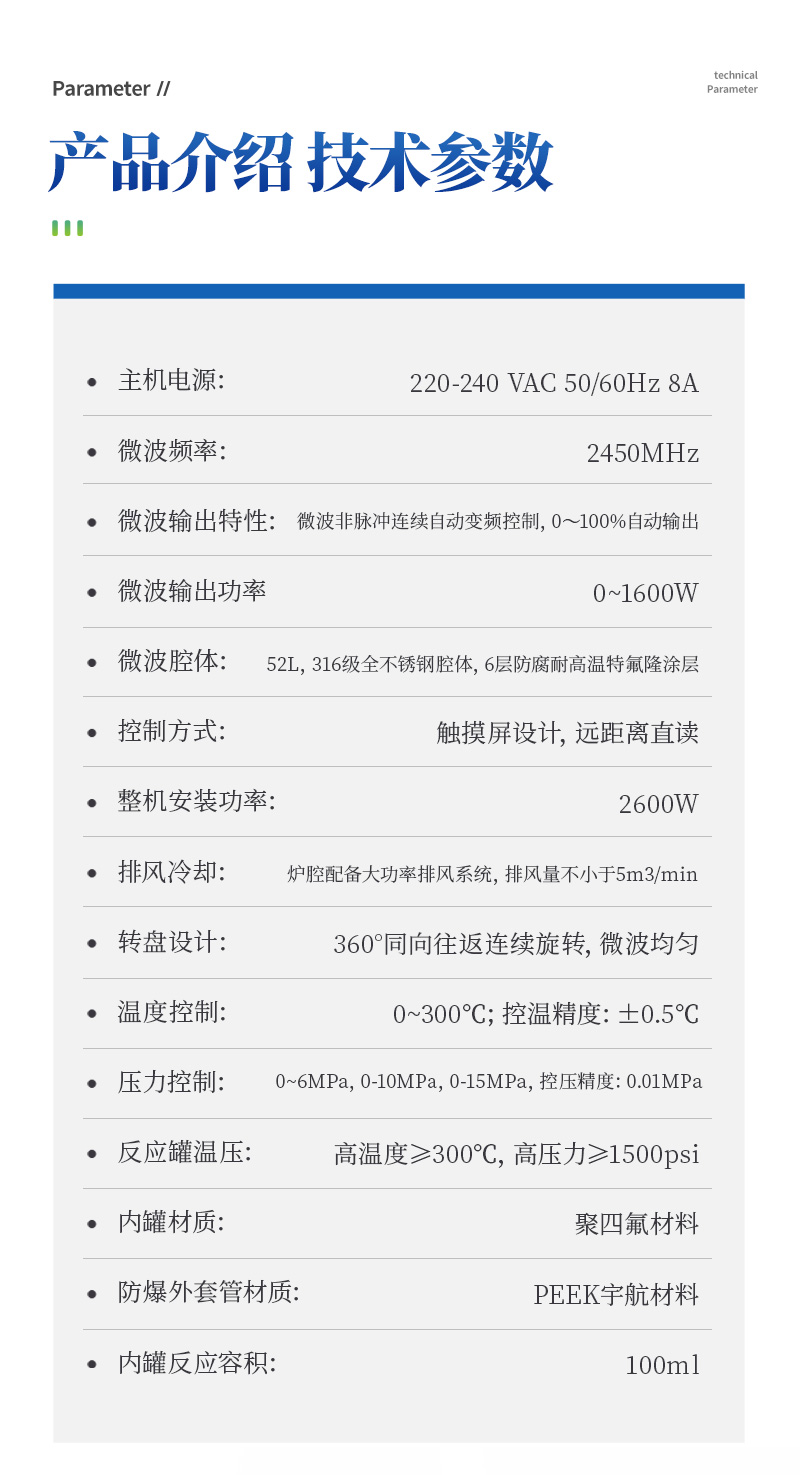 主機參數;1.1電 源:220-240 VAC 50/60Hz 8A ;微波頻率:2450MHz;整機安裝功率:2600W;(1)電源要求:220 VAC 50 Hz 15A;(2)微波源:(3)微波輸出功率 :0~1600W;(4)微波輸出特性:微波非脈沖連續自動變頻控制,0~100%自動輸出;(5)微波均勻性:垂直雙向波導設計,三維輸出技術,匹配諧波功頻實現了高度的場均勻性;(6)微波腔體:52L,316級全不銹鋼腔體,6層防腐耐高溫特氟隆涂層;(7)自鎖式緩沖防爆爐門,在危險出現時能自動提前釋放橫向壓力沖擊,確保操作人員人身安全和爐門結構  完整無損;(8)排風和冷卻系統:爐腔配備大功率排風系統,各種反應可在通風,安全和易于觀察的環境下長時間連續進行。爐腔通風采用耐酸蝕,大風量離心式風機,排風量不小于5m3/min;爐腔內具有風冷功能,持續為反應罐降溫,溫度和壓力實時顯示。(9)轉盤設計:360°同向往返連續旋轉,微波均勻,保證各個樣品微波環境相同,提高實驗結果的一致性。(10)控制方式:觸摸屏設計,8寸TFT-LED(800X480彩)大屏幕顯示,遠距離直讀反應進程,實時顯示密閉反應罐溫度、壓力,并可實時顯示溫壓曲線;(11)操作語言:中文簡體(12)自動保護功能:具有故障自檢系統;當控溫和控壓中某一系統失靈時,儀器會自動切斷微波發射,并且報警;
