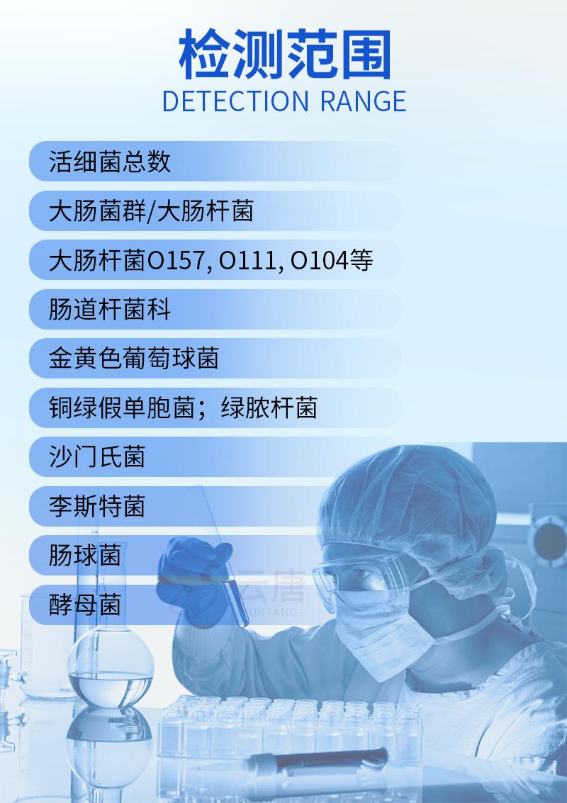 1. 食品:肉類、果蔬、奶制品、主食、調味料、飲料、半處理類食品以及飲料等,農產品及相關加工公司;2.水質:生活飲用水、自然界水源、制水廠;3. 表面:潔凈臺、餐具/ 器具表面;4. 其他:藥品、化妝品等;5. HACCP( 危害分析和關鍵控制點) 診斷,以及適用于災難現場、臨場、抽檢、大型會議等微生物安全快速檢測。