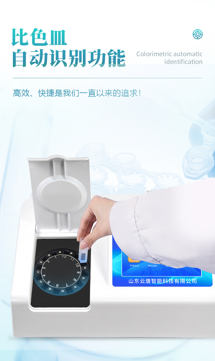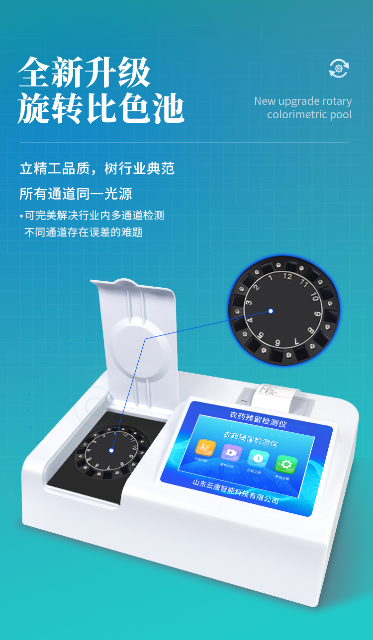 | 機(jī)器采用全新安卓智能系統(tǒng),主控芯片采用 ARM Cortex-A7,RK3288/4核處理器,主頻1.88Ghz,運(yùn)轉(zhuǎn)速度更快速,穩(wěn)定性更強(qiáng)。 | 創(chuàng)新檢測(cè)模式: *儀器采用精密旋轉(zhuǎn)比色池設(shè)計(jì),使用光源一致,可以解決各通道間由于光源誤差帶來(lái)的檢測(cè)結(jié)果誤差問(wèn)題,檢測(cè)結(jié)果更加精準(zhǔn)。 *儀器具有自動(dòng)識(shí)別比色皿檢測(cè)功能,即:將樣品比色皿放入儀器后,點(diǎn)擊樣品檢測(cè),儀器自動(dòng)識(shí)別比色皿進(jìn)行通道檢測(cè)。 | 供電方式:交直流兩用,直流 12V 供電,可連接車(chē)載電源,可配 6ah 大容量充電鋰電池,方便戶(hù)外流動(dòng)測(cè)試。 | 顯示方式:7英寸液晶觸摸屏顯示,人性化中文操作界面,讀數(shù)直觀、簡(jiǎn)單。 | 檢測(cè)通道:12個(gè)檢測(cè)通道,可以同時(shí)測(cè)試多個(gè)樣品,循環(huán)檢測(cè),即放即檢,每個(gè)樣品由程序控制分別獨(dú)立工作,不會(huì)互相干擾。 | 高精光源系統(tǒng): ①①儀器光源采用進(jìn)口超高亮發(fā)光二極管,光源亮度可以自動(dòng)調(diào)節(jié)與校準(zhǔn) ②智能恒流穩(wěn)壓,光強(qiáng)自動(dòng)校準(zhǔn),長(zhǎng)時(shí)間連續(xù)工作光源無(wú)溫漂現(xiàn)象。 | 智能操作分析系統(tǒng): ①儀器具有100多種蔬菜名稱(chēng)菜單庫(kù),分類(lèi)管理,并可按需添加或刪除、編輯蔬菜名稱(chēng);可在同一檢測(cè)界面自動(dòng)對(duì)應(yīng)相關(guān)檢測(cè)通道一次性選擇1-24個(gè)樣品名稱(chēng),無(wú)需退出界面,節(jié)省操作時(shí)間。 ②內(nèi)置新國(guó)家限量標(biāo)準(zhǔn),與所測(cè)結(jié)果進(jìn)行現(xiàn)場(chǎng)比對(duì),并持續(xù)更新標(biāo)準(zhǔn)。 | 完善的配套硬件: ①采用串口5v打印機(jī),可選擇手動(dòng)打印或者自動(dòng)打印,三分鐘出打印結(jié)果,打印格式為檢測(cè)人姓名、吸光度差值、檢測(cè)時(shí)間、檢測(cè)機(jī)構(gòu)、樣品名稱(chēng)及結(jié)果判定。 ②儀器具有無(wú)線上傳模塊,檢測(cè)結(jié)果可批量打印,批量上傳。 | 數(shù)據(jù)調(diào)用: ①儀器可存儲(chǔ)20萬(wàn)條檢測(cè)結(jié)果, ②檢測(cè)結(jié)果為Excel表格,方便后期進(jìn)行數(shù)據(jù)分析與匯總報(bào)告 ③儀器采用USB2.0接口設(shè)計(jì),支持 U 盤(pán)存儲(chǔ),方便數(shù)據(jù)的存貯和移動(dòng),并可隨時(shí)與計(jì)算機(jī)直接相連,實(shí)現(xiàn)數(shù)據(jù)查詢(xún)、瀏覽、分析、統(tǒng)計(jì)、打印等。 | 后期產(chǎn)品固件可升級(jí)。 | 安全證書(shū),放心保障:儀器具有中國(guó)計(jì)量科學(xué)研究院校準(zhǔn)證書(shū),權(quán)威認(rèn)證,使用放心。 |
