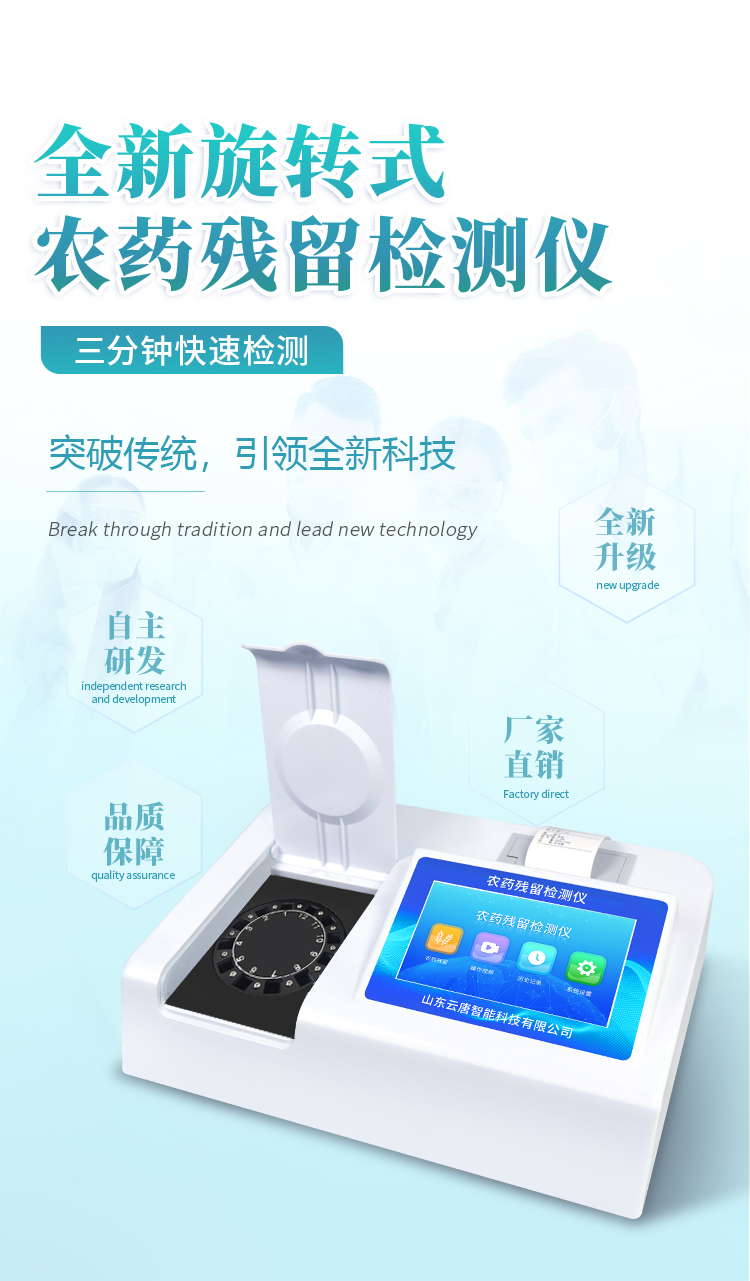 山東云唐智能科技有限公司生產(chǎn)的農(nóng)藥殘留檢測(cè)儀廣泛應(yīng)用于主要用于蔬菜、水果、茶葉、糧食、農(nóng)副產(chǎn)品等食品中農(nóng)藥殘留的快速檢測(cè),依據(jù)國(guó)標(biāo)GB/T5009.199-2003進(jìn)行檢測(cè),適用于果蔬茶生產(chǎn)基地以及農(nóng)貿(mào)批發(fā)銷(xiāo)售市場(chǎng)現(xiàn)場(chǎng)檢測(cè),餐館、學(xué)校、食堂、家庭果蔬加工前的安全速測(cè)等。