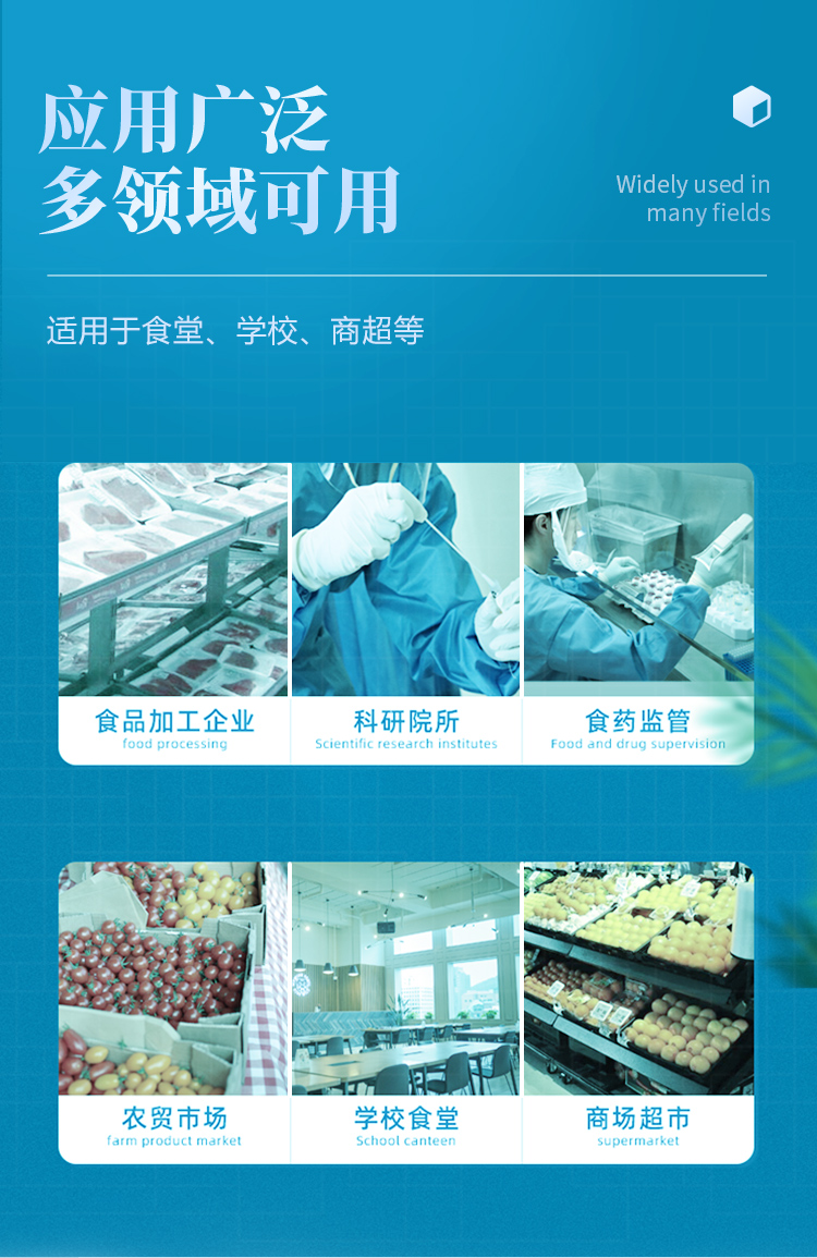 | 安卓智能操作系統(tǒng),采用更加**和人性化操作,儀器具有無(wú)線聯(lián)網(wǎng)上傳功能,快速上傳數(shù)據(jù),進(jìn)行數(shù)據(jù)統(tǒng)計(jì)和分析。 | 智能化程度高,儀器具有自檢功能:具有開(kāi)機(jī)自檢和調(diào)零功能,具有自動(dòng)檢測(cè)重復(fù)性功能;同時(shí),檢測(cè)完成可自動(dòng)打印檢測(cè)報(bào)告和二維碼。手機(jī)掃碼可顯示出詳細(xì)檢測(cè)信息。 | 儀器帶有監(jiān)管平臺(tái),數(shù)據(jù)可局域網(wǎng)和互聯(lián)網(wǎng)數(shù)據(jù)上傳,檢測(cè)結(jié)果直接傳至食品安全監(jiān)管平臺(tái)。進(jìn)行區(qū)域食品安全監(jiān)管及大數(shù)據(jù)分析處理與數(shù)據(jù)統(tǒng)計(jì),檢測(cè)區(qū)域食品安全長(zhǎng)短期動(dòng)態(tài),達(dá)到食品安全問(wèn)題預(yù)估、預(yù)警 。 | 樣品處理簡(jiǎn)單省力,整體操作快速、安全、便捷。 | 儀器具有自身保護(hù)功能,可設(shè)置用戶(hù)名及密碼,防止非工作人員操作等。 | 內(nèi)置強(qiáng)大的數(shù)據(jù)庫(kù),可在儀器上直接選擇樣品名稱(chēng)、檢測(cè)指標(biāo)、送檢單位等信息,也可在儀器上直接編輯錄入樣品名稱(chēng)、檢測(cè)指標(biāo)、送檢單位等信息并保存進(jìn)樣品數(shù)據(jù)庫(kù),方便后期操作調(diào)取使用。 | 儀器具有重新校準(zhǔn)、鎖定、恢復(fù)出廠設(shè)置功能。 |