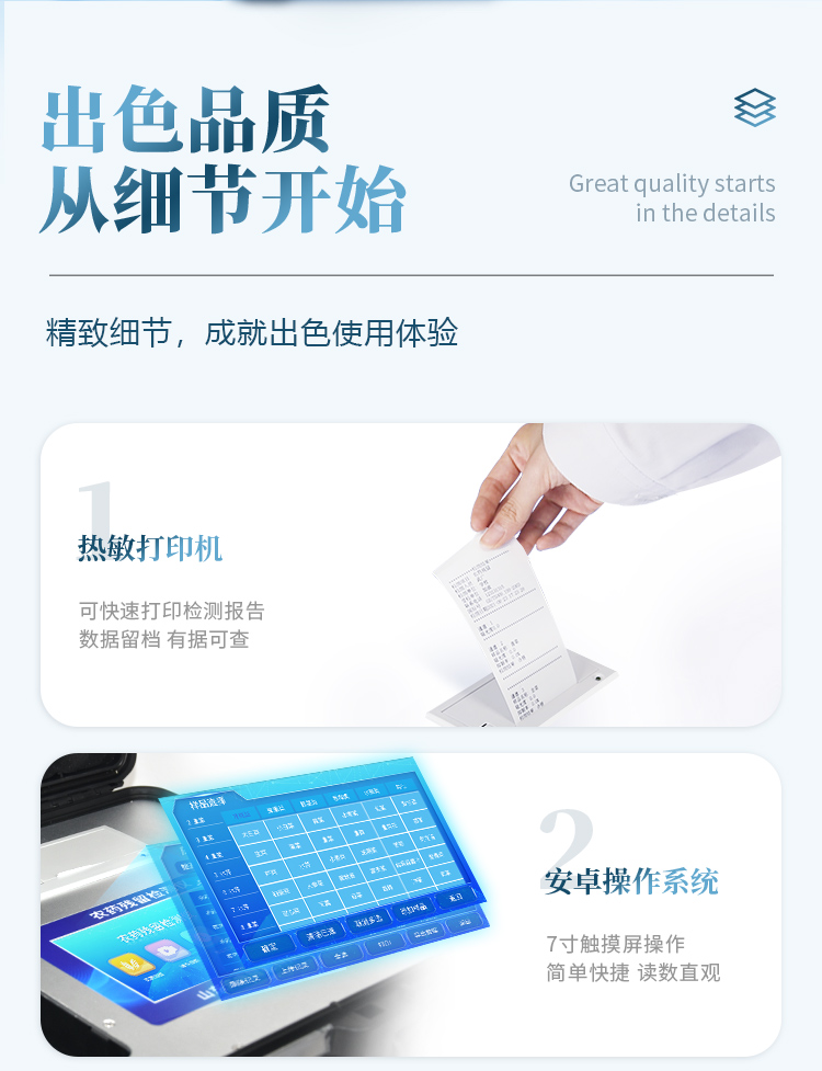 安卓智能操作系統(tǒng),采用更加**和人性化操作,儀器具有無線聯(lián)網(wǎng)上傳功能,快速上傳數(shù)據(jù),進(jìn)行數(shù)據(jù)統(tǒng)計和分析。智能化程度高,儀器具有自檢功能:具有開機(jī)自檢和調(diào)零功能,具有自動檢測重復(fù)性功能;同時,檢測完成可自動打印檢測報告和二維碼。手機(jī)掃碼可顯示出詳細(xì)檢測信息。儀器帶有監(jiān)管平臺,數(shù)據(jù)可局域網(wǎng)和互聯(lián)網(wǎng)數(shù)據(jù)上傳,檢測結(jié)果直接傳至食品安全監(jiān)管平臺。進(jìn)行區(qū)域食品安全監(jiān)管及大數(shù)據(jù)分析處理與數(shù)據(jù)統(tǒng)計,檢測區(qū)域食品安全長短期動態(tài),達(dá)到食品安全問題預(yù)估、預(yù)警 。樣品處理簡單省力,整體操作快速、安全、便捷。儀器具有自身保護(hù)功能,可設(shè)置用戶名及密碼,防止非工作人員操作等。內(nèi)置強(qiáng)大的數(shù)據(jù)庫,可在儀器上直接選擇樣品名稱、檢測指標(biāo)、送檢單位等信息,也可在儀器上直接編輯錄入樣品名稱、檢測指標(biāo)、送檢單位等信息并保存進(jìn)樣品數(shù)據(jù)庫,方便后期操作調(diào)取使用。儀器具有重新校準(zhǔn)、鎖定、恢復(fù)出廠設(shè)置功能。